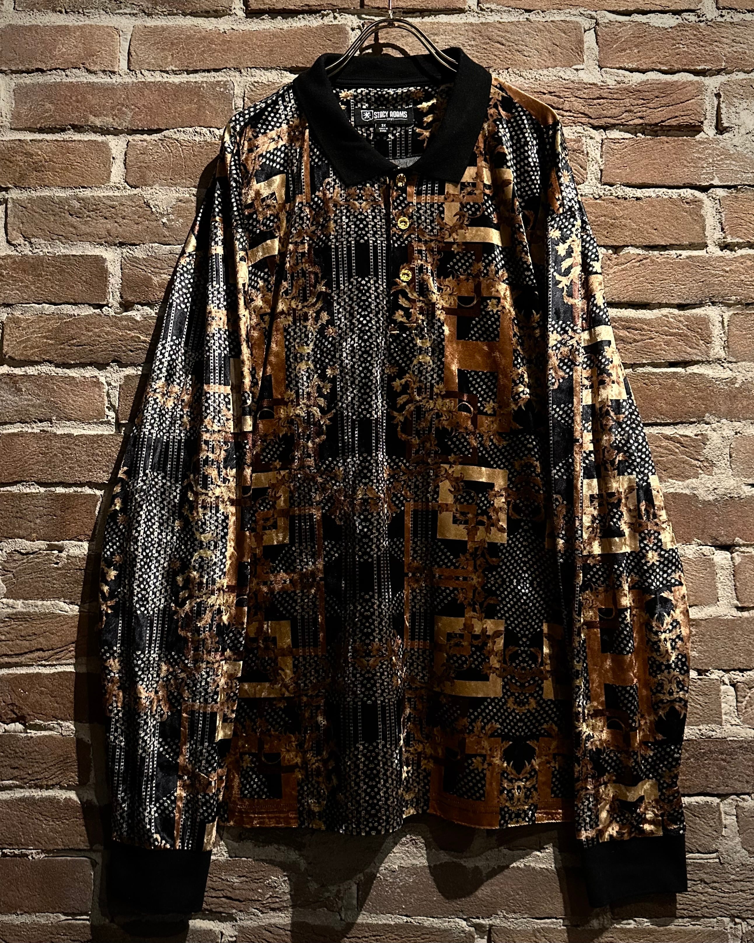 ポロカラー仕様の首元に加え、フロントのボタンディテールがクラシカルな印象をプラス。柄のインパクトがありながらも、全体としてはバランスの取れたデザインで、一枚でスタイリングの主役を担う存在感に仕上がっています。