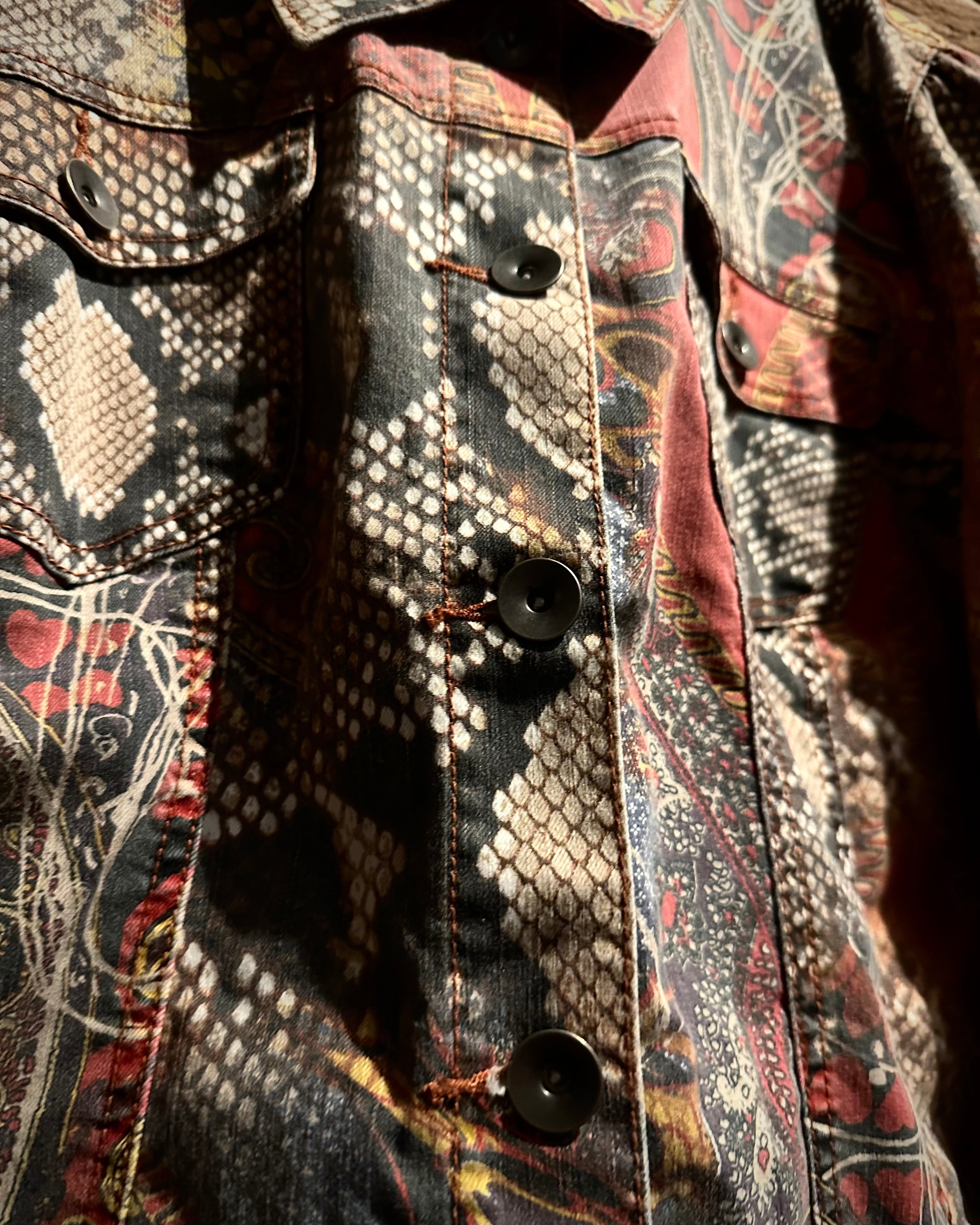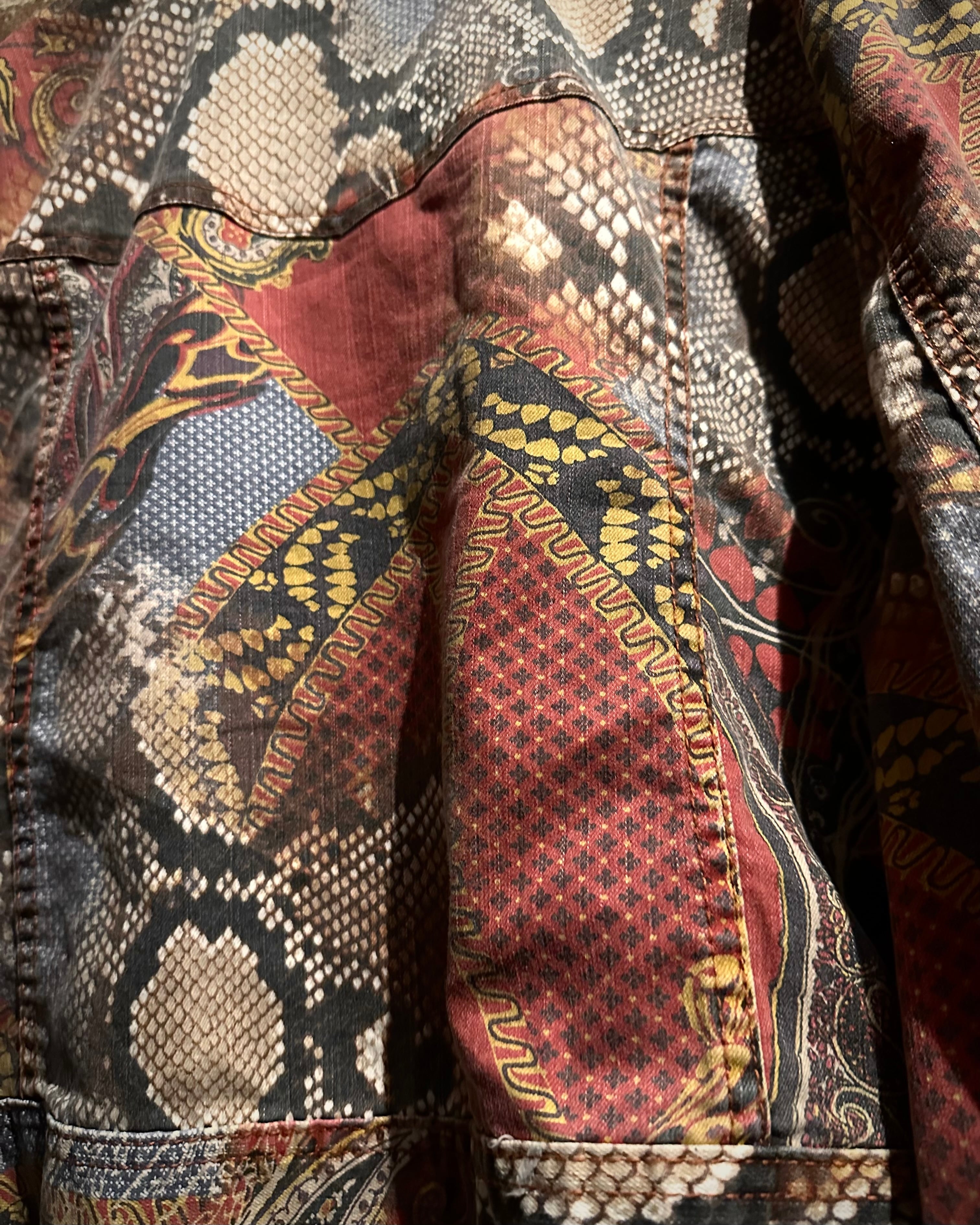 パイソン、ペイズリーなど、様々な柄を組み合わせた、アーティスティックな存在感を見せるトラッカージャケット。