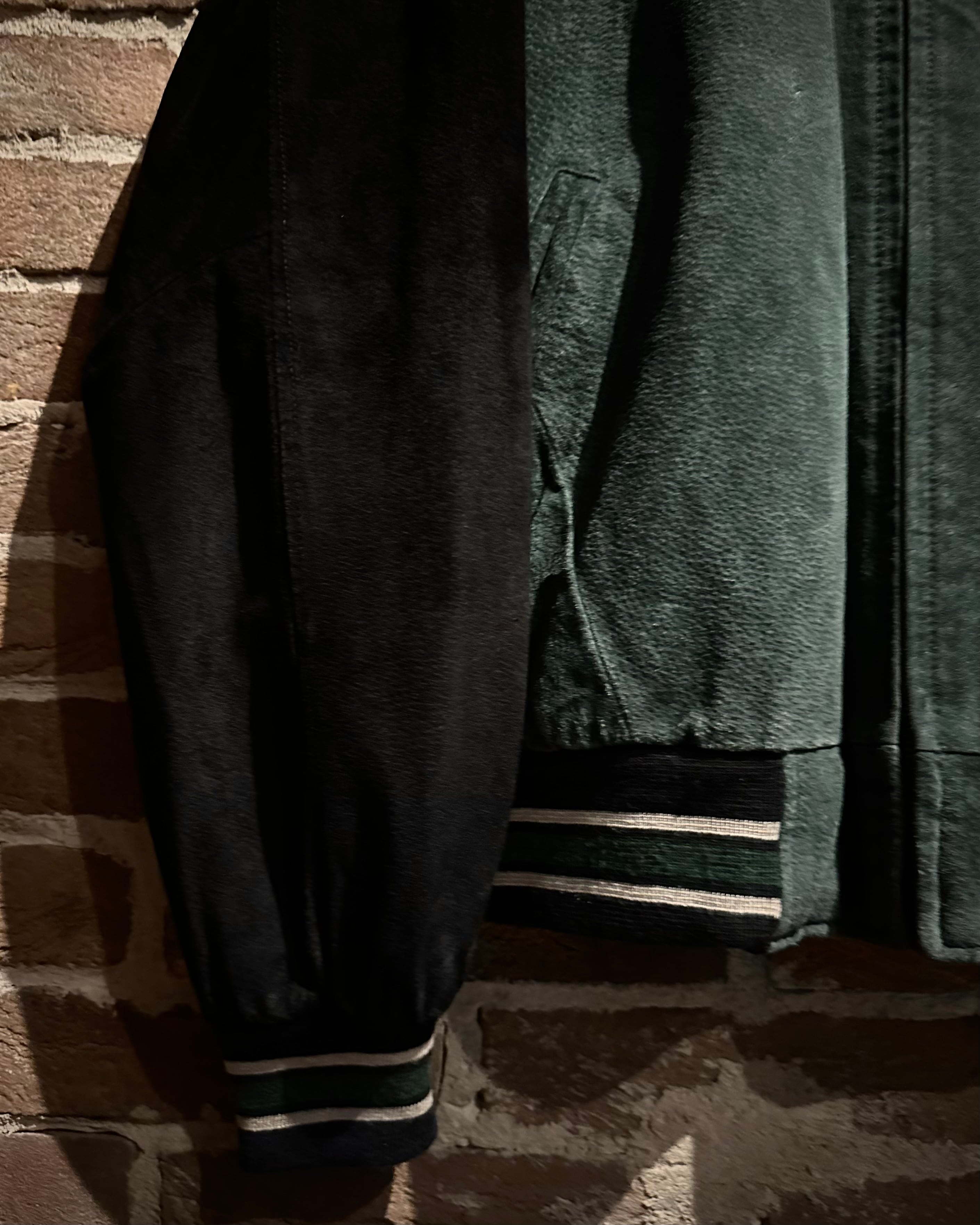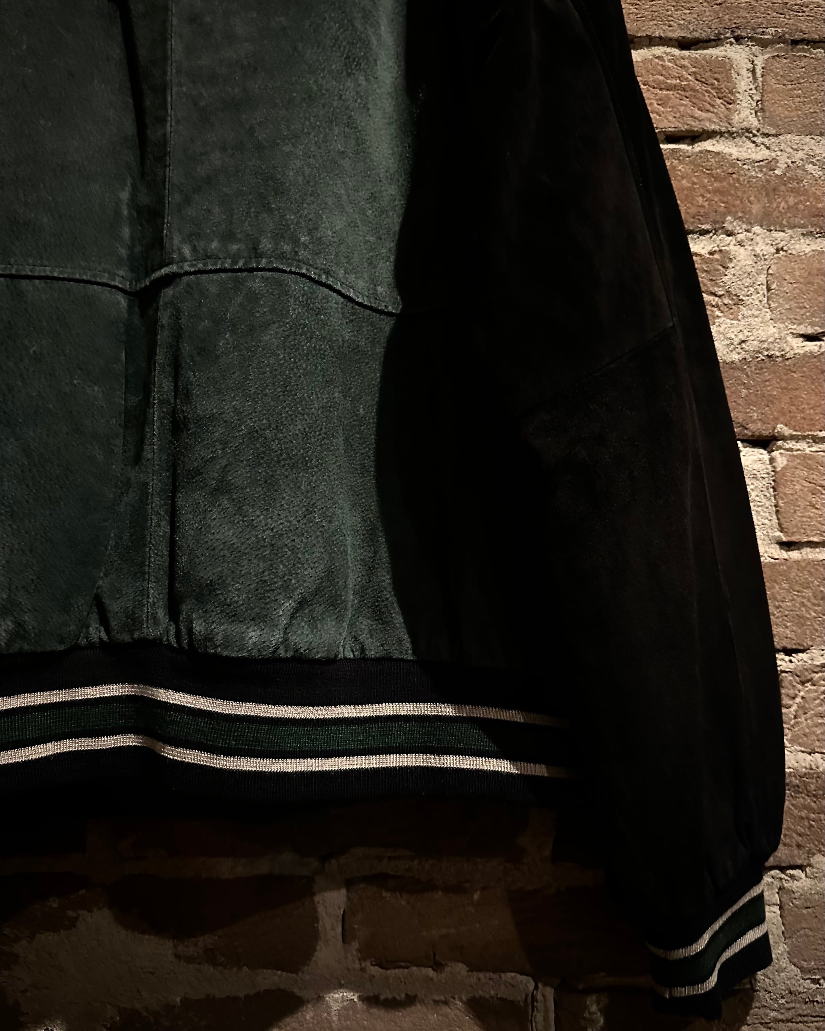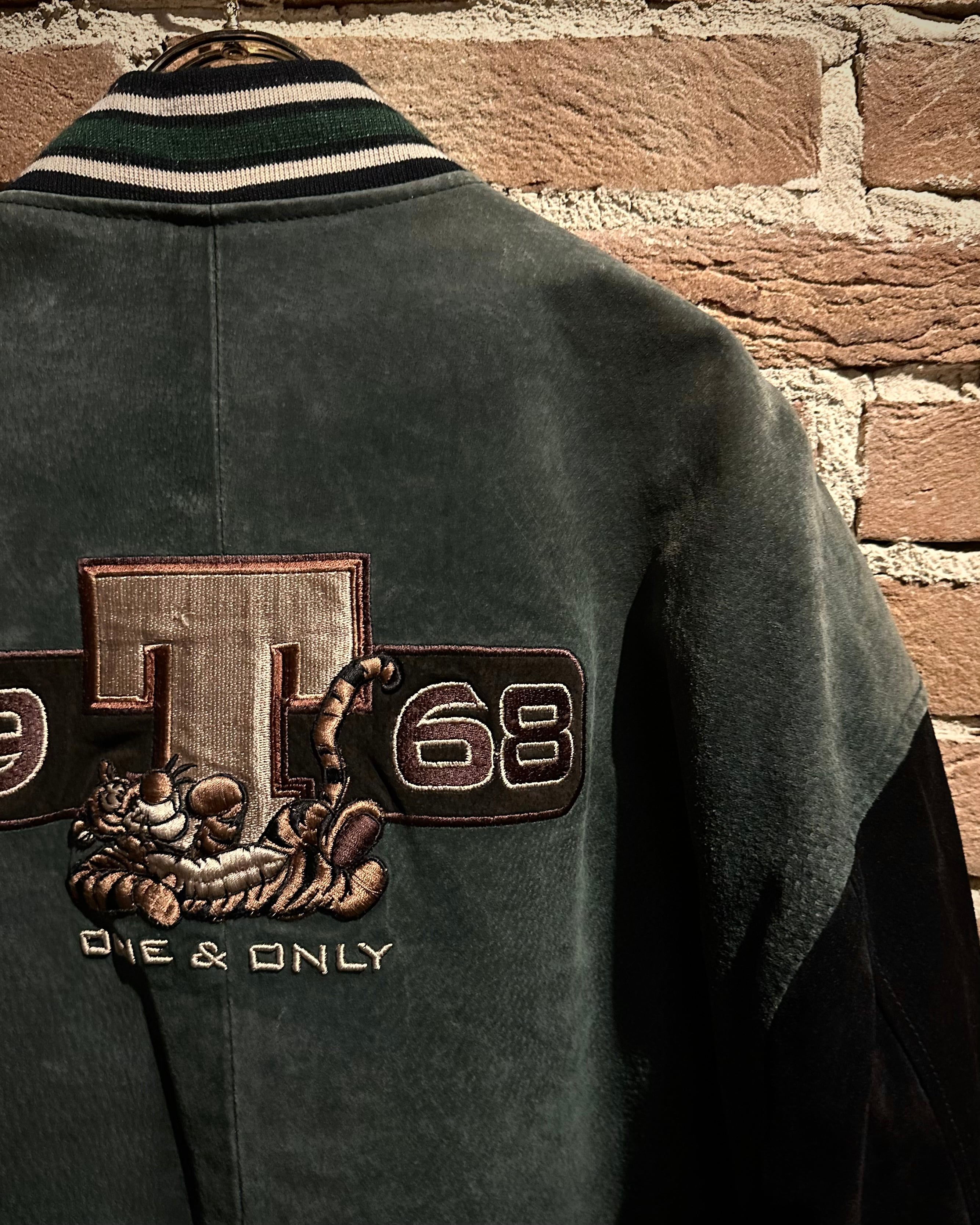 しっとりとしなやかな黒×緑のスエードレザーをボディに用い、フロント&バックにくまのプーさんのキャラクター"ティガー"のワッペンが施された、オフィシャルモノのスエードスタジャン。