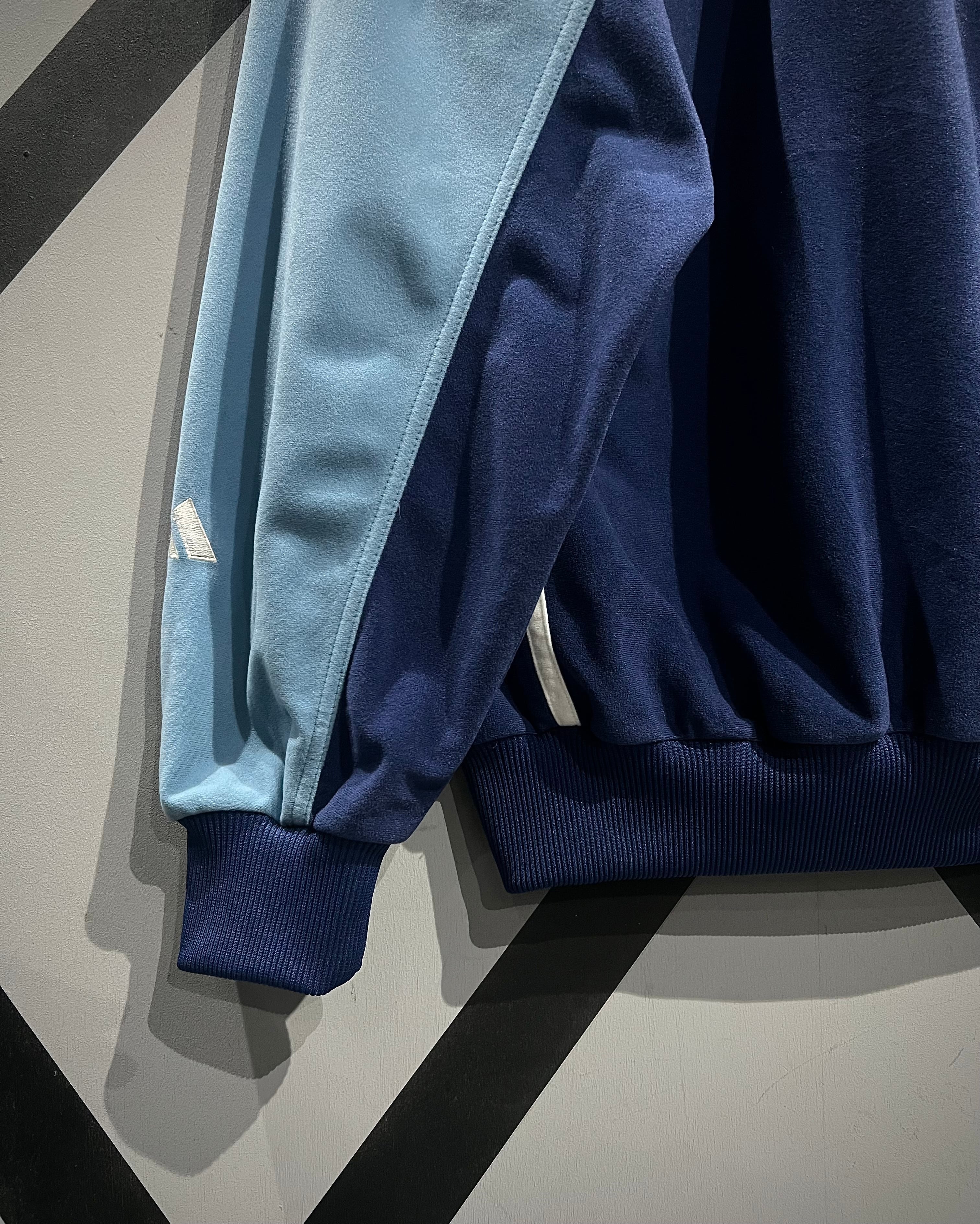 スペインの名門クラブ、レアル・マドリードの1着。ネイビー×ライトブルーの切り替えに、アイコニックな3ストライプス、胸元にはadidasロゴとクラブエンブレム。さらにスポンサーのロゴが配置され、サッカーモノならではのデザイン性の高さを誇ります。