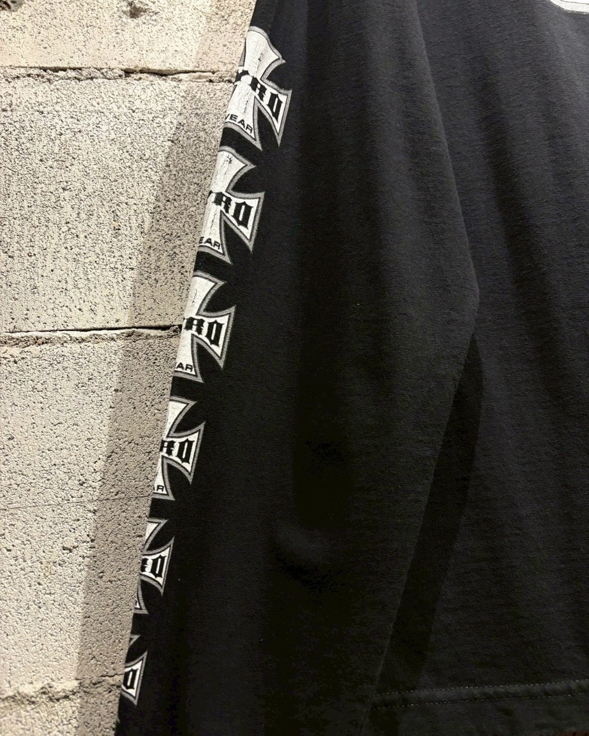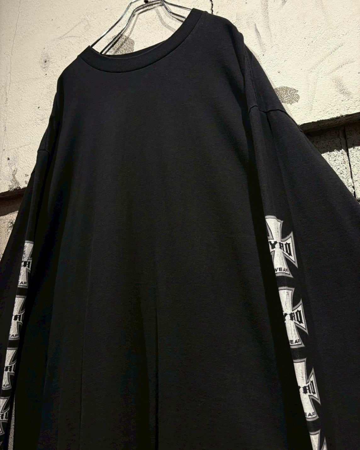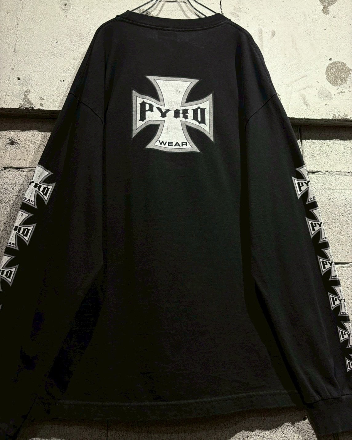 アメリカンストリートの空気感を色濃く反映した“PYRO WEAR”より、アイアンクロスのプリントを施した90’sのロングスリーブTシャツ。
