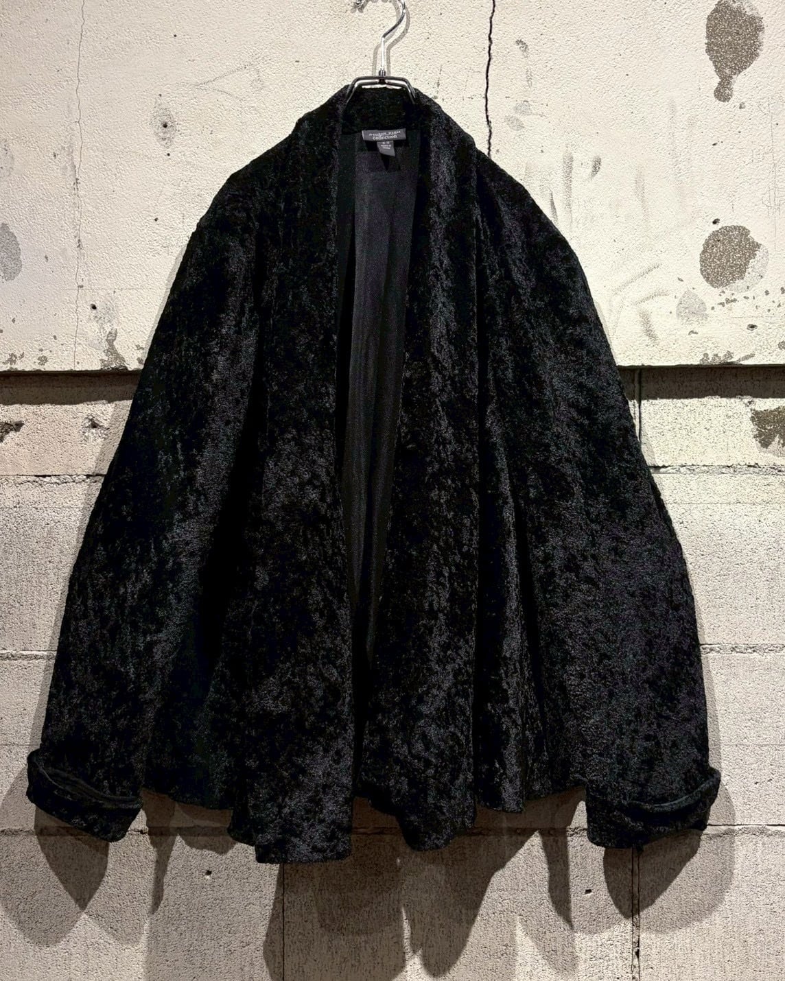 この手のベロアガウンでは珍しいルーズなサイズ感もポイント。身幅をしっかりと取ったシルエットにより、動く度に生まれるドレープが非常に美しく、エレガントさとリラックス感を両立しています。