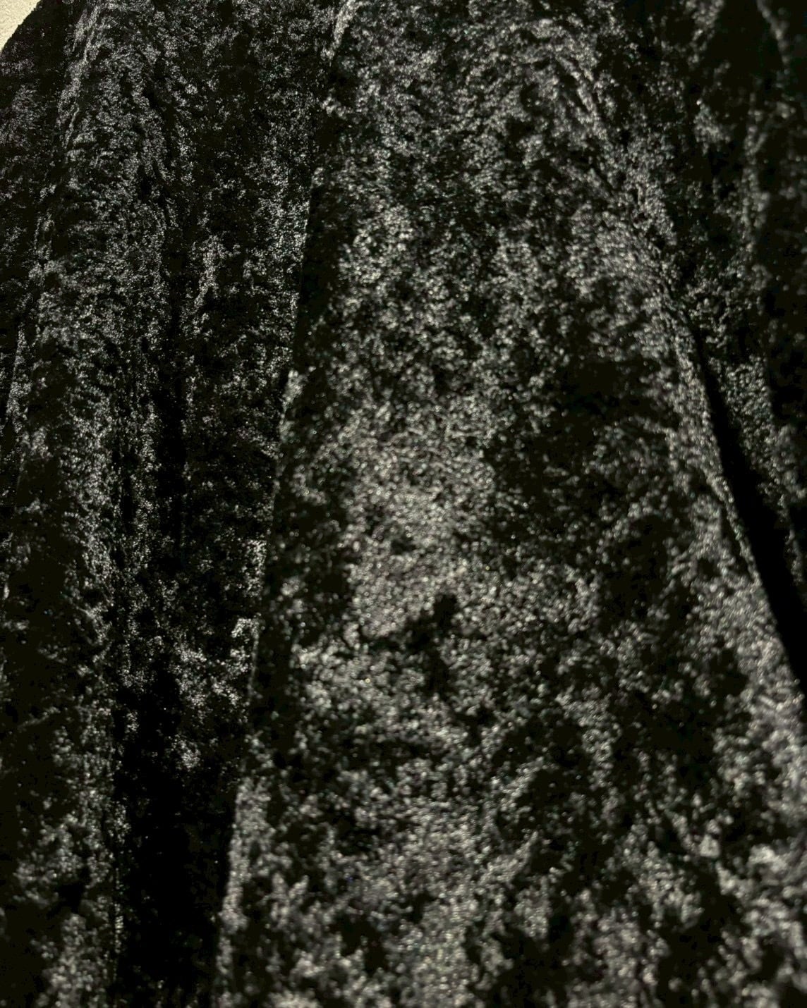 光沢を帯びた独特な表情を見せるブラックのクラッシュベロアをボディに使用した、ラグジュアリーな空気感を纏うベロアガウン。