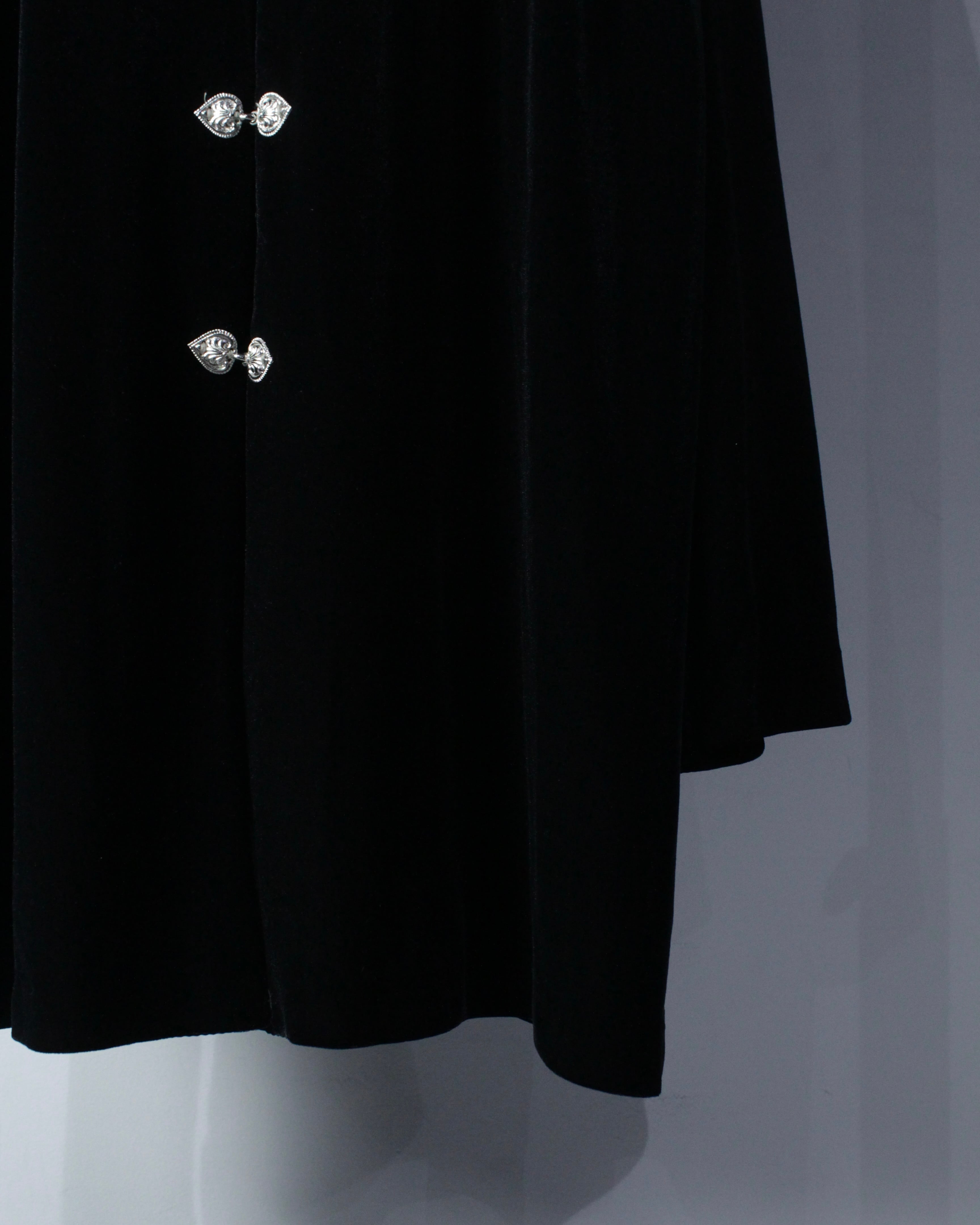 しっとりとした質感のベロアは、光の当たり方によって陰影が生まれ、奥行きのある表情に。柔らかく流れるようなドレープが美しく、シンプルながらも存在感を放つ1着に仕上がっています。