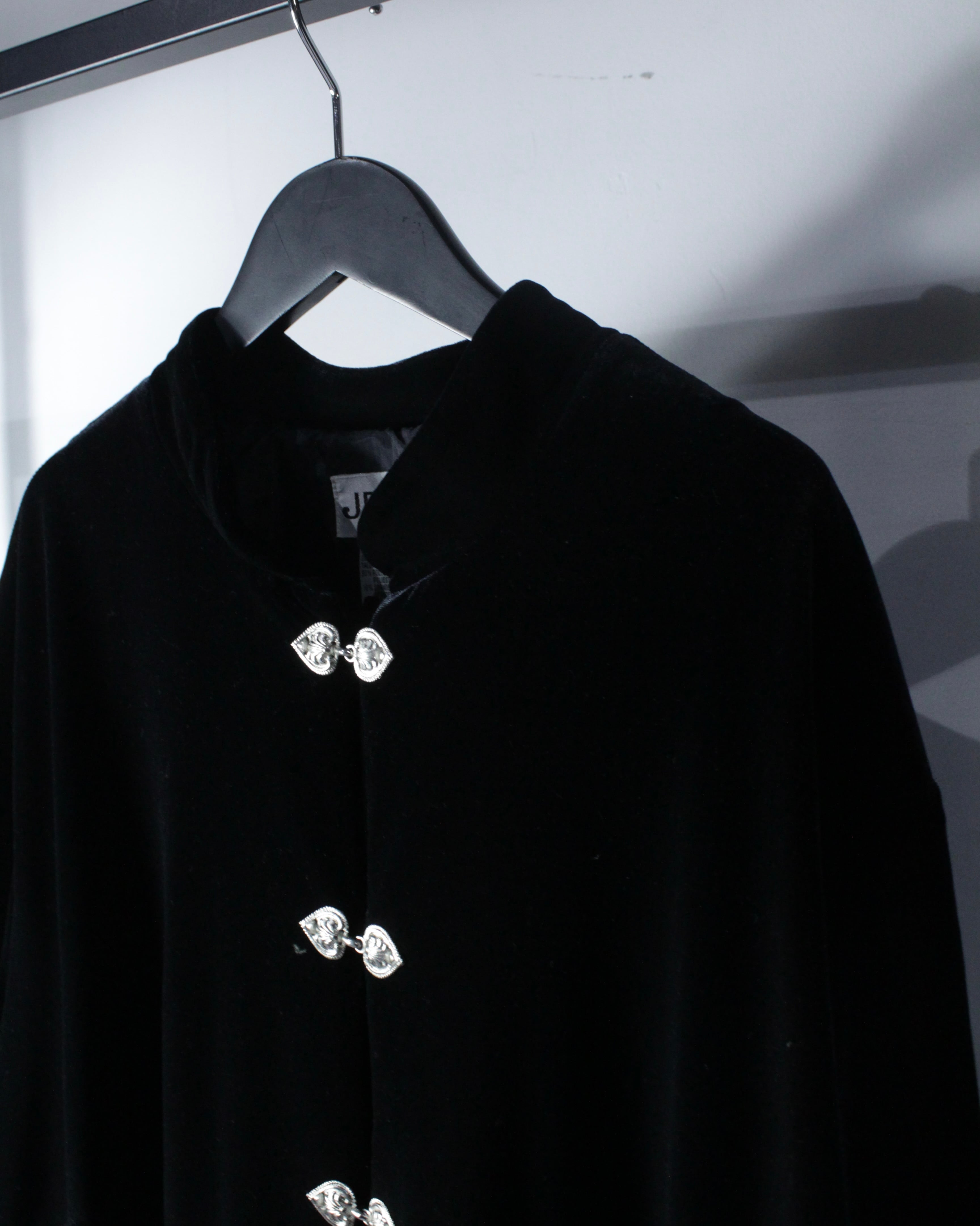 フロントにはメタルパーツのチャイナボタンを配置。ミニマルなブラックボディに対してシルバーの輝きがアクセントとなり、オリエンタルなムードとモードな空気感を両立したデザインに。