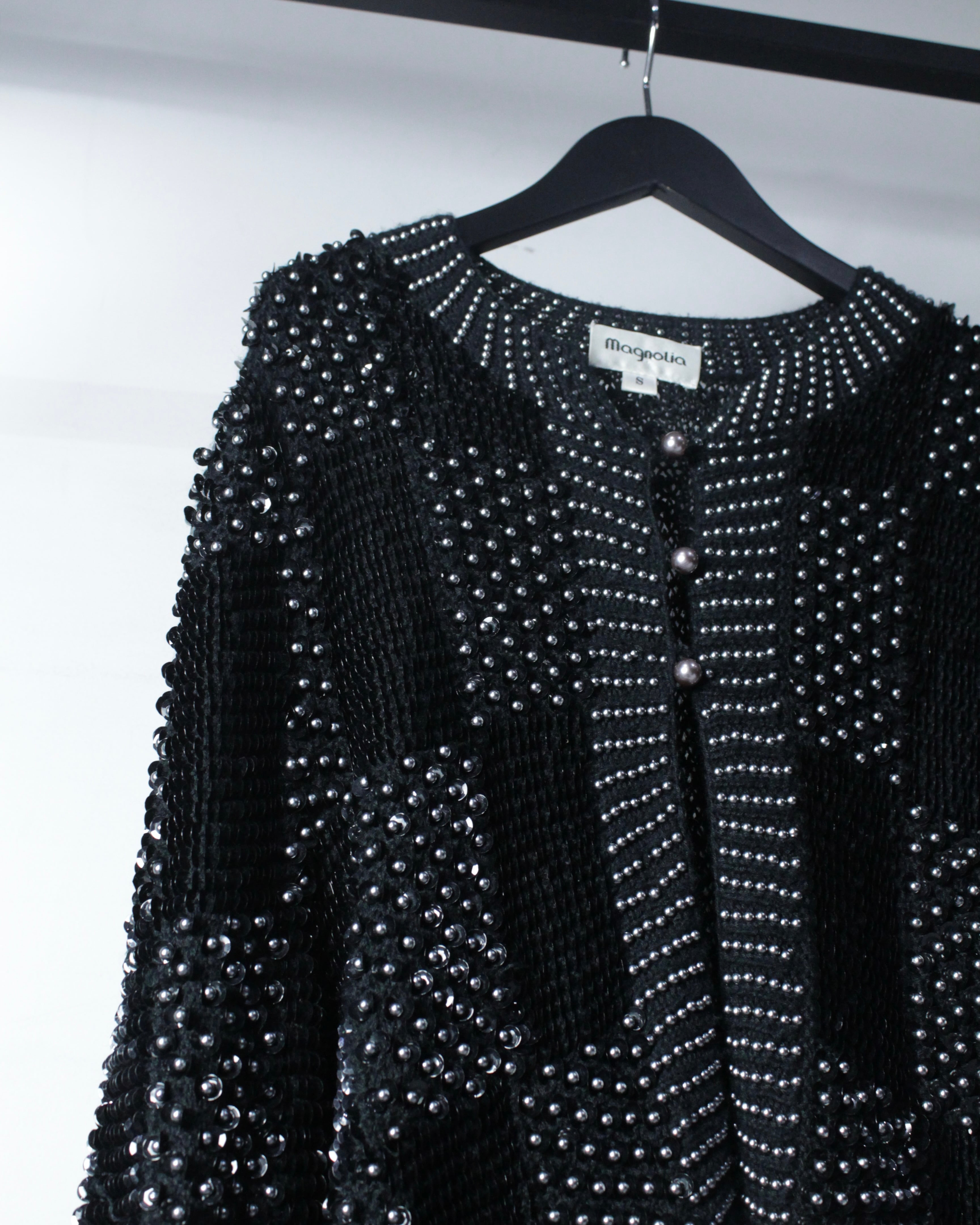 細かなパーツ一つ一つが光を拾い、動きや角度によって煌びやかな表情を見せ、モードかつラグジュアリーな雰囲気を纏う1着に仕上げられています。フロントにはパールのループボタンを採用し、細部まで統一感のある高級感のある仕様に。