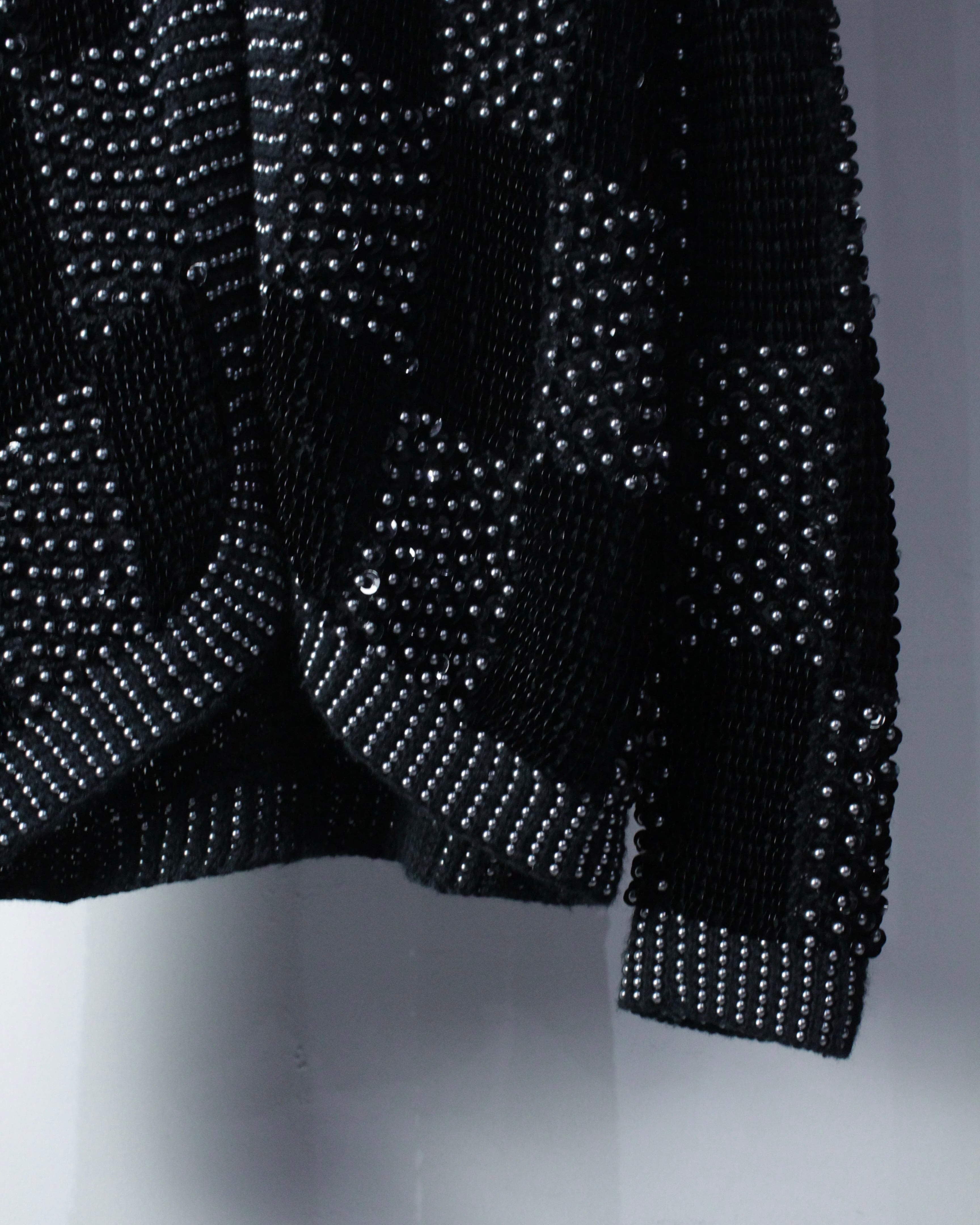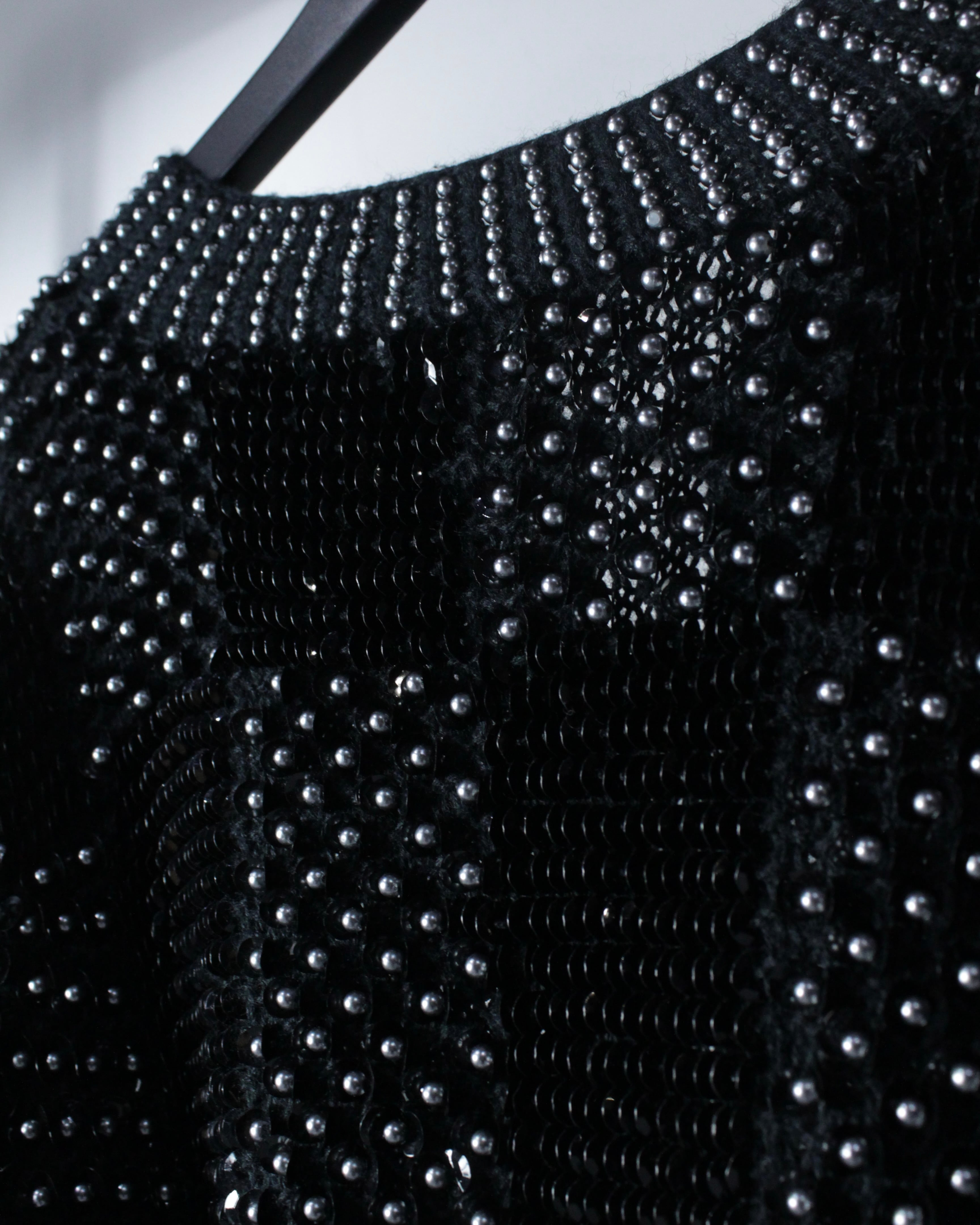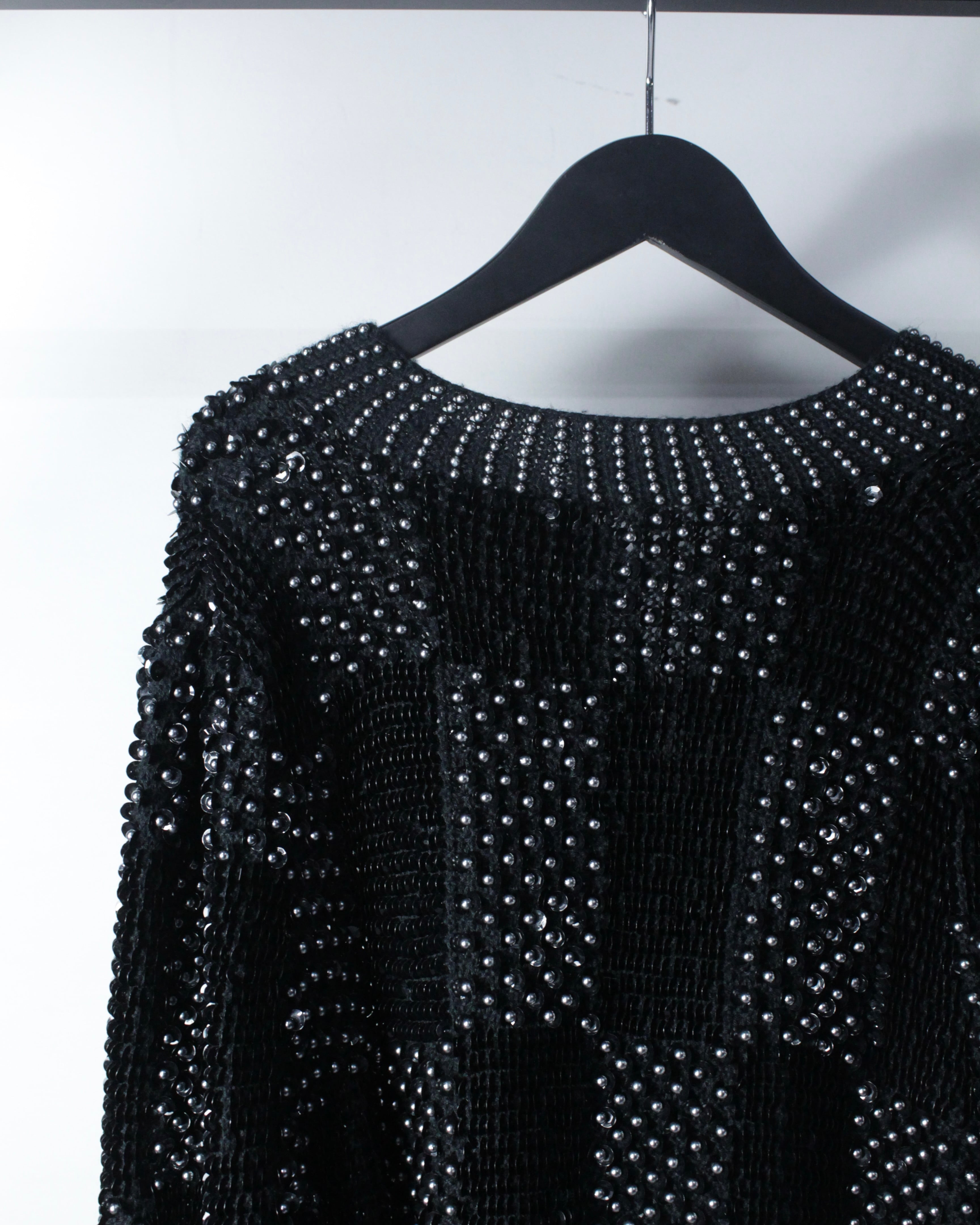 オールブラックのボディをベースに、パールとスパンコールを格子状に贅沢に配置した1着。