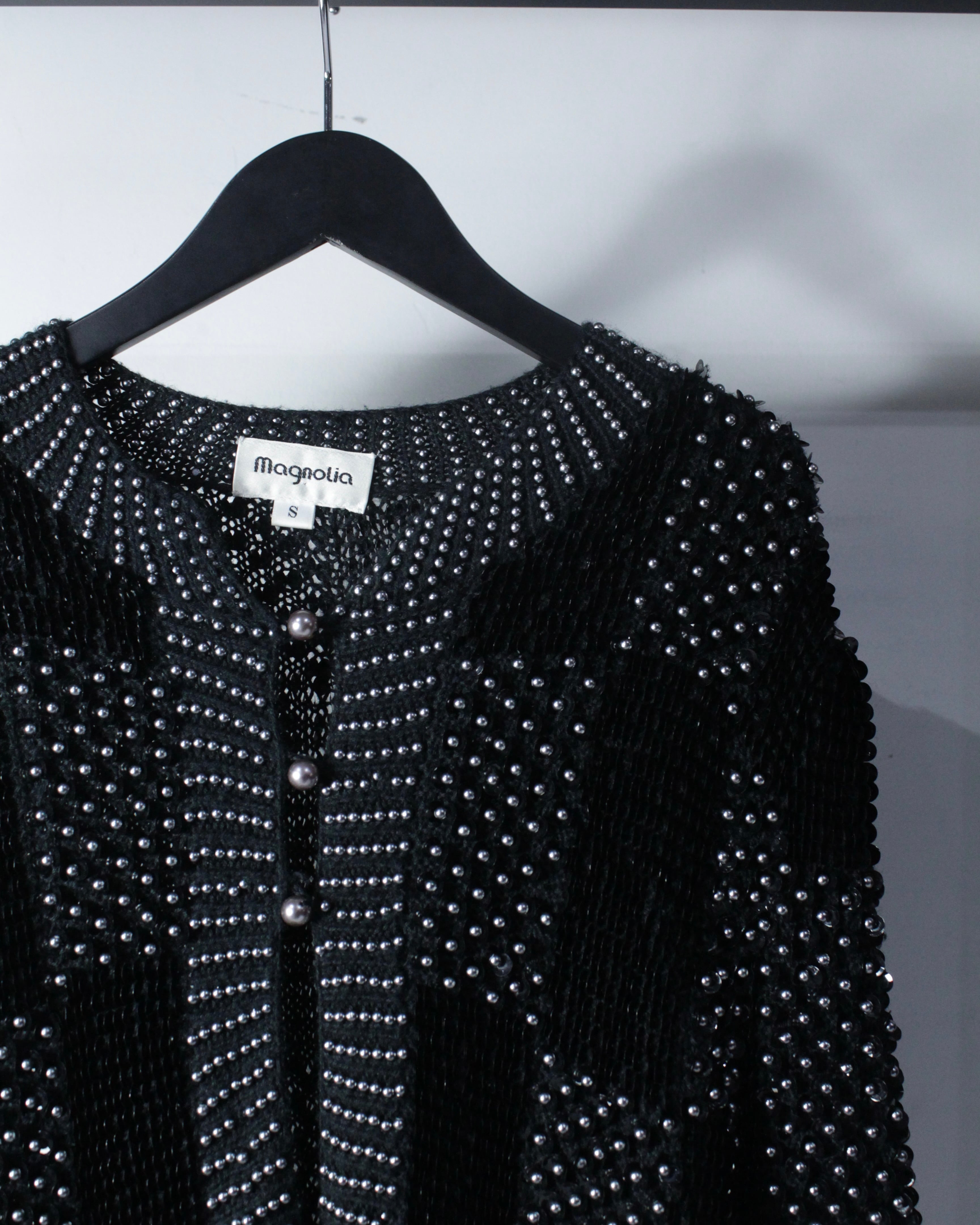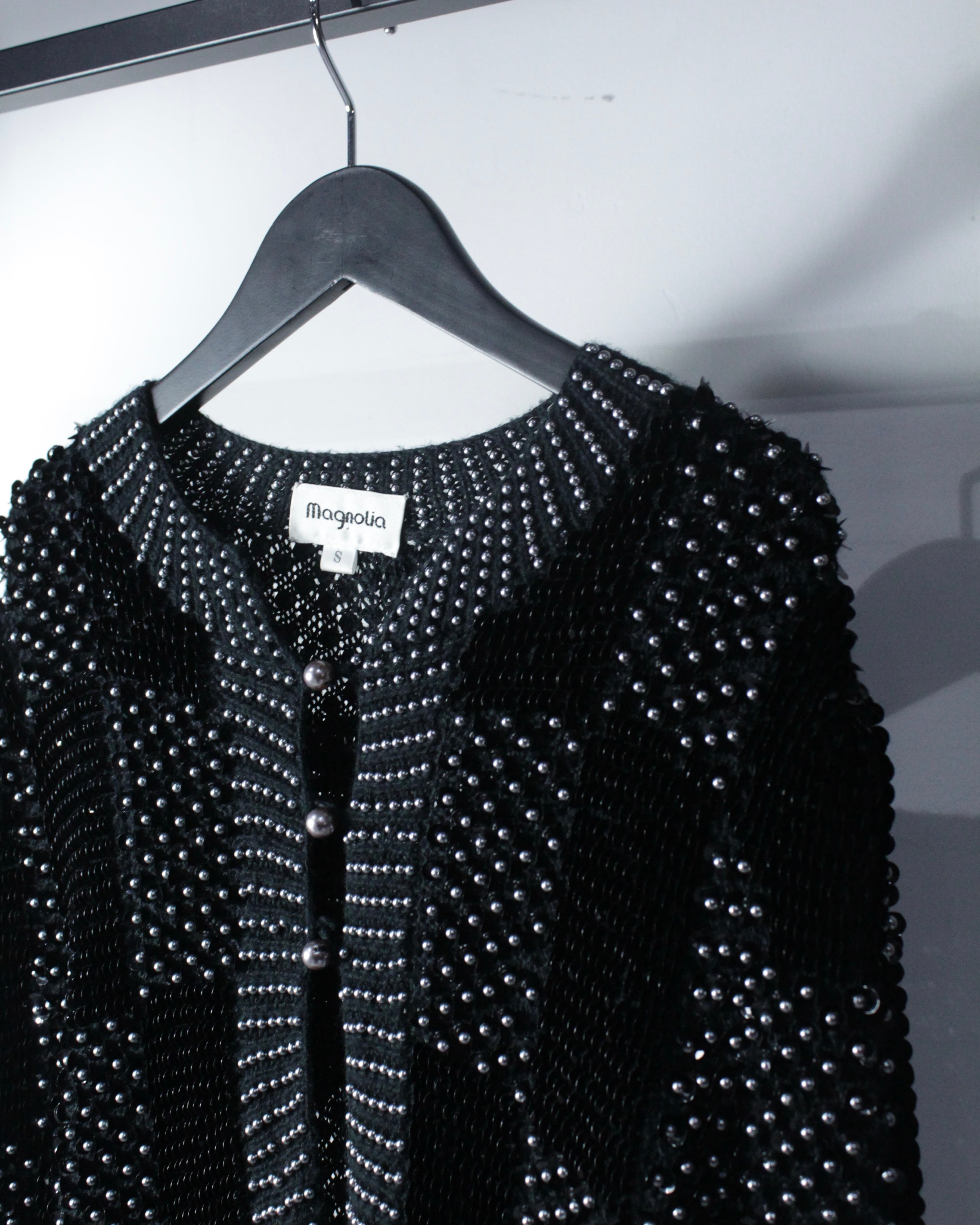 装飾性の高さに、ファッション性を併せ持った当店らしいニットカーディガンの逸品です。