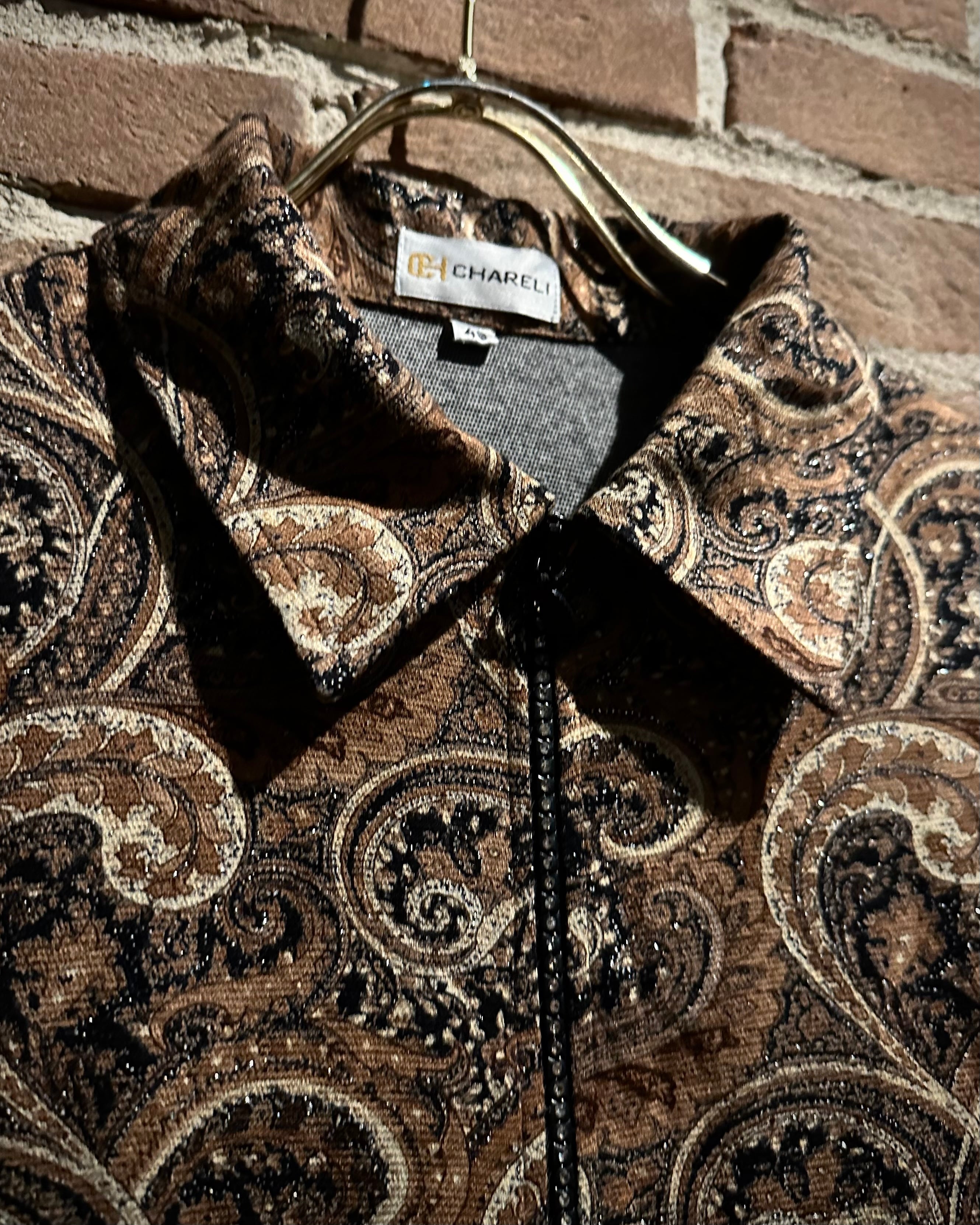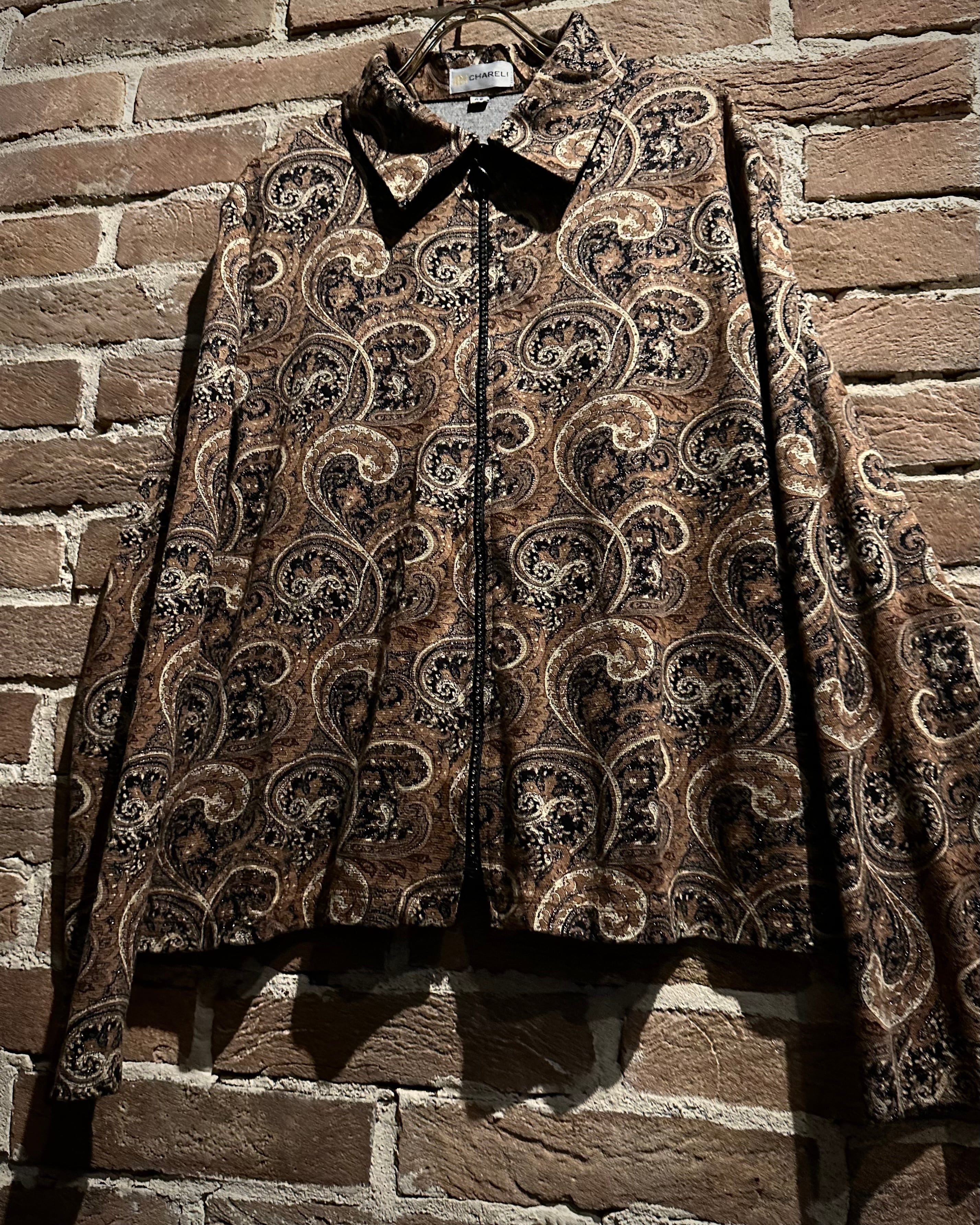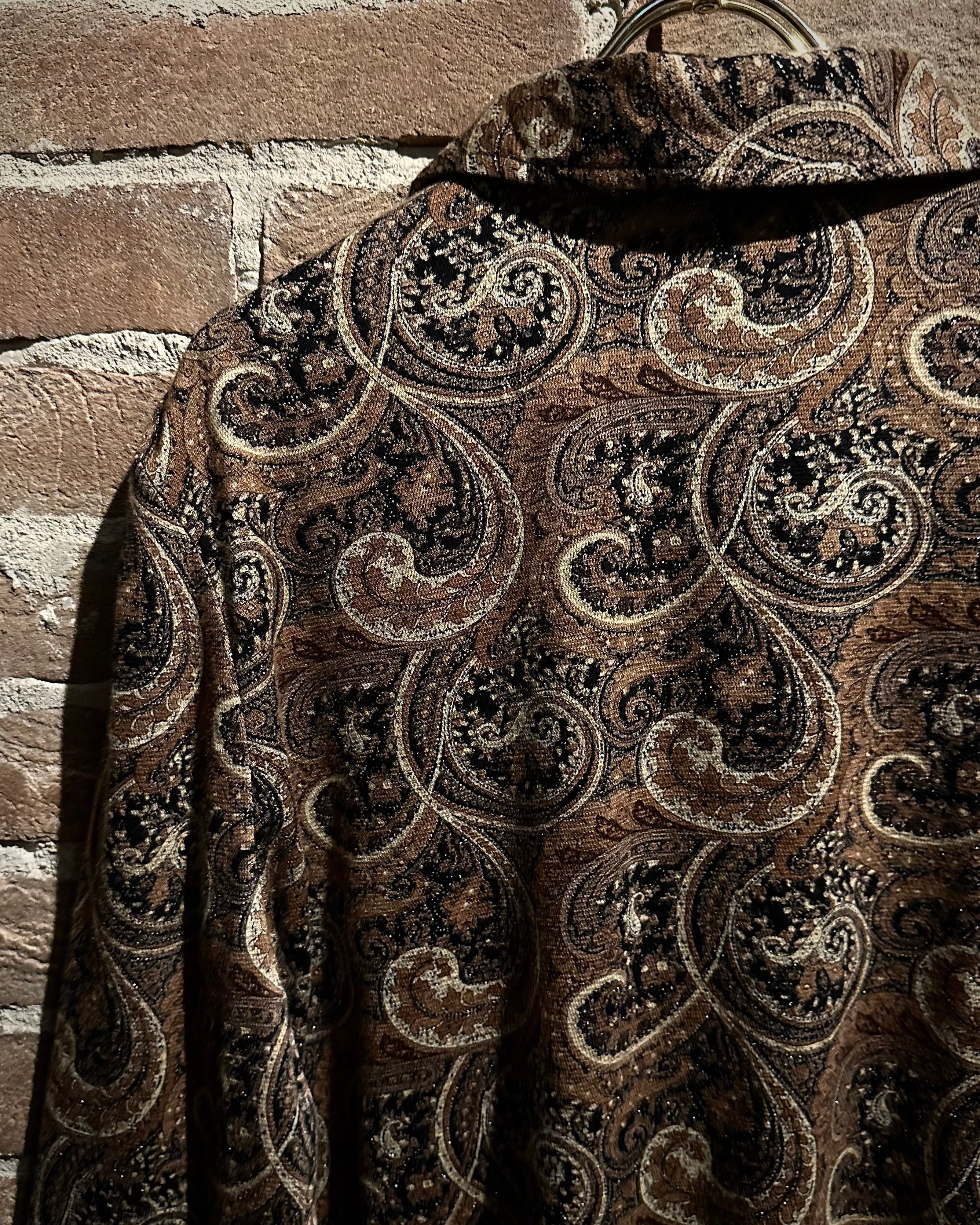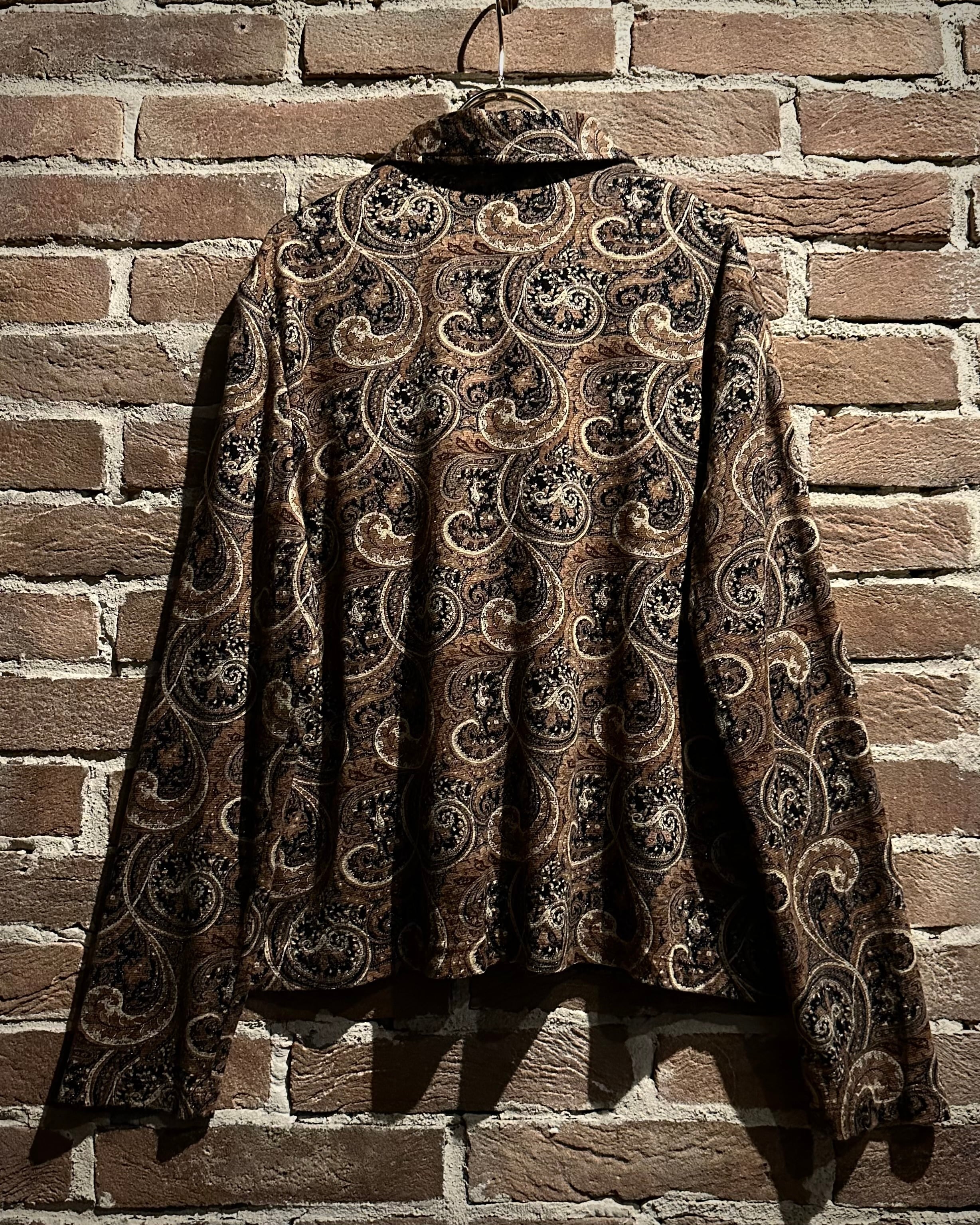 伸縮性のある素材をボディに使用し、ブラウンをベースにペイズリー柄を載せた、80年代から90年代のユーロヴィンテージのジップアップジャケット。