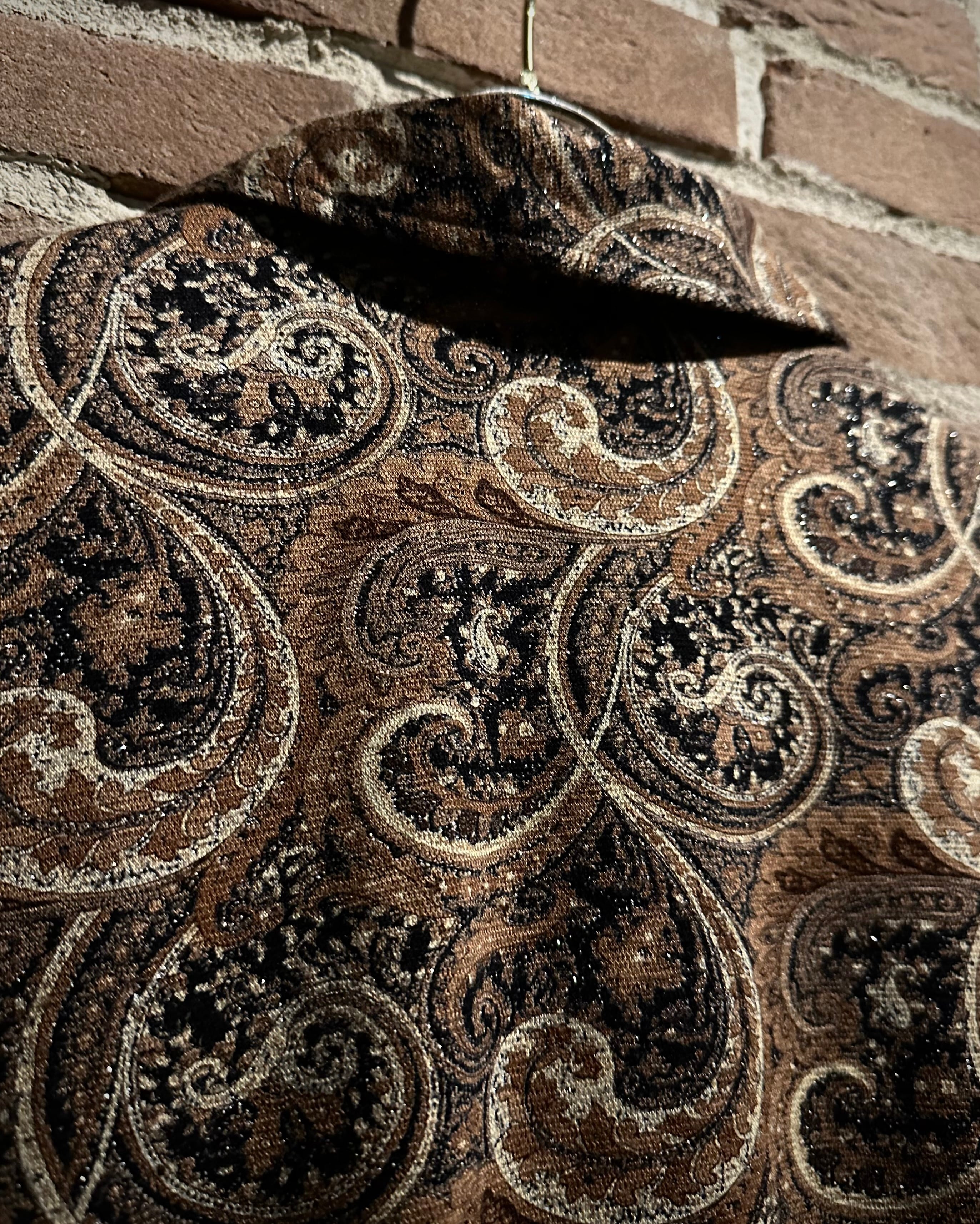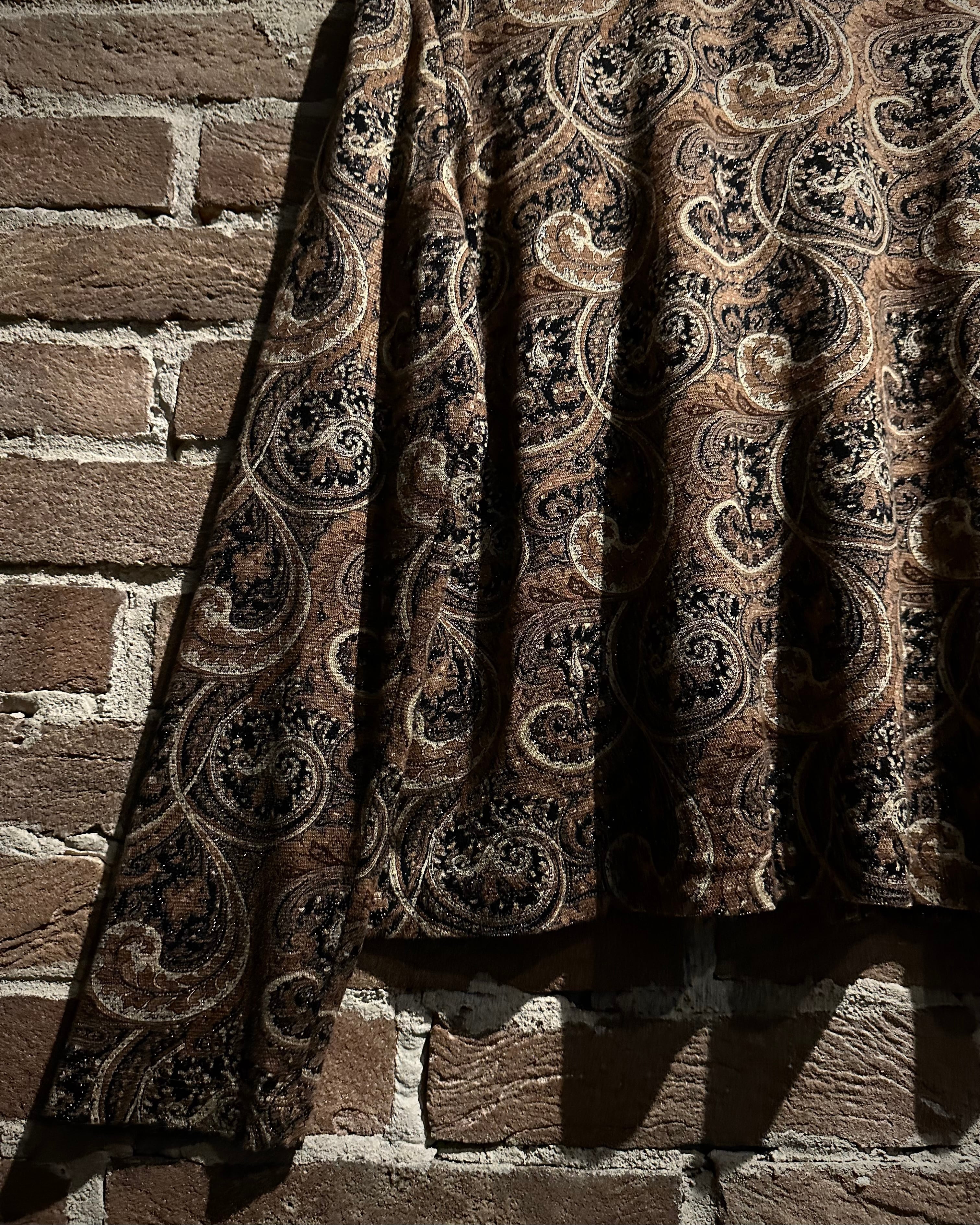 ブラウンベースに構成されたペイズリー柄はクラシカルでありながら、全体に織り込まれたラメ糸が光の角度で鈍く煌めき、奥行きのある表情を演出。