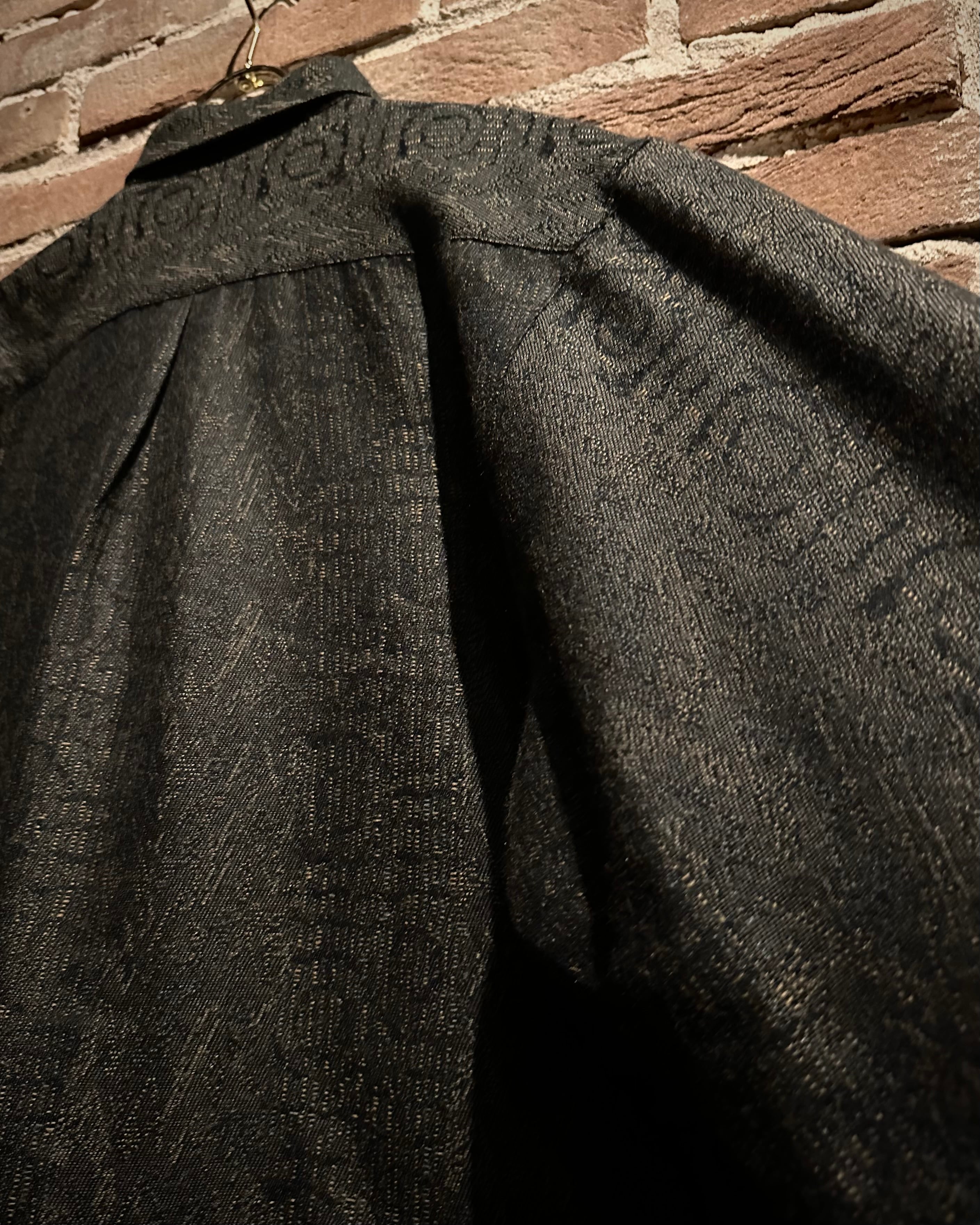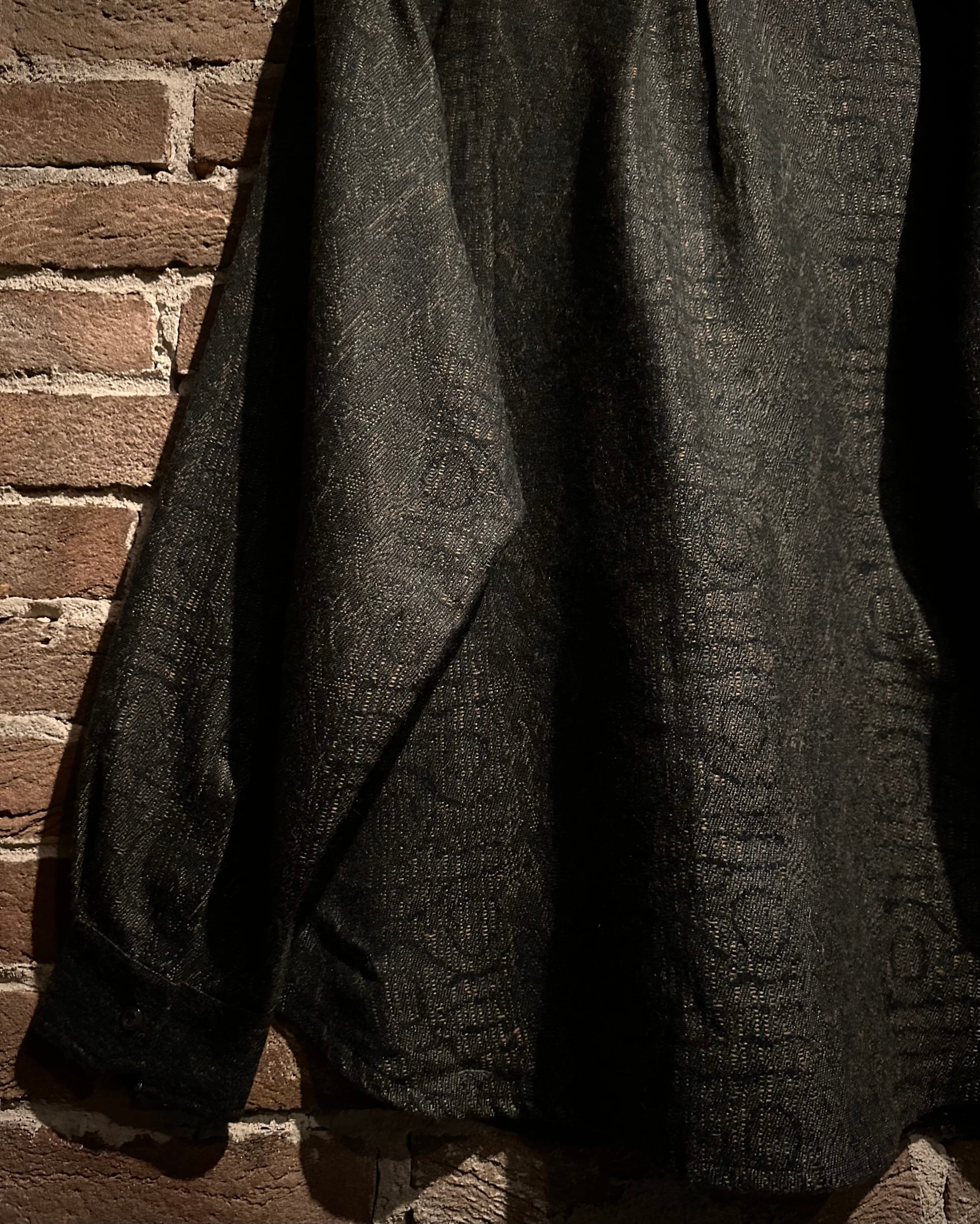 ウール×アクリルを混紡したボディは、程よく起毛感のある奥行きある質感に仕上がっており、ブラックベースの中に浮かび上がる幾何学模様や文字のような総柄がさりげない主張を演出。光の当たり方で表情を変えるファブリックは、ラグジュアリーブランドらしい上質さを感じさせます。