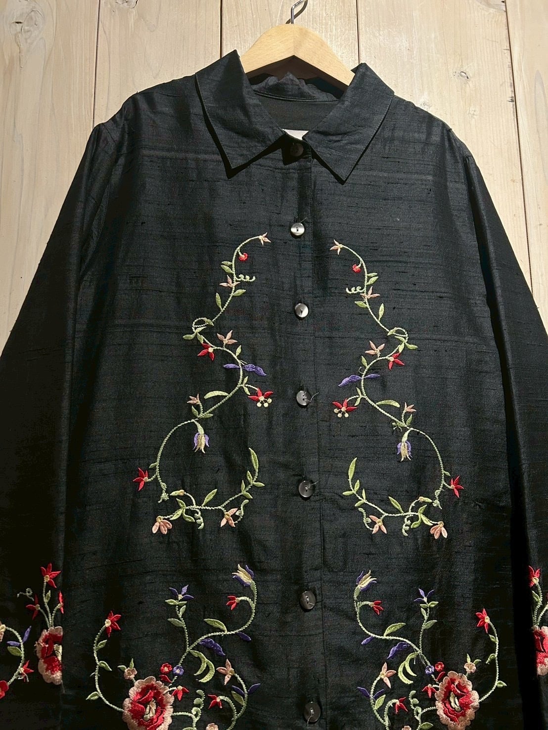 上品なローシルクをベースに、立体的な花柄刺繍を贅沢に施した長袖シャツジャケット。
