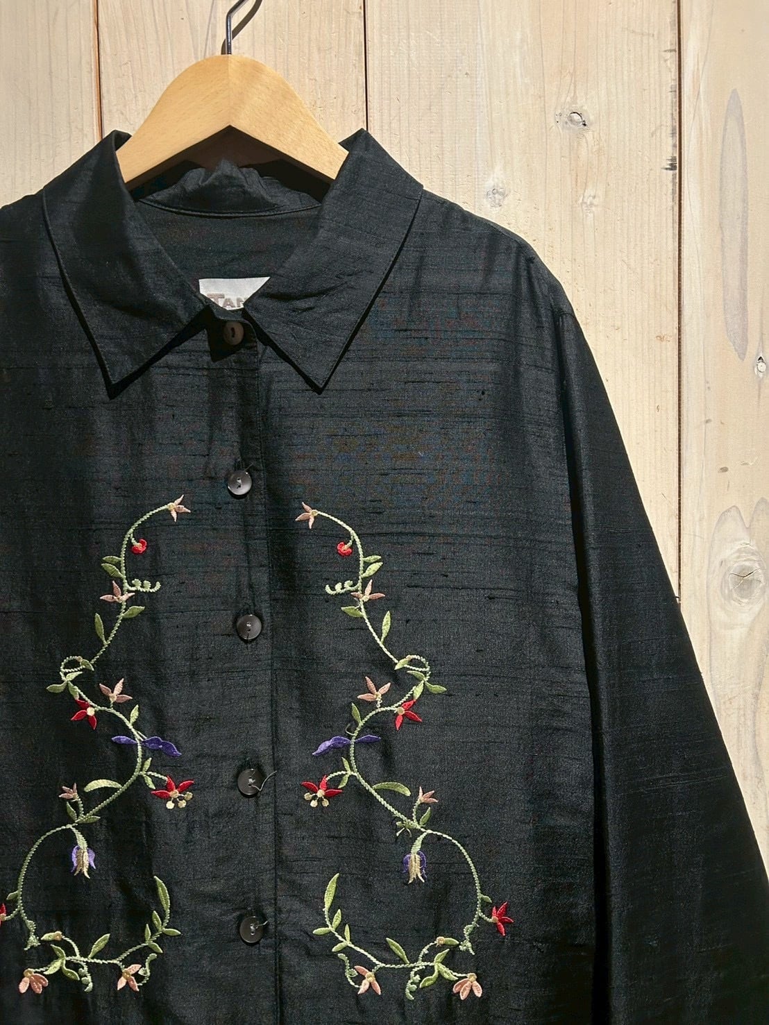 ネップ感のあるローシルク特有の表情に、凹凸のある刺繍が重なることで生まれる雰囲気は圧倒的。フロントのみならず背面や袖にまで刺繍を配し、どの角度から見ても抜かりのない完成度の高さを誇ります。