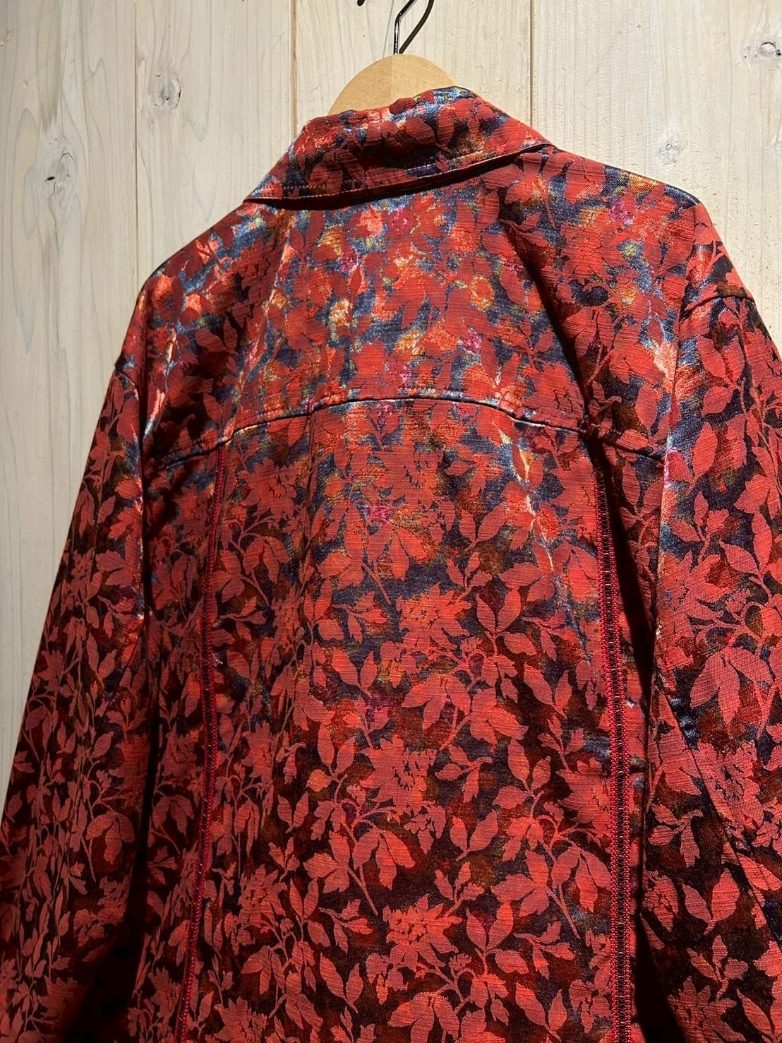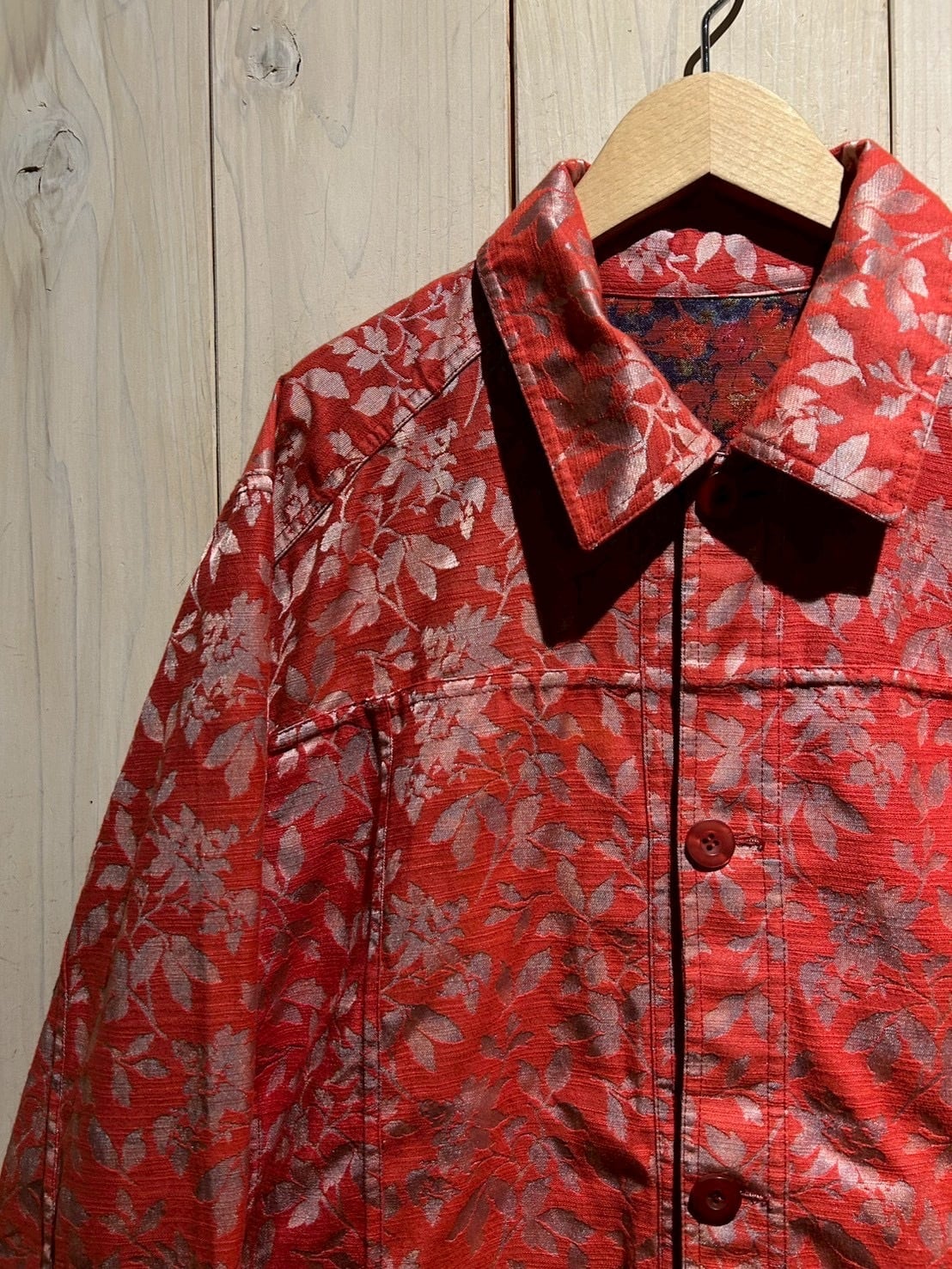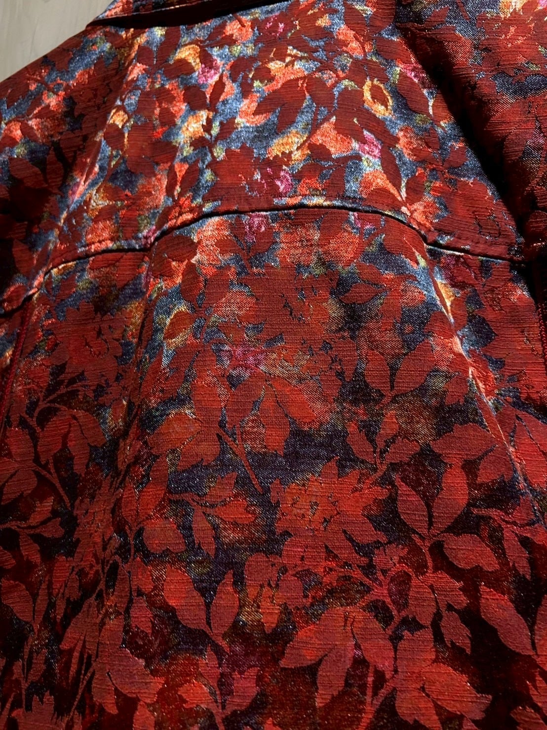 メタリックな光沢を帯びたボディに花柄を重ね、さらに織りで植物柄を表現した、圧倒的な存在感を誇るリバーシブルのジャケット。