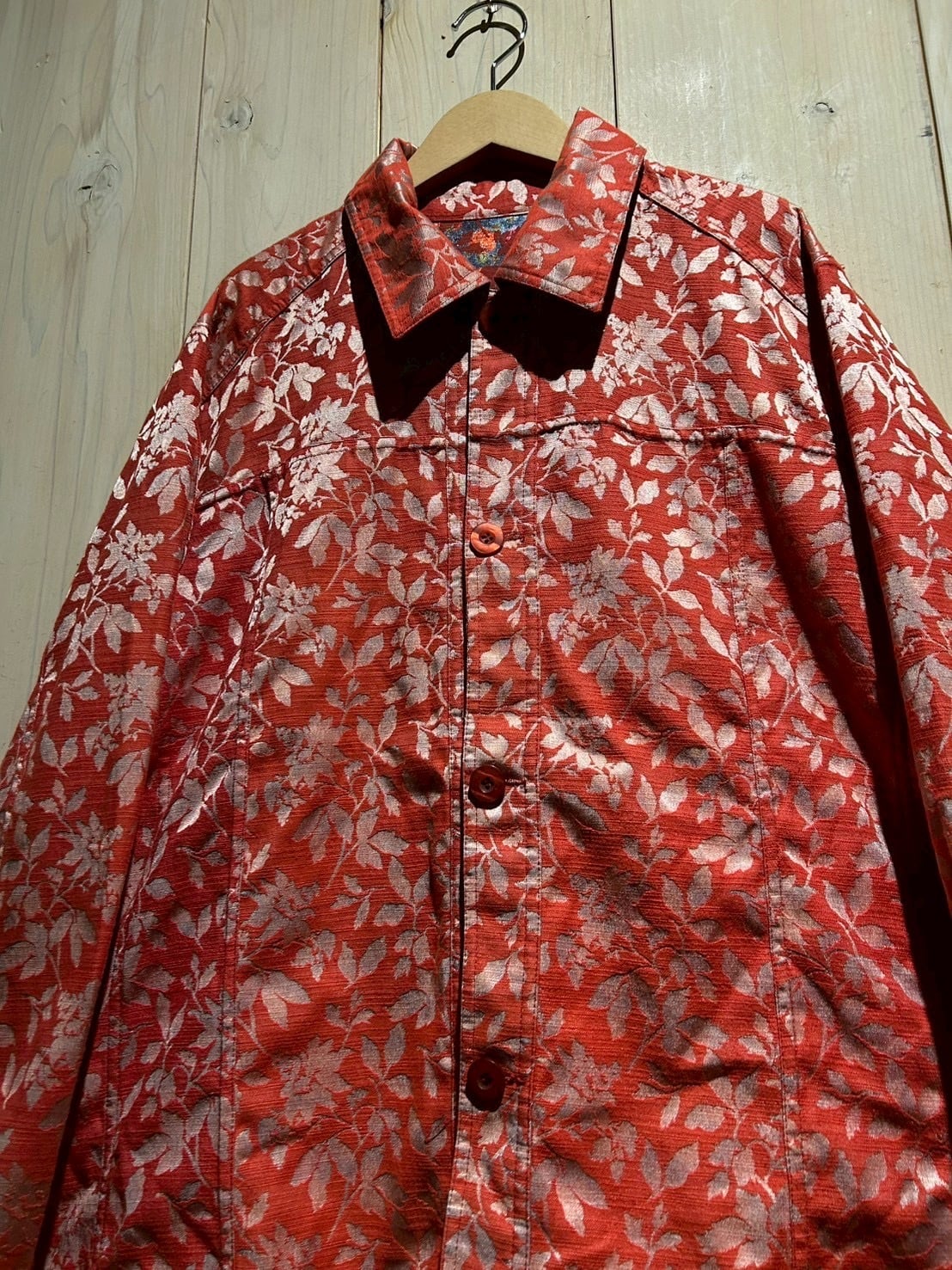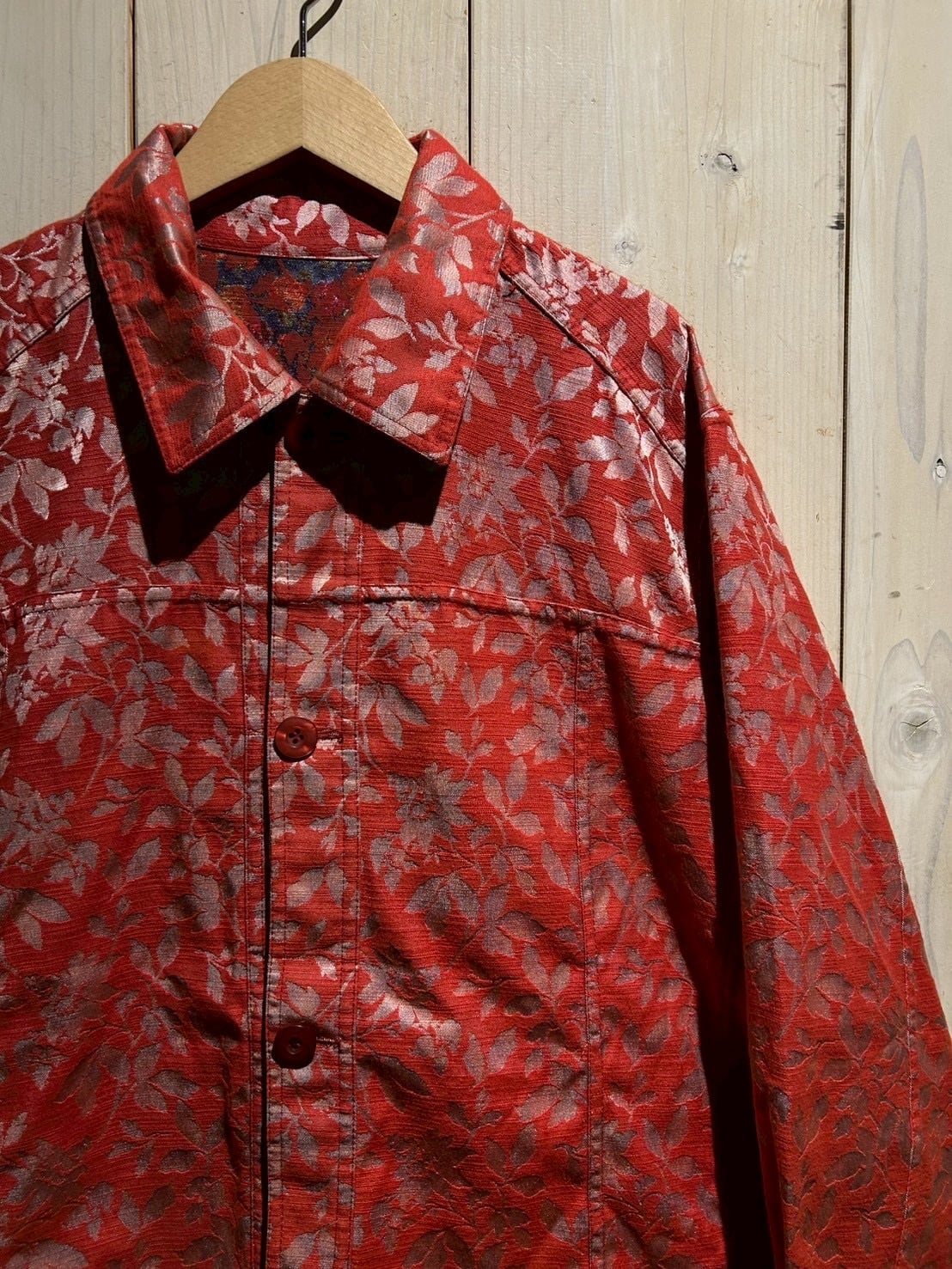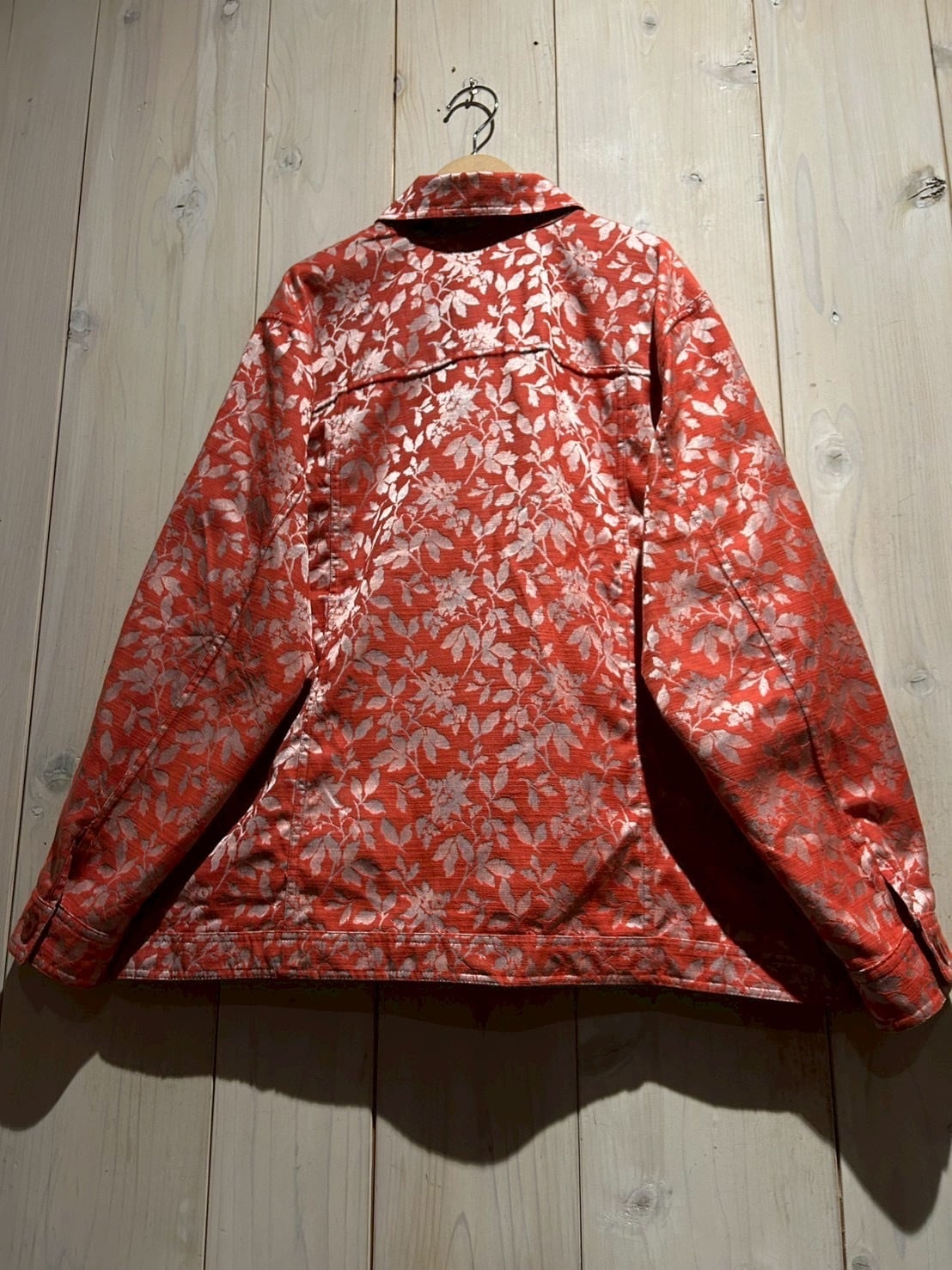 メタリックな光沢を帯びたボディに花柄を重ね、さらに織りで植物柄を表現した、圧倒的な存在感を誇るリバーシブルのジャケット。