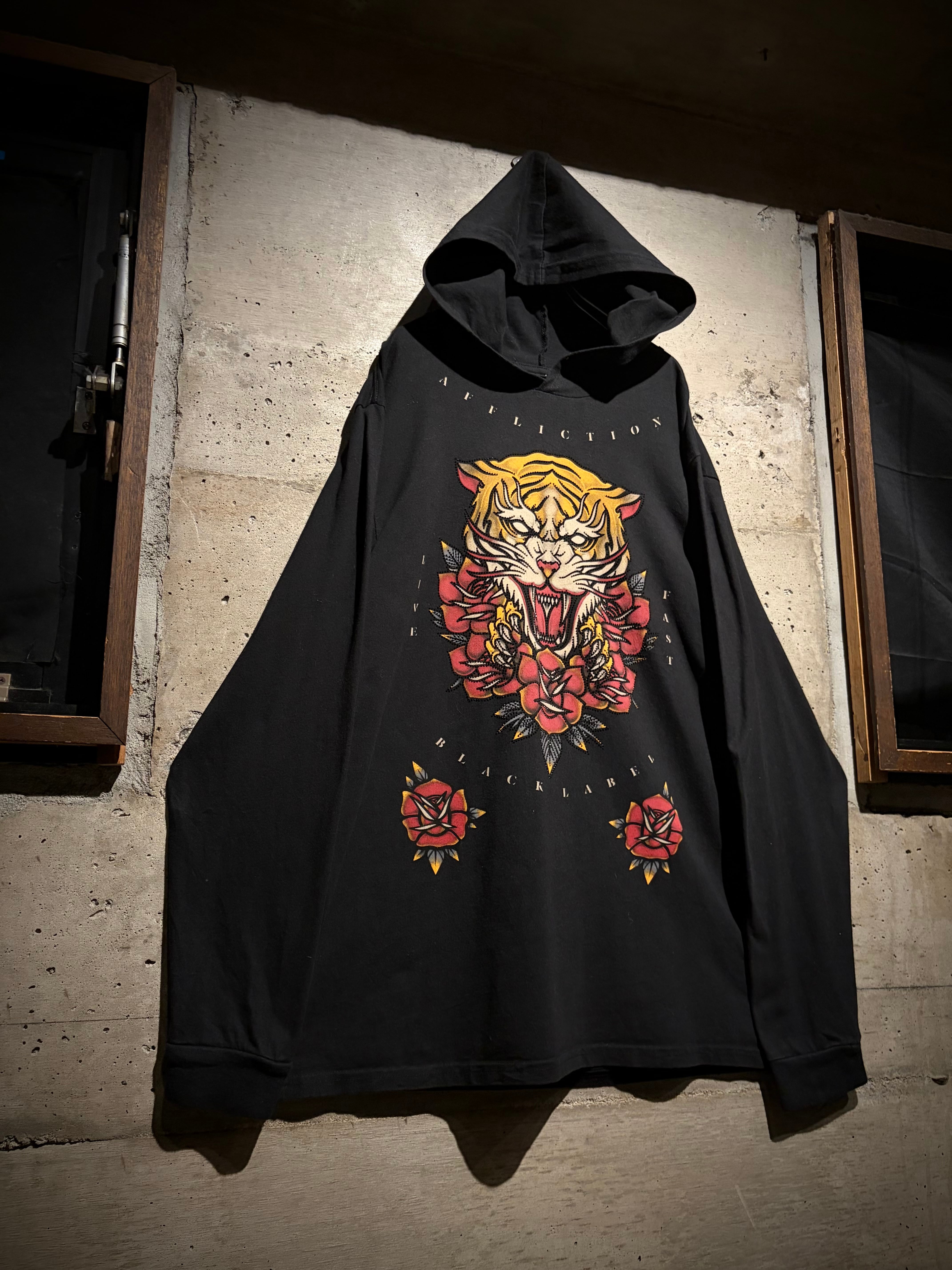 ブラックボディをベースに、アメトラタトゥーを彷彿とさせる虎と薔薇のモチーフを大胆にプリントした、まさにこのブランドらしい攻撃的かつ妖艶な世界観を体現した1着。