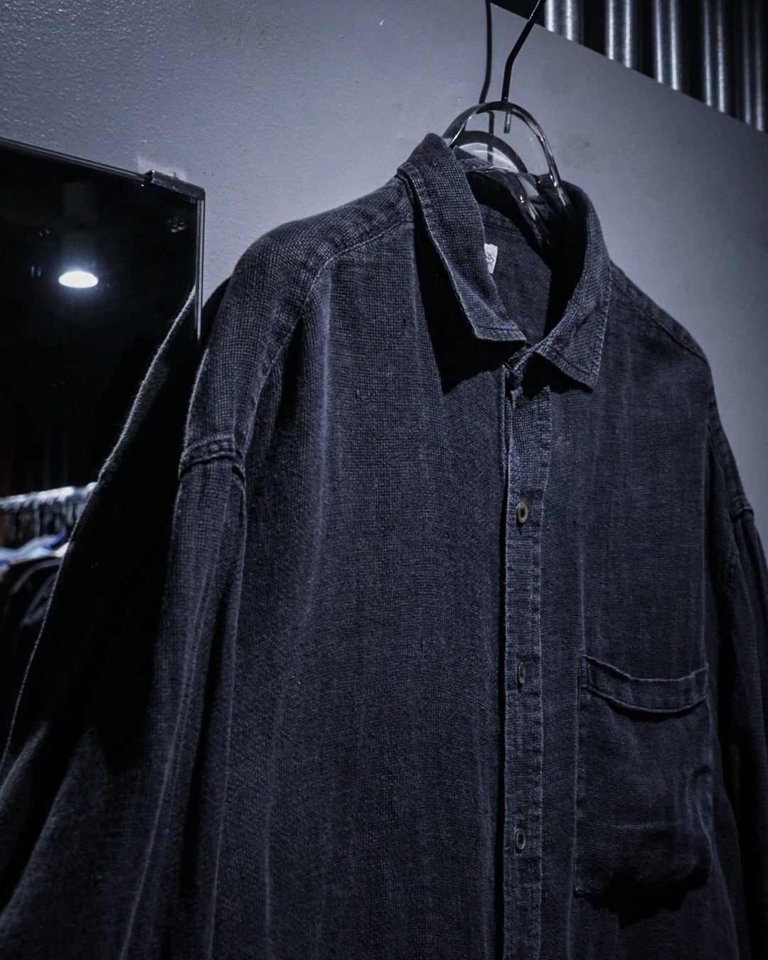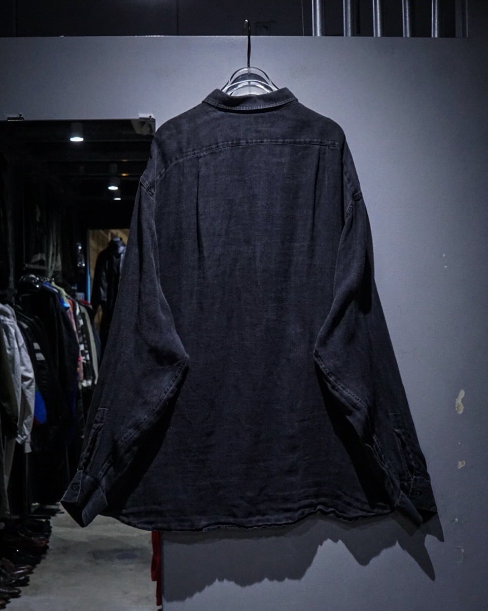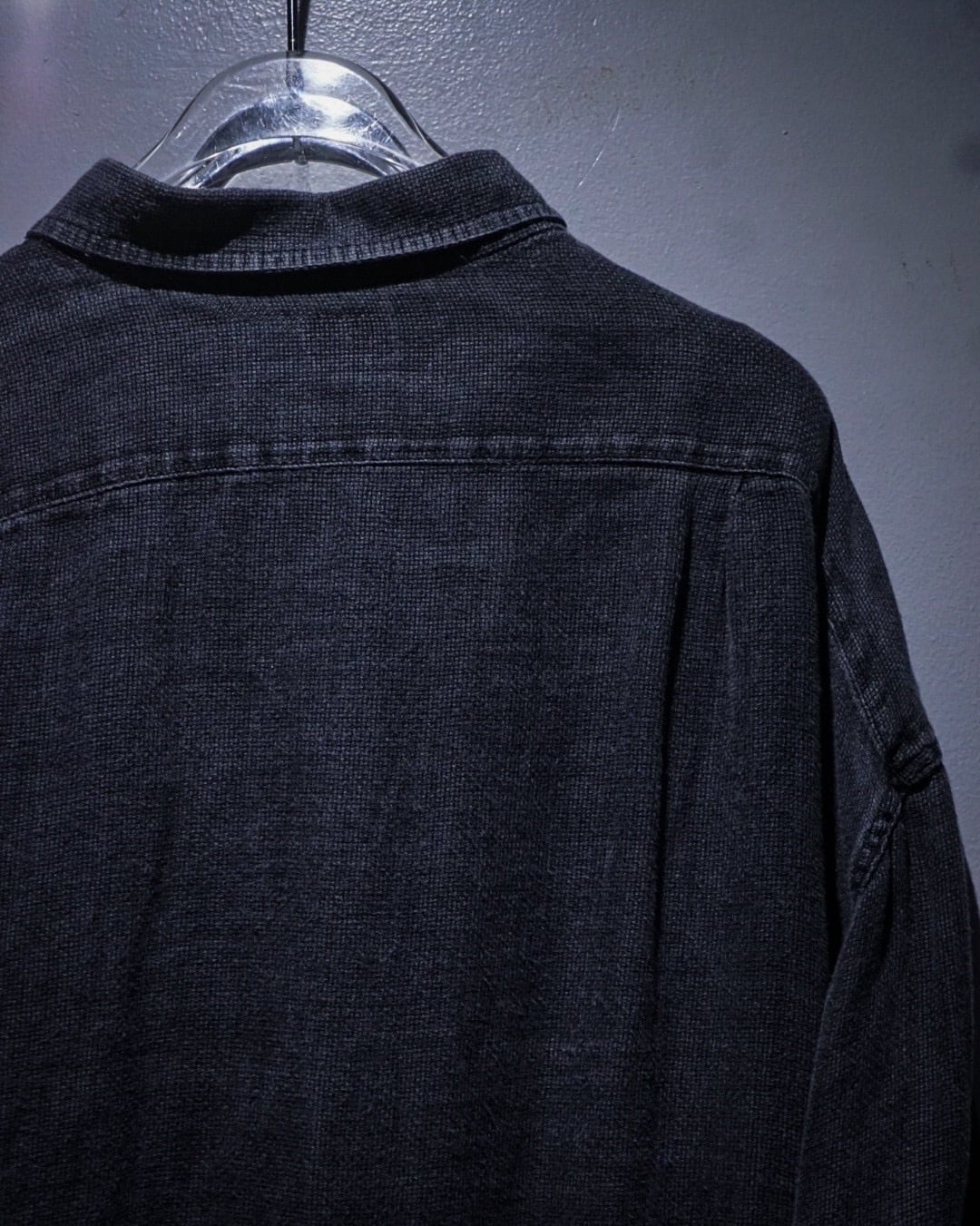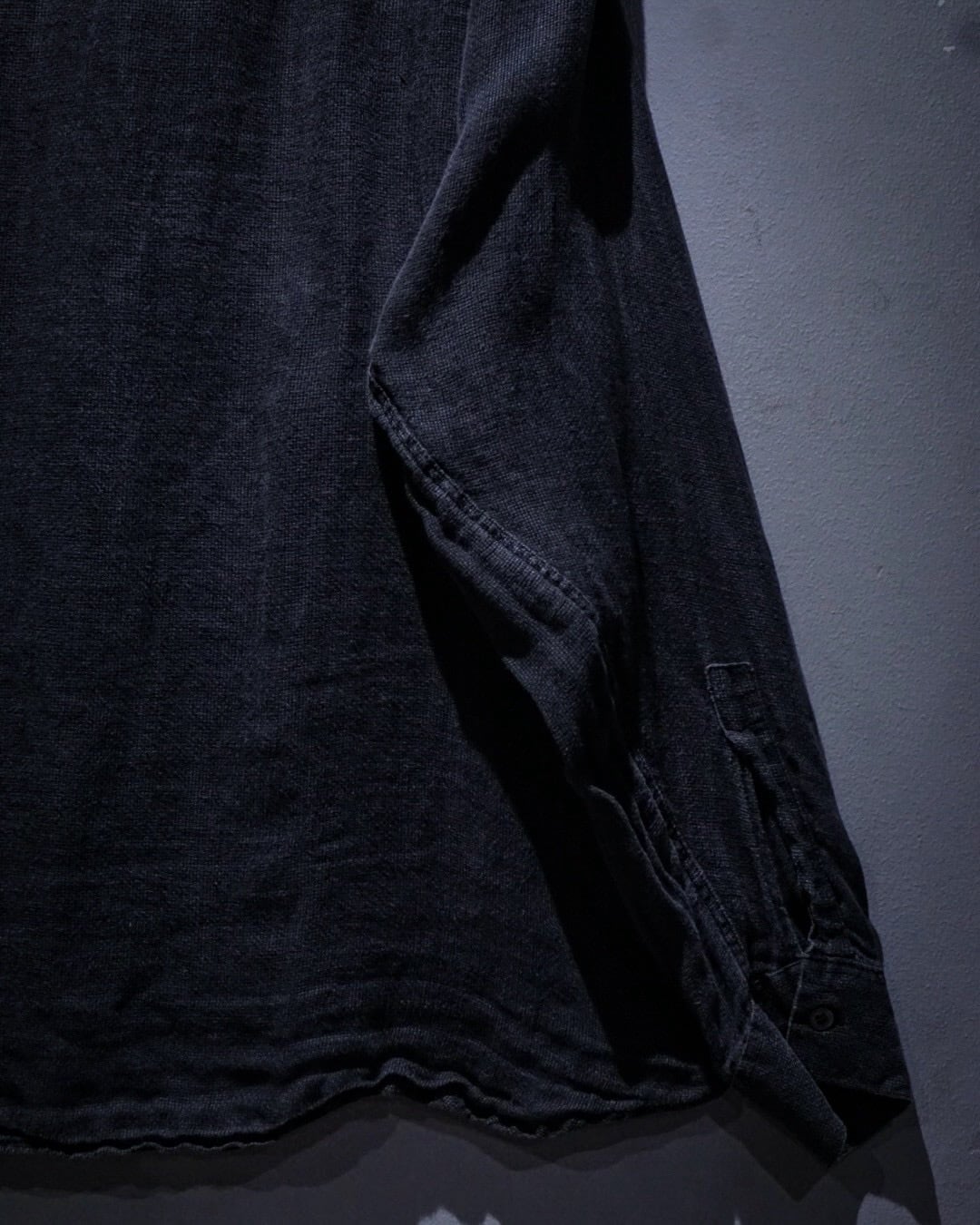 ブラックのリネンボディは、着込まれることで生まれたフェード感が絶妙な表情を演出。リネン特有の粗さを感じる織りが無機質な黒に奥行きを与え、風合い豊かな表情に仕上がっています。