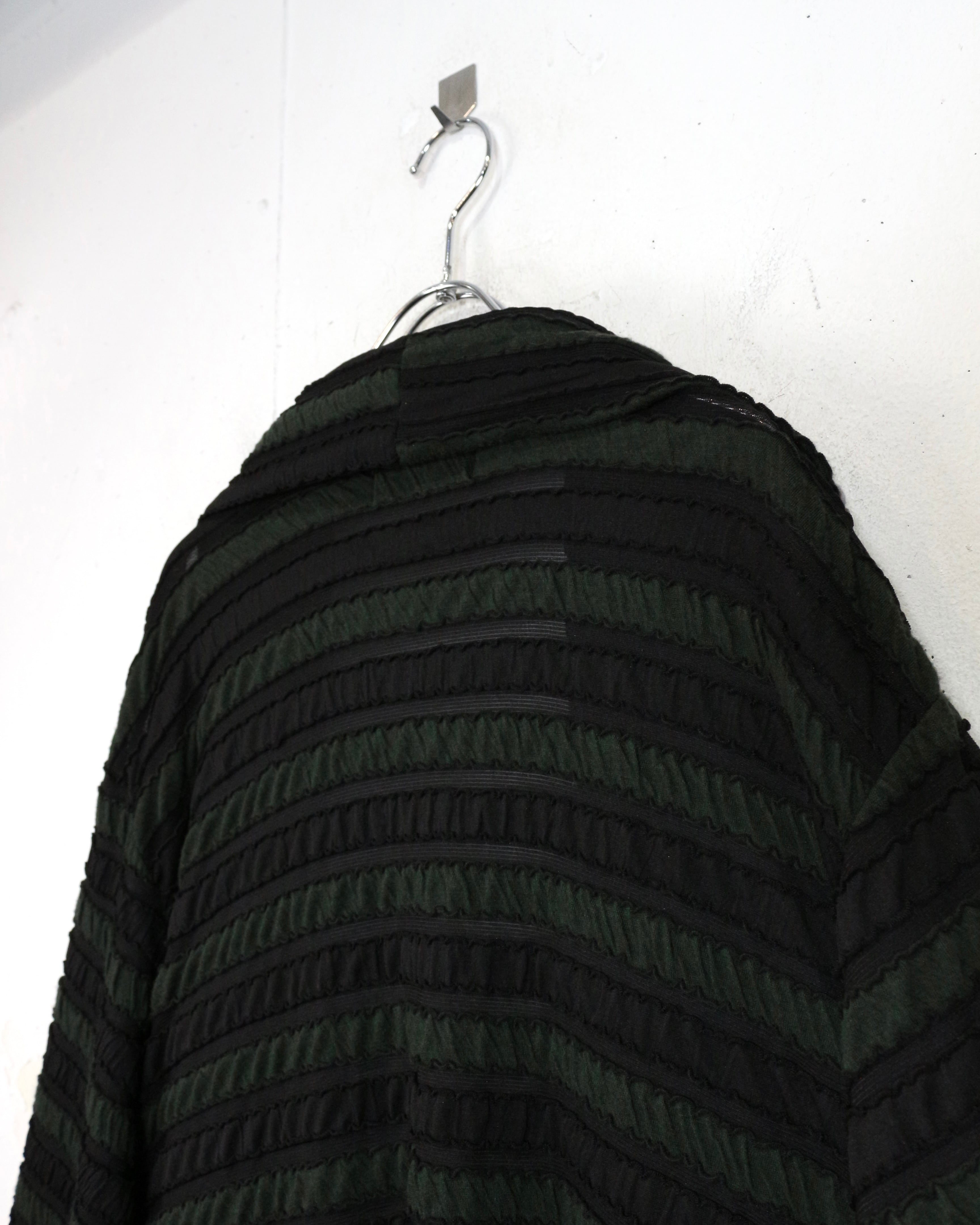 ブラックと深みのあるグリーンで表現されたカラーリングにより、奥行きと陰影が生まれ、動くたびに表情が変わる非常に完成度の高い1着に仕上がっています。