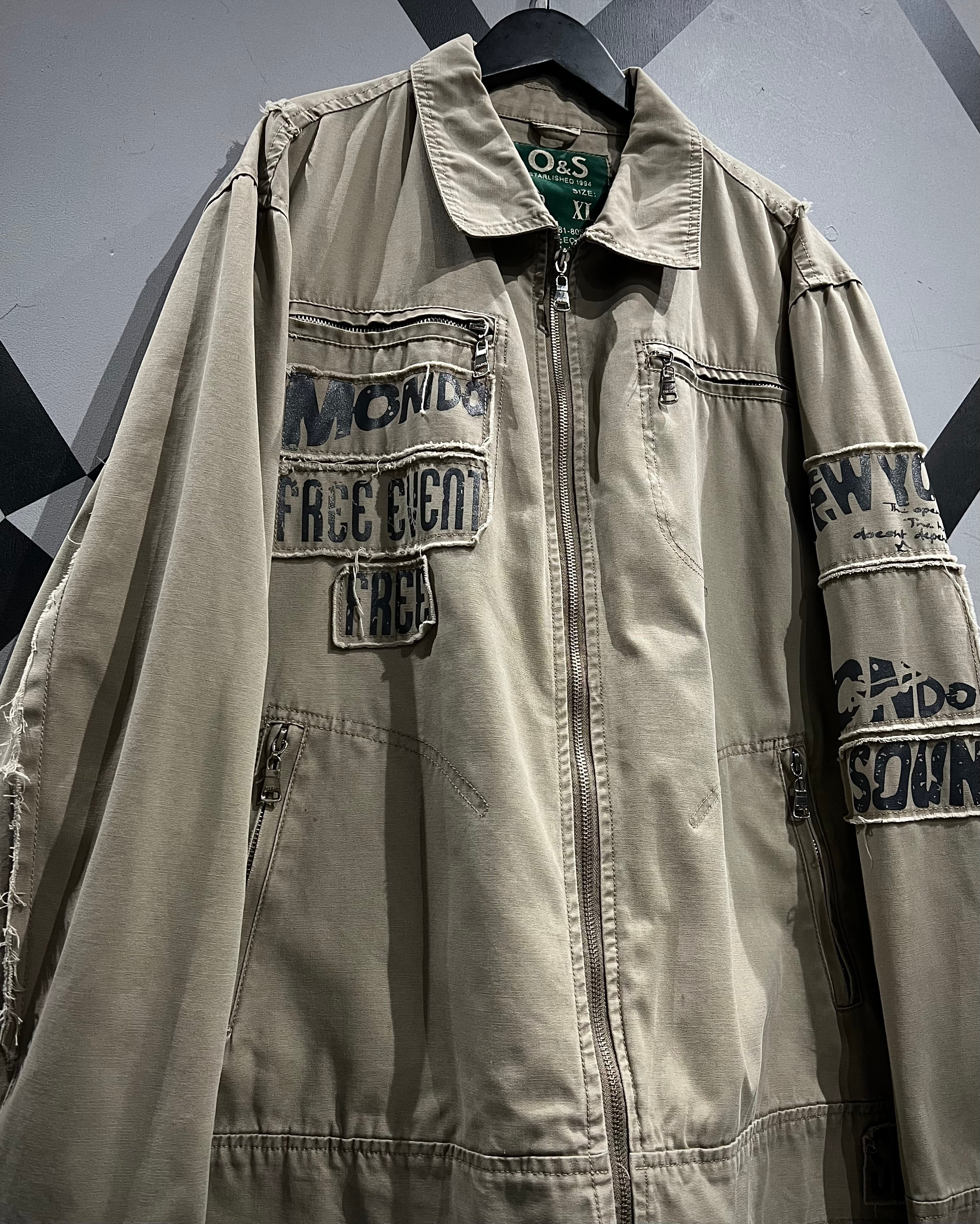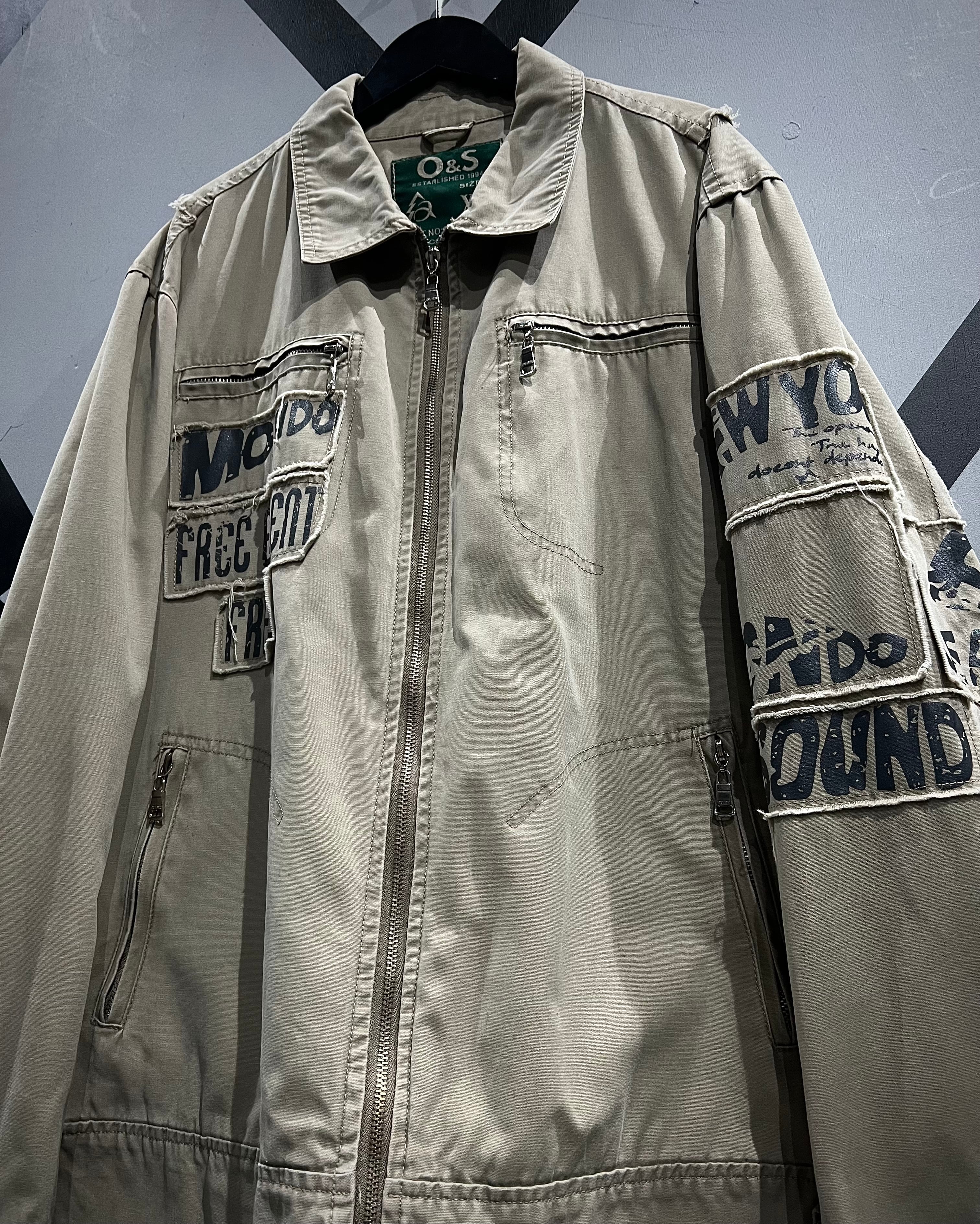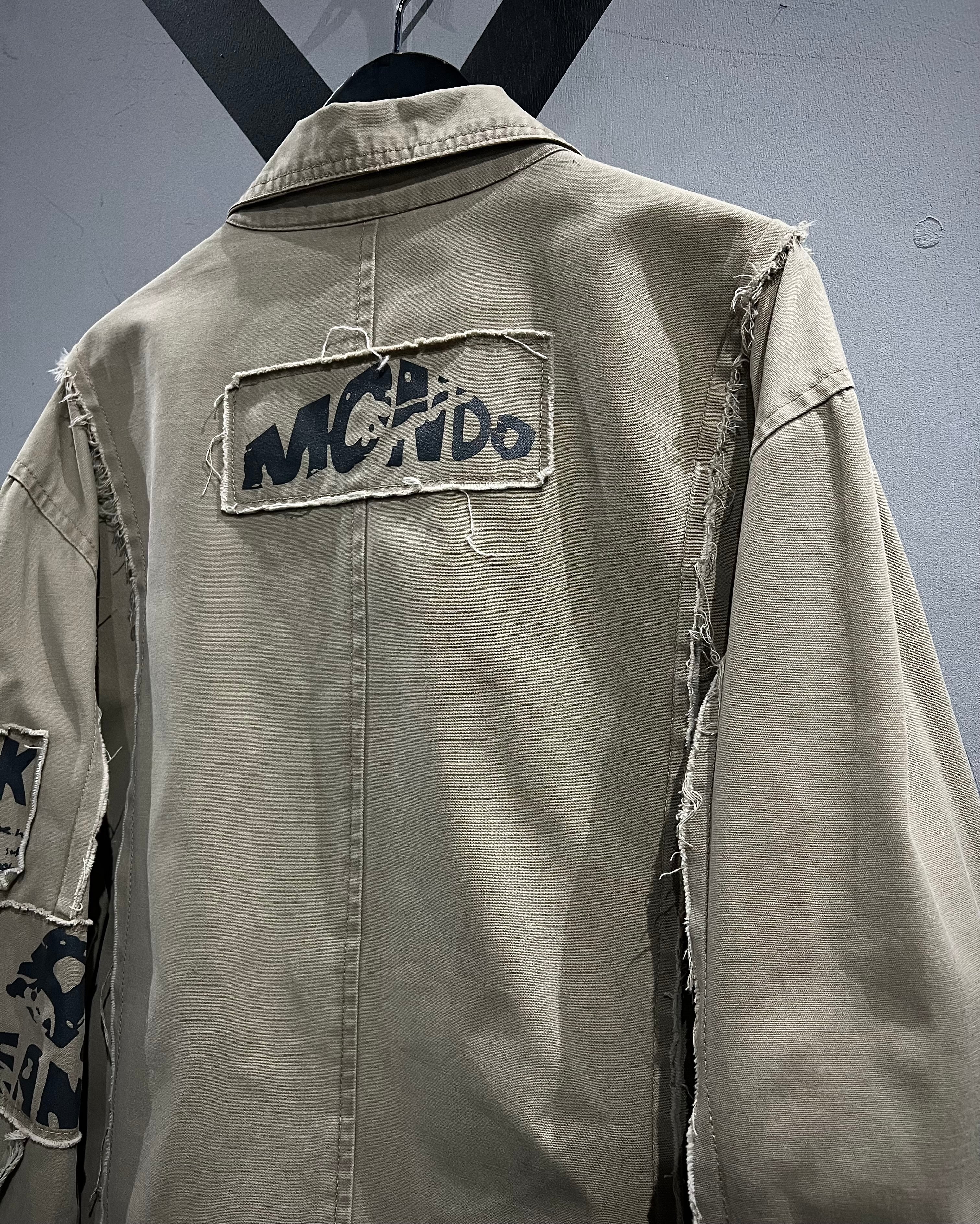 コシのあるダック素材をベースに、右胸、左袖、背面に配されたパッチの上から大胆にプリントを重ねた1着。