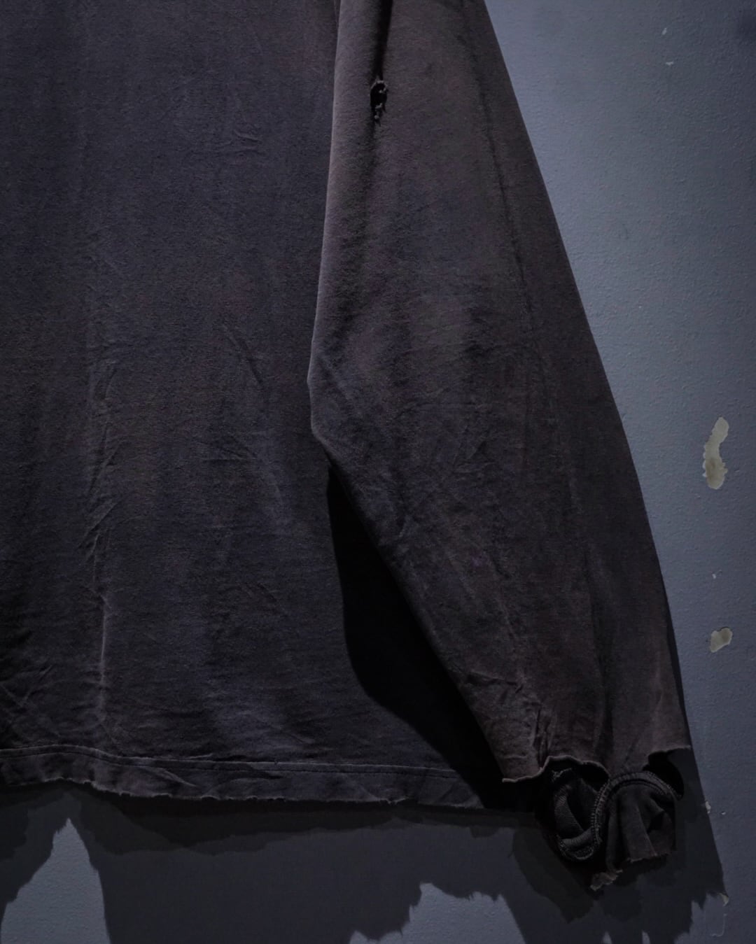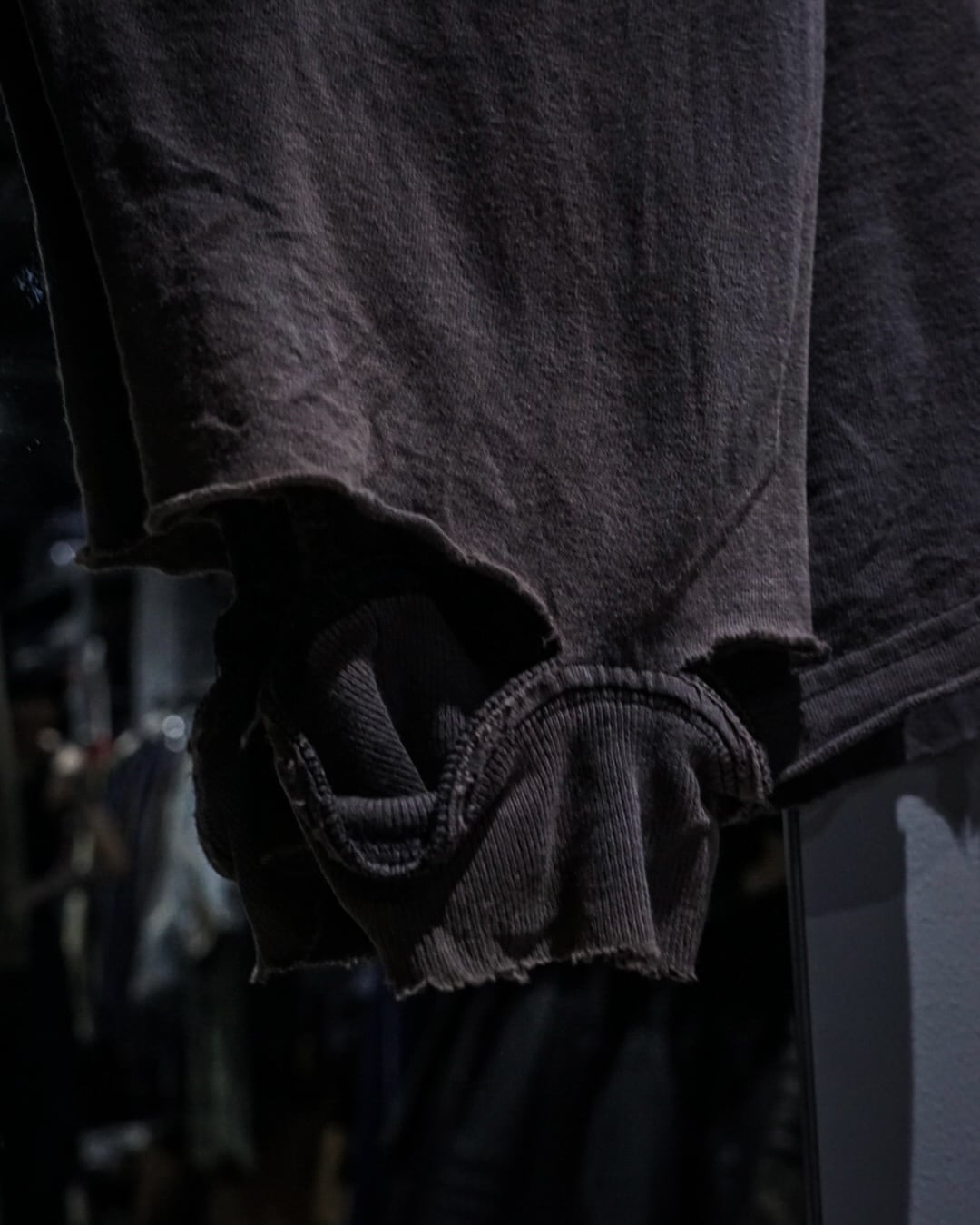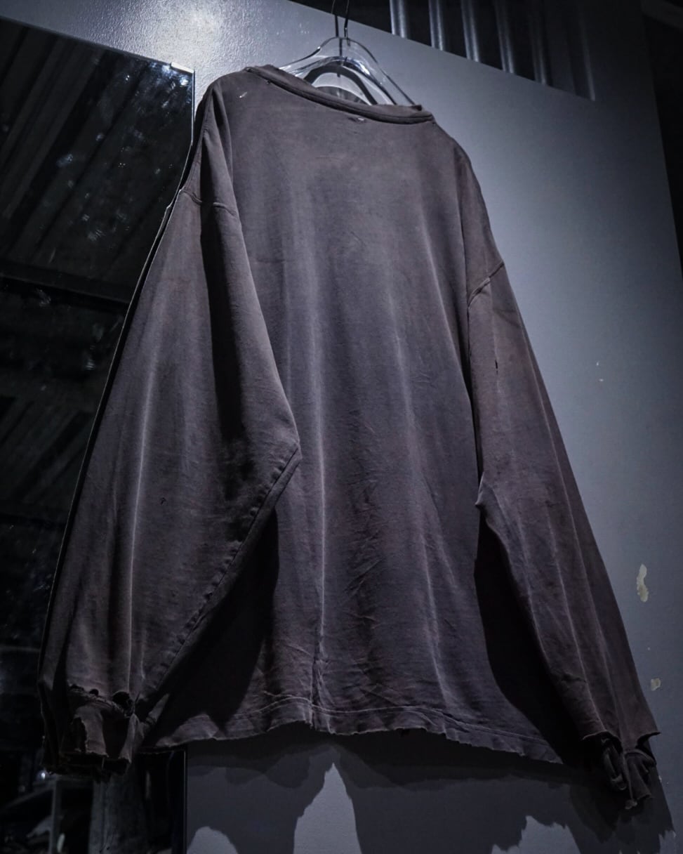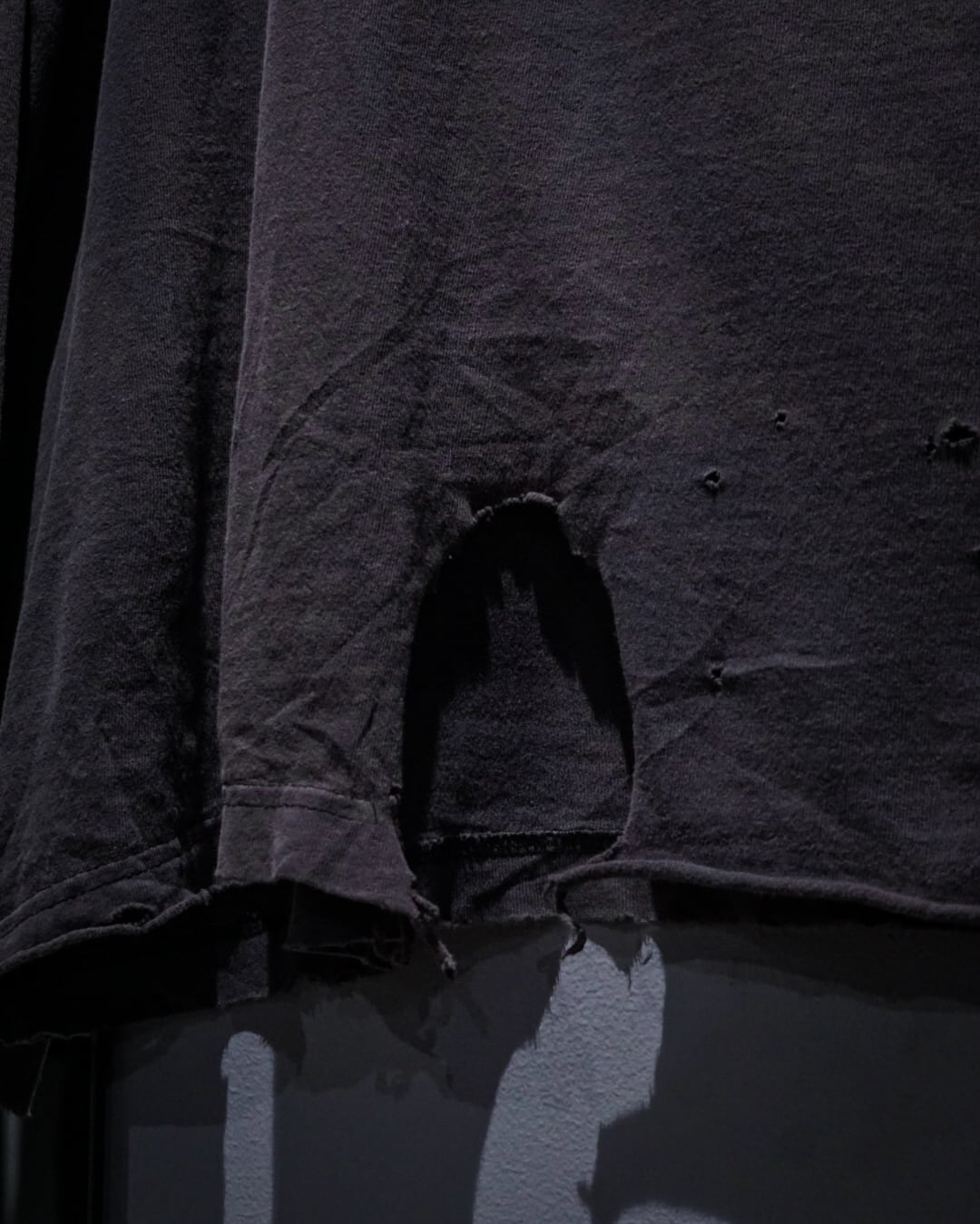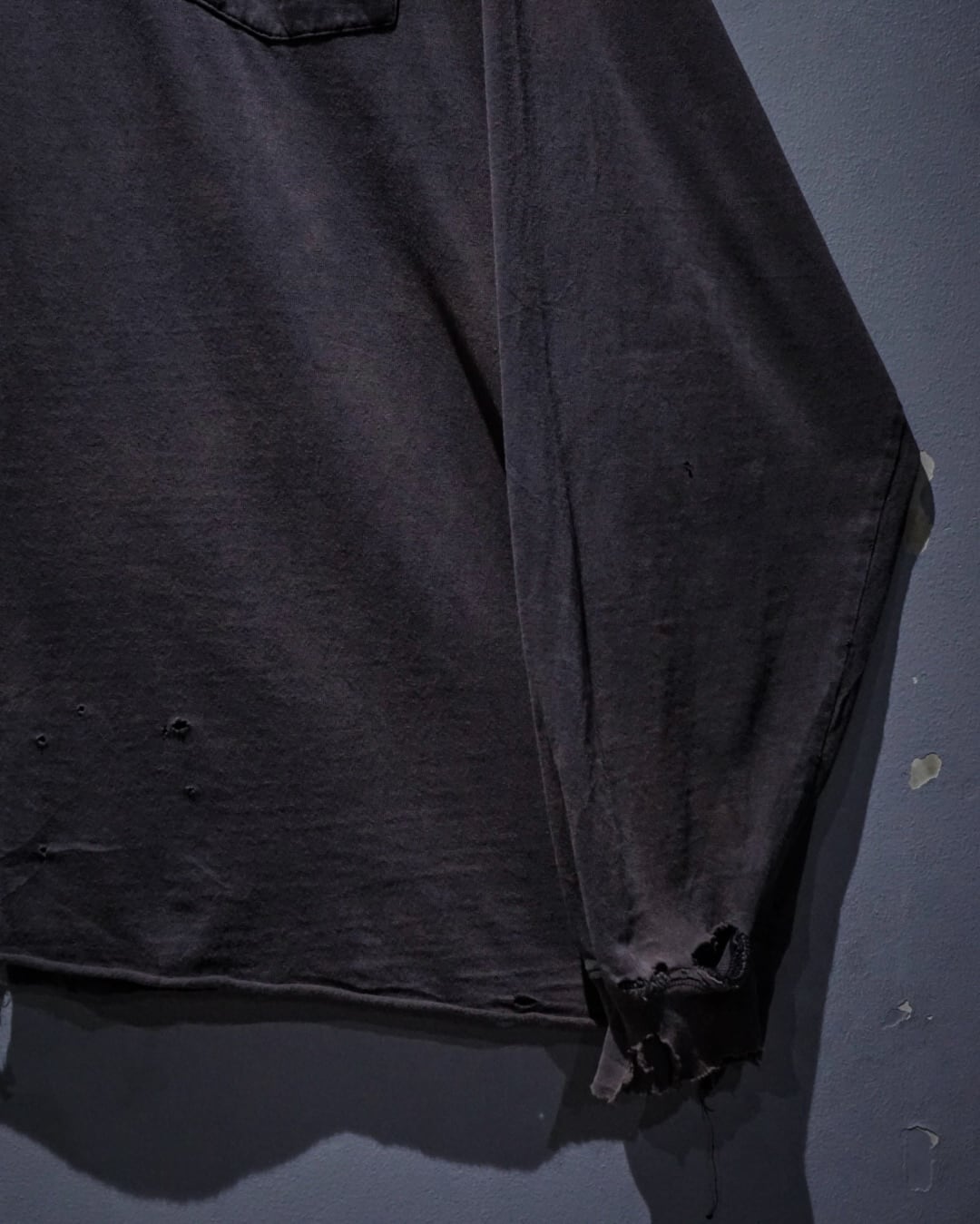 ネックや袖、裾にかけてのダメージ、ほつれ、ボロ感が一点物としての魅力を最大限に引き上げ、既製品では決して再現できない空気感が素晴らしい、、、