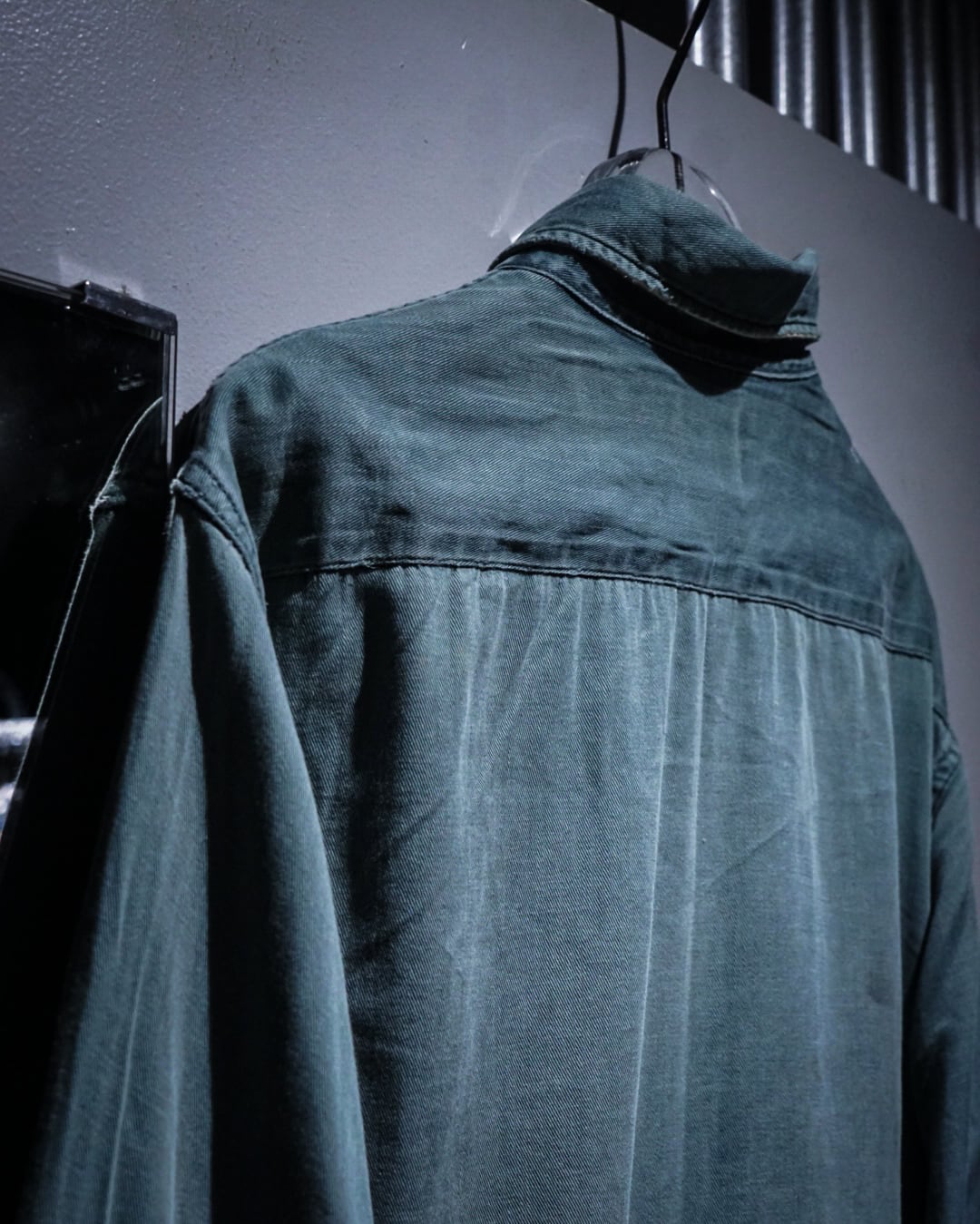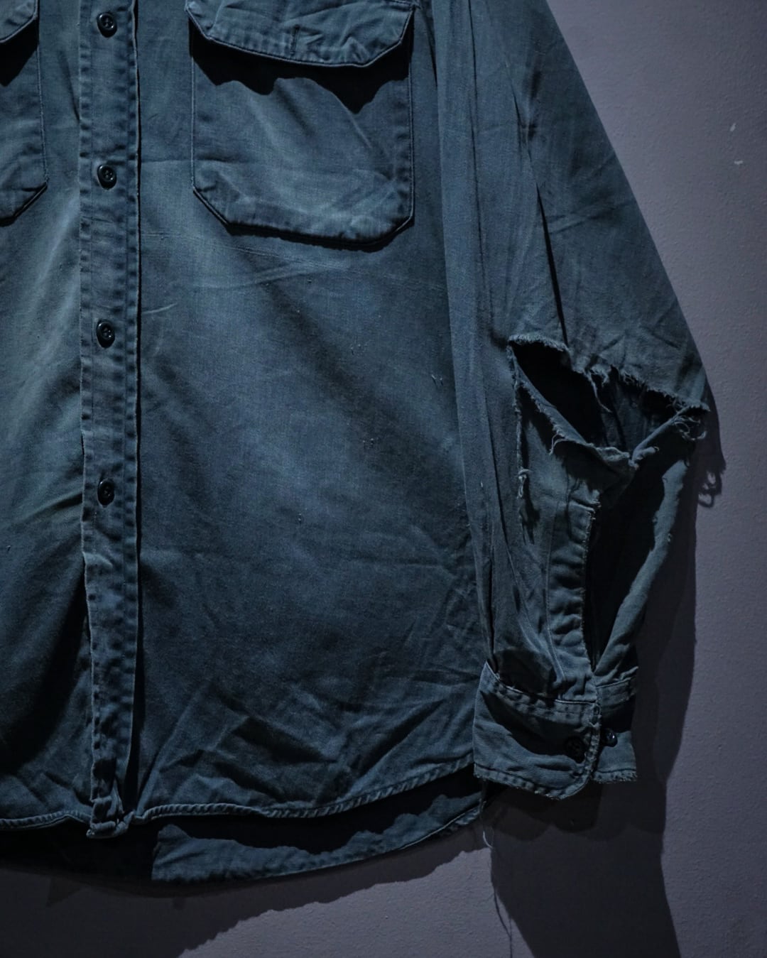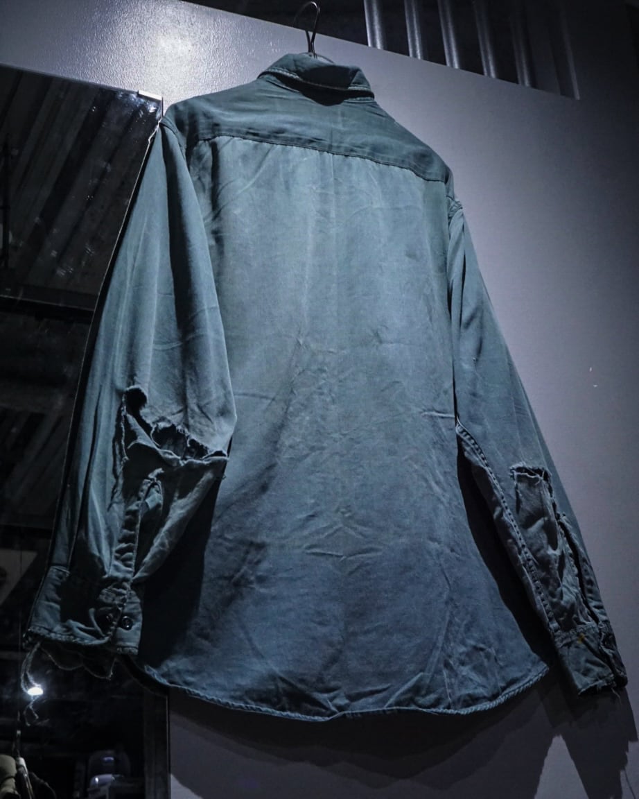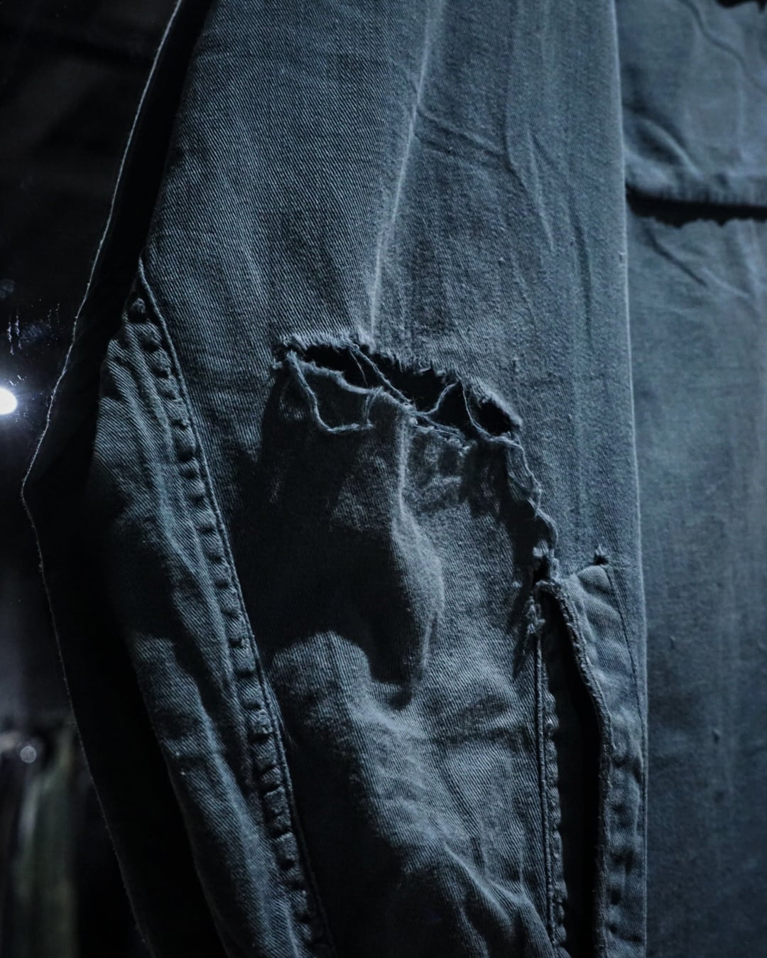 グリーンが抜け、くすんだ淡いトーンへと変化した色味が絶妙。さらにはボロのコンディションも最高で、袖や裾にかけて大胆に入るダメージ、裂けや擦れといったエイジングが◎
