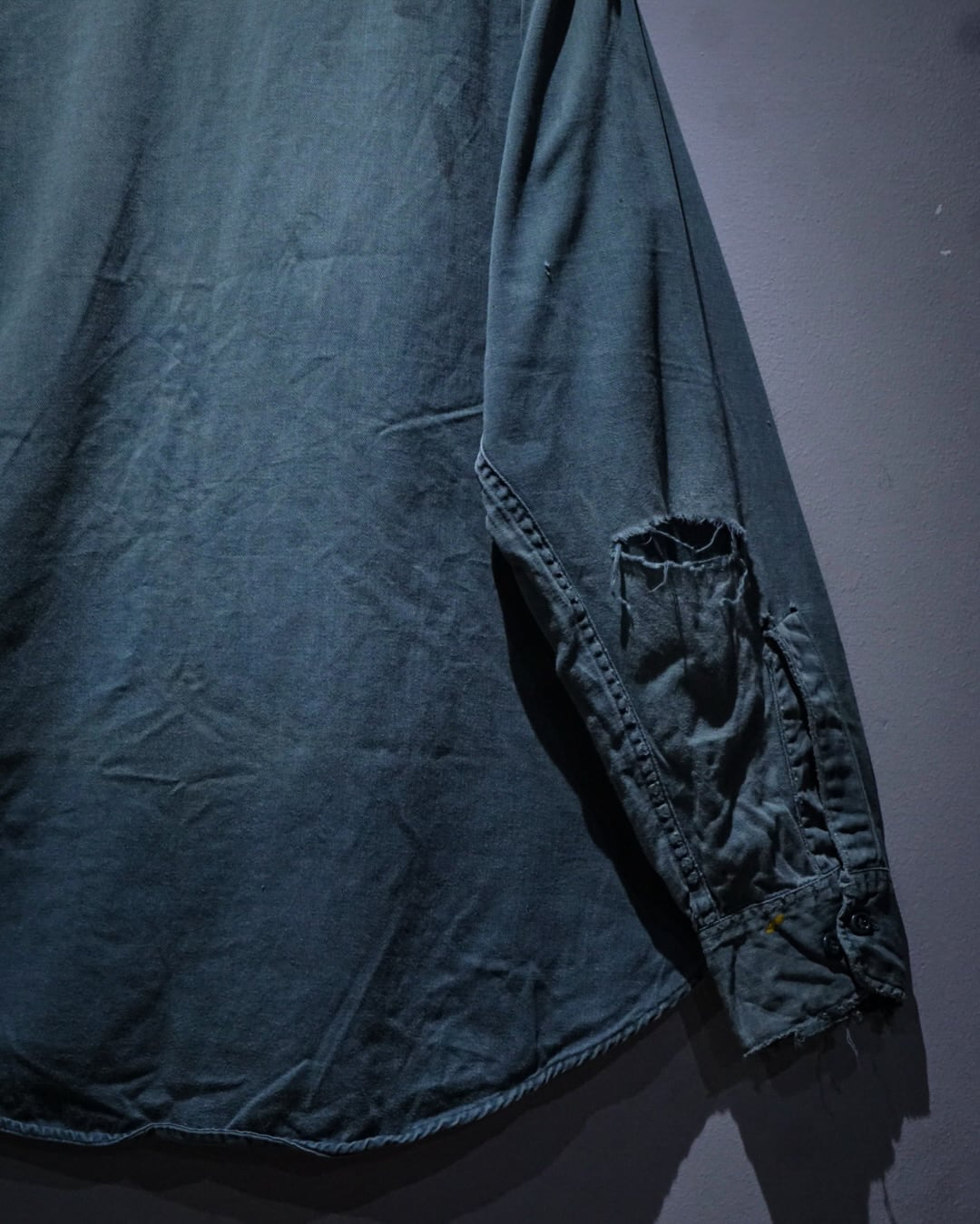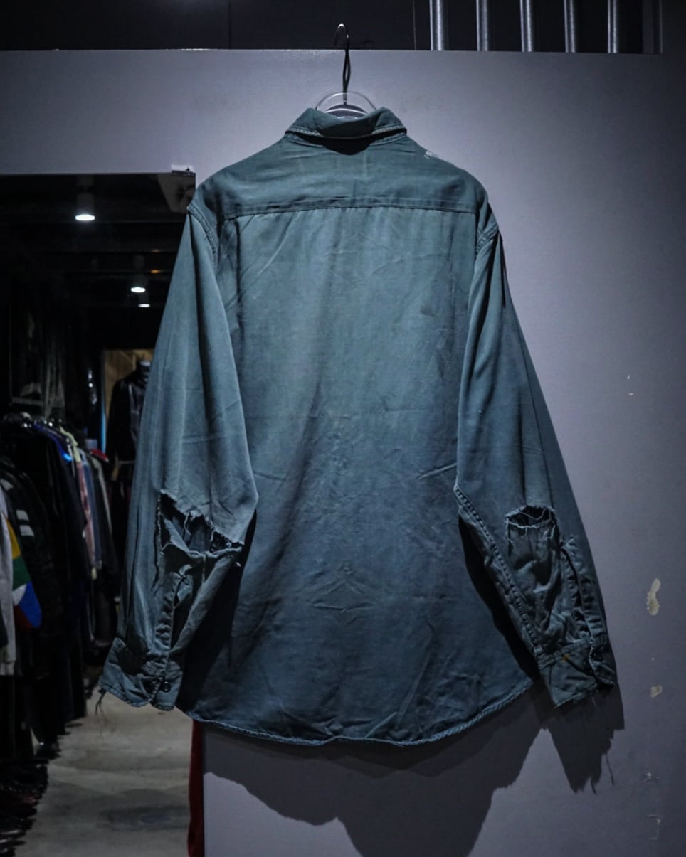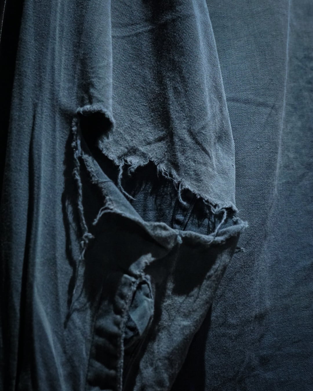 グリーンが抜け、くすんだ淡いトーンへと変化した色味が絶妙。さらにはボロのコンディションも最高で、袖や裾にかけて大胆に入るダメージ、裂けや擦れといったエイジングが◎