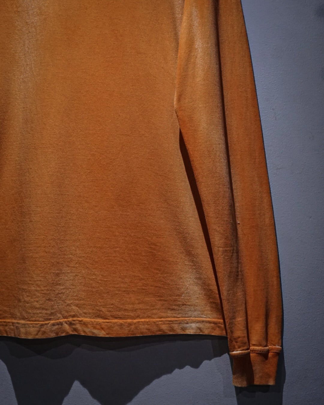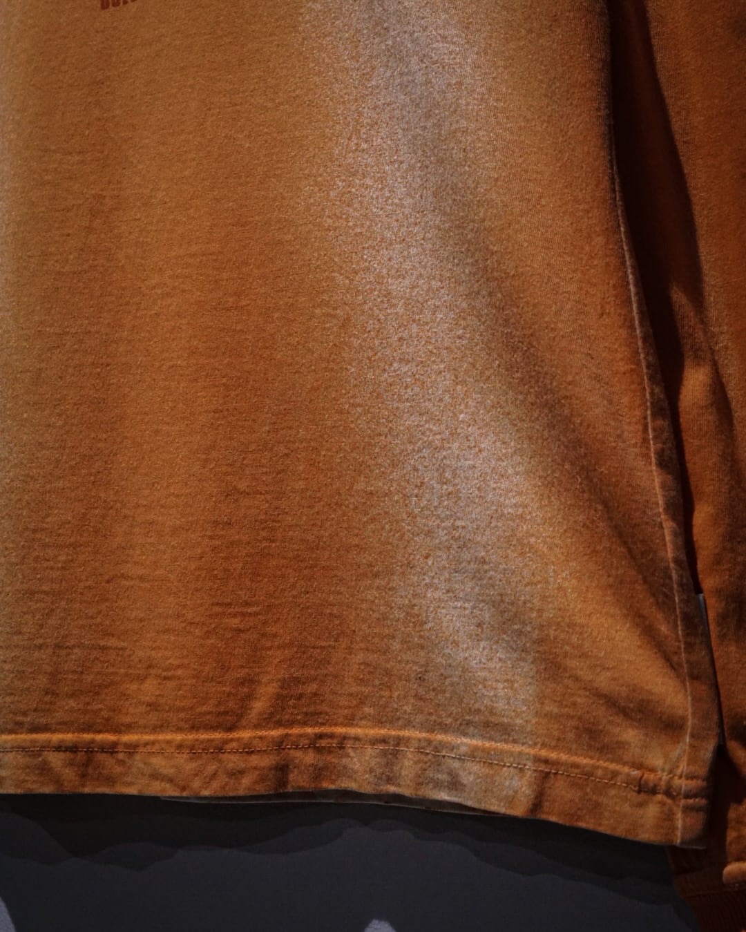 鮮やかなオレンジボディをベースに、意図的にプリントを薄めたフェード風の加工が施された1着。