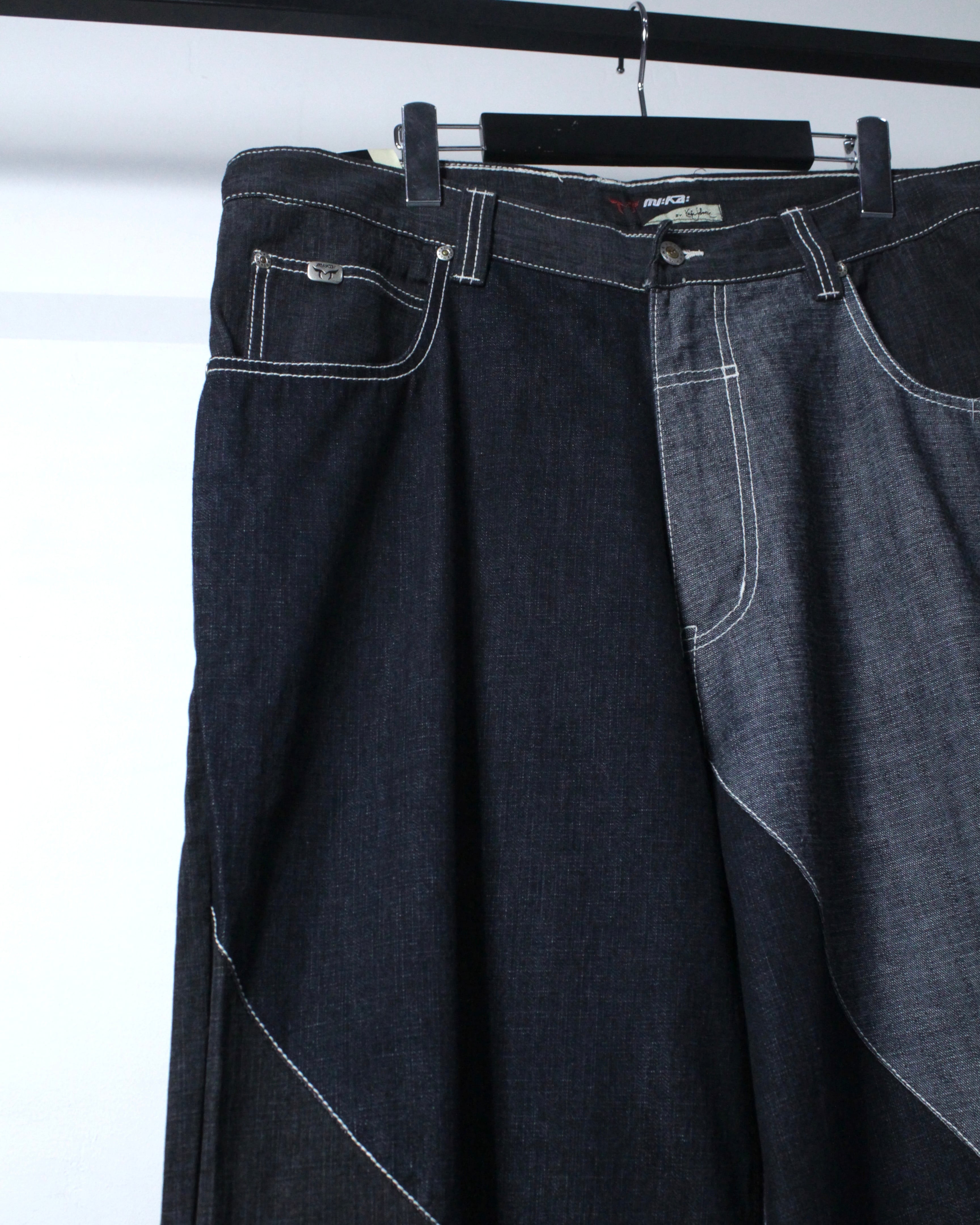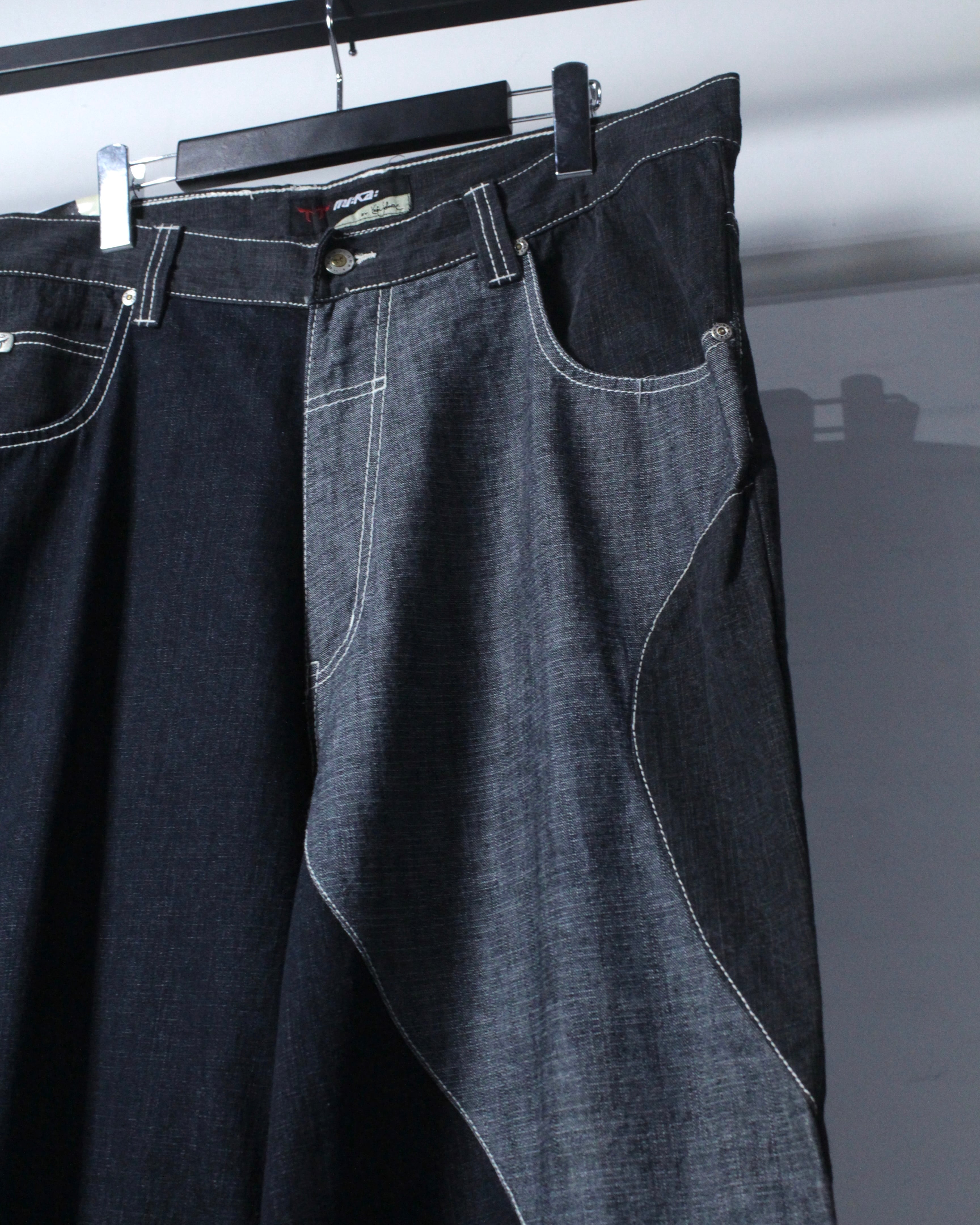 濃紺のデニムボディに、ライトオンスのデニムを大胆に切り替えたデザイン。曲線を描くような切り替えラインとホワイトステッチがアクセントとなり、シンプルながらも強い存在感を放つ一本に仕上がっています。