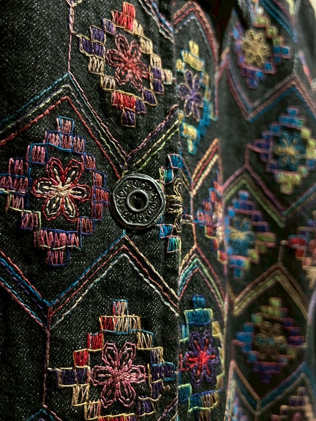 コシのあるブラックデニムをベースに、ヘキサゴン柄、花柄刺繍を施した1着。色彩の奥行きと繊細な刺繍の重なりによって、立体的な表情を生み出しています。