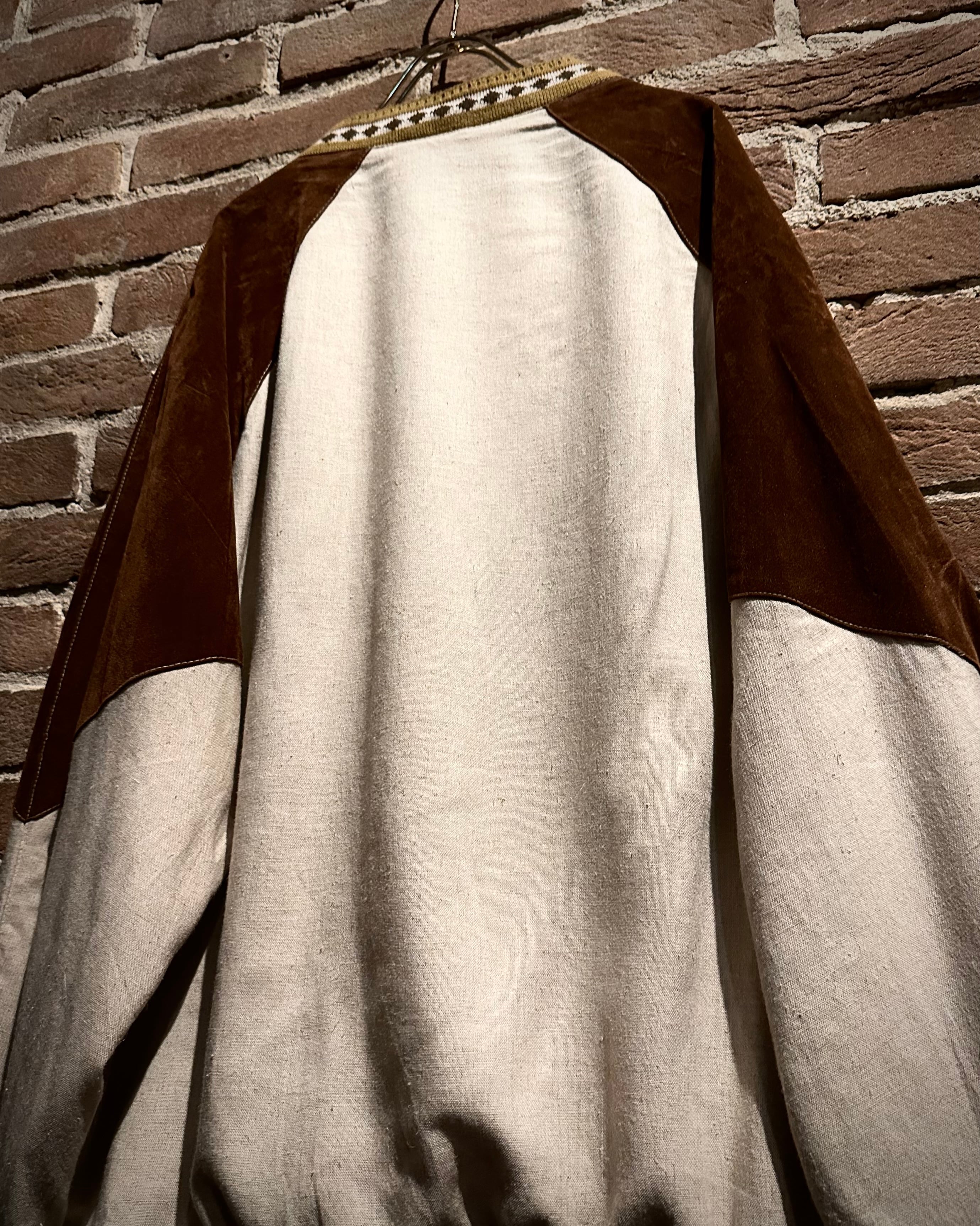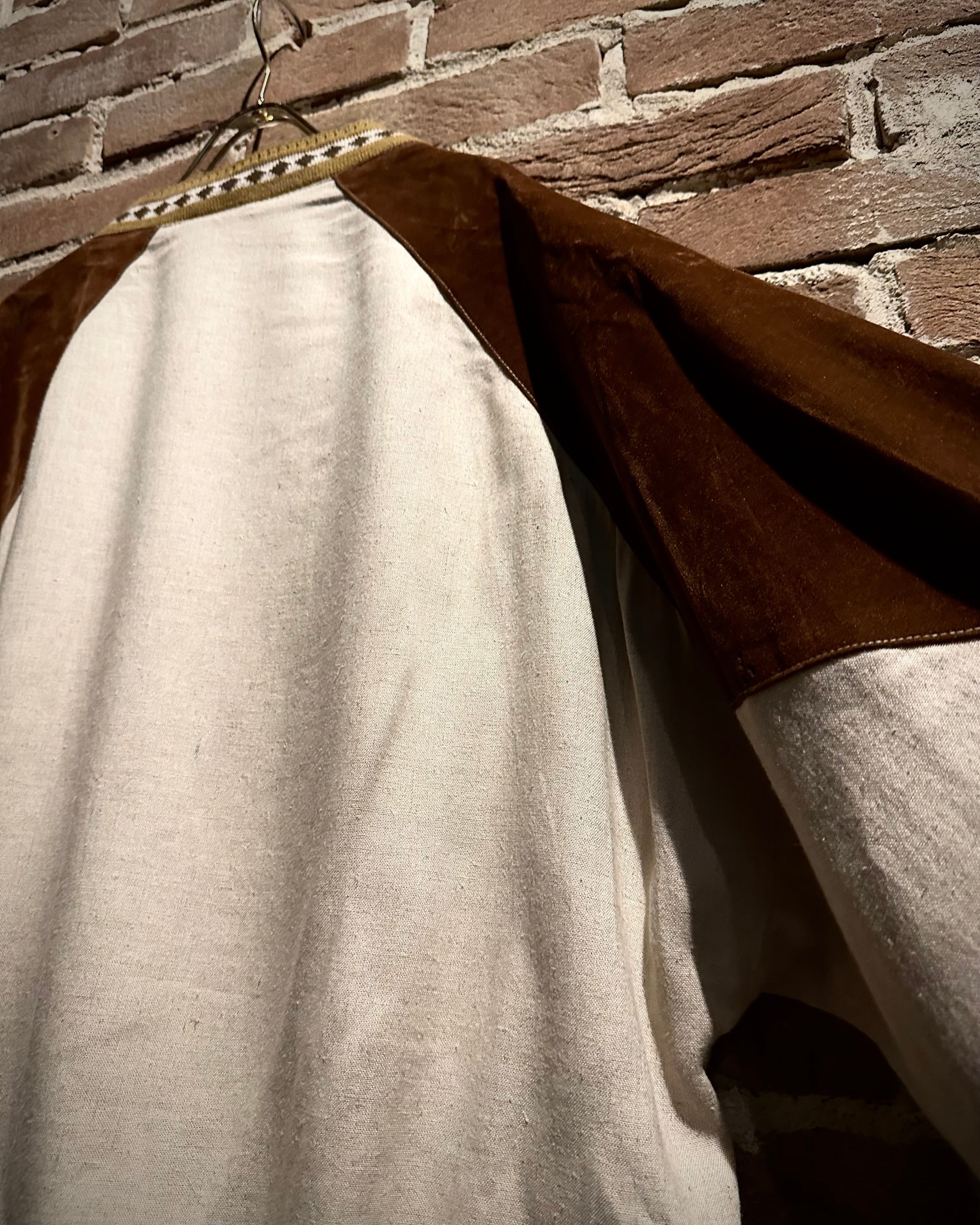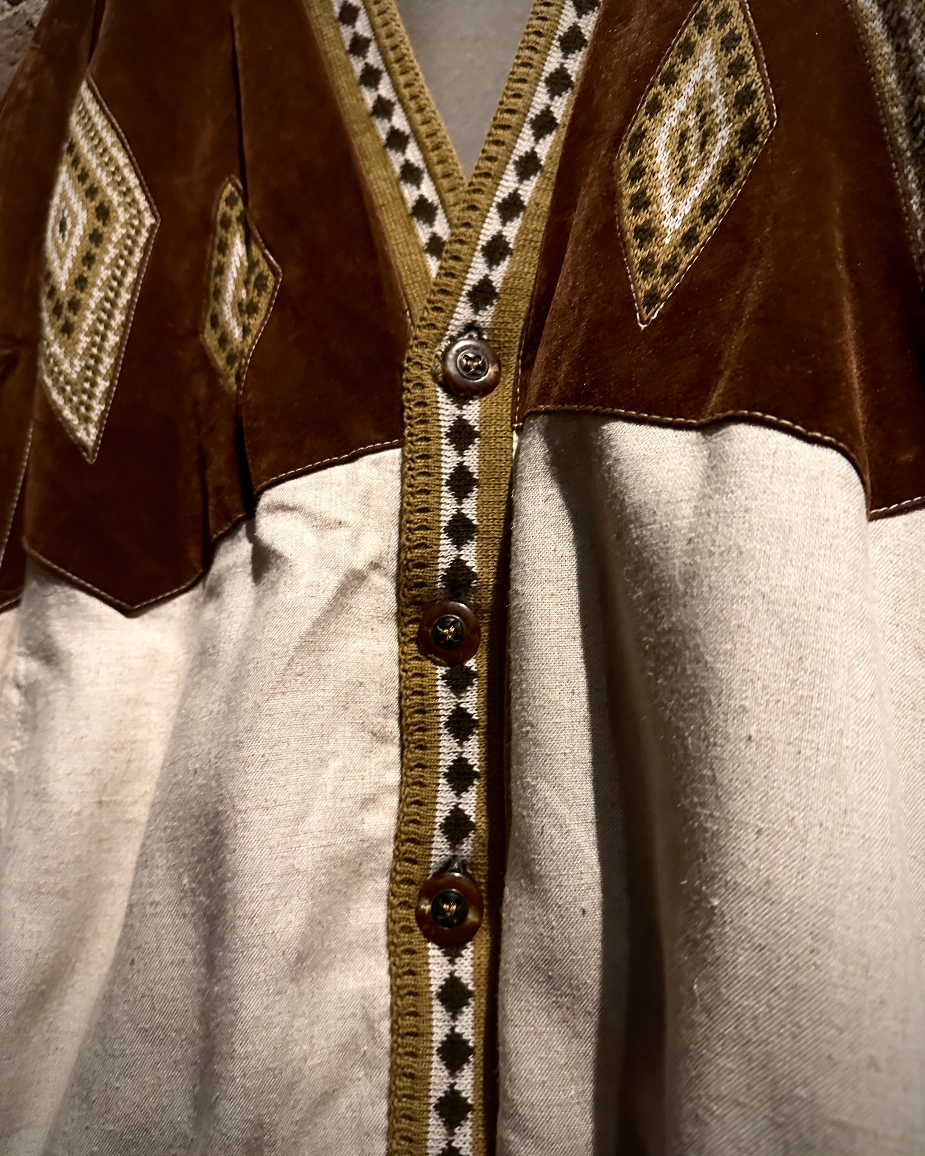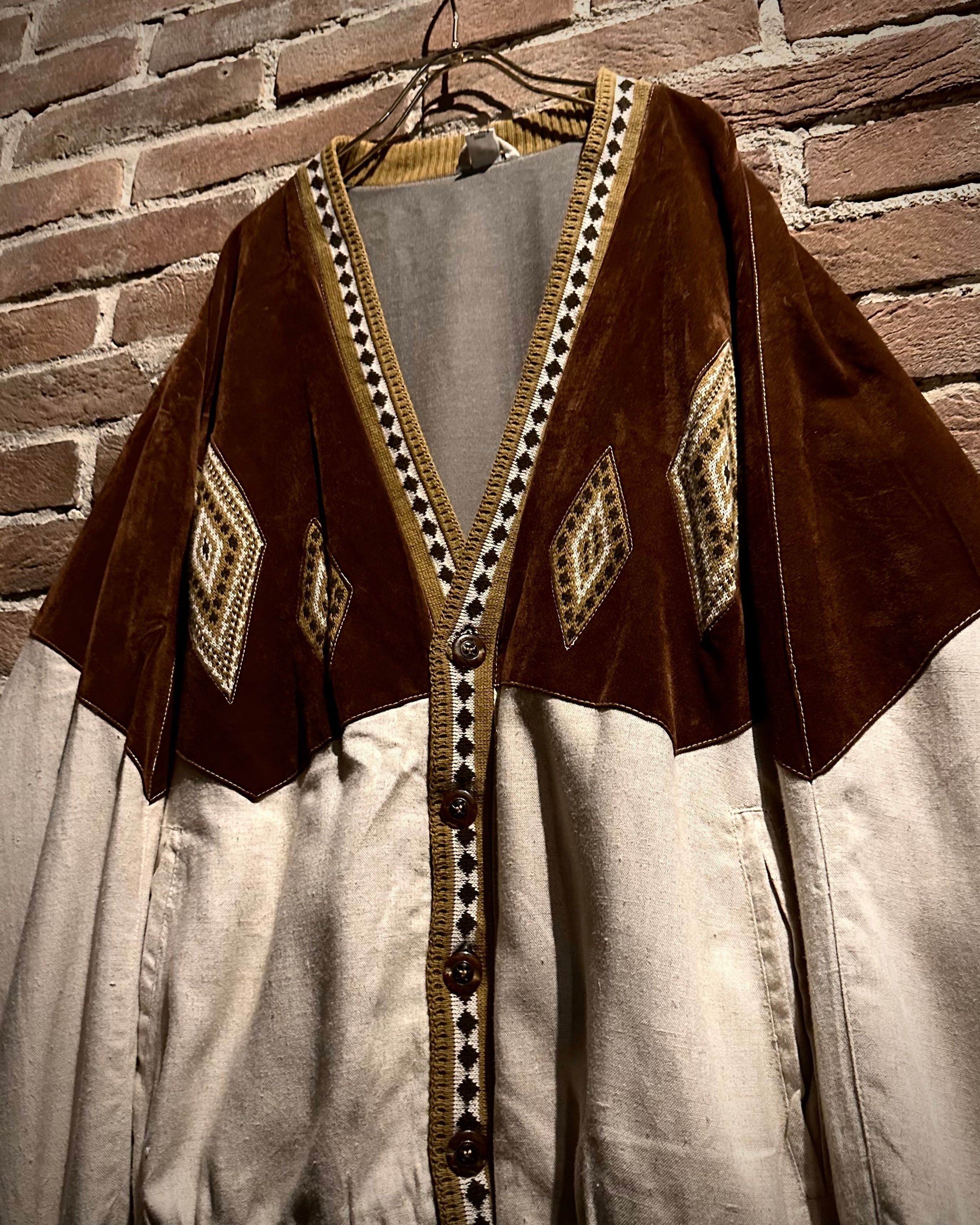 ナチュラルな温かみを持つリネン素材と、ハリと光沢を帯びたベルベットを大胆に切り替えたユーロヴィンテージのカーディガンジャケット。