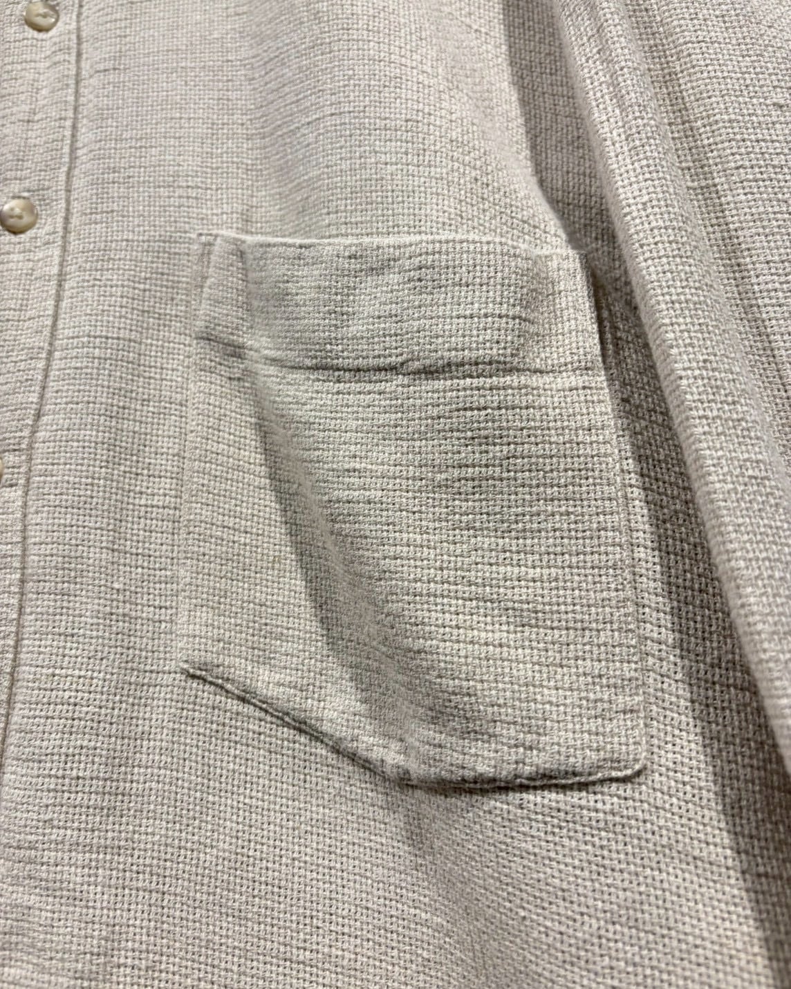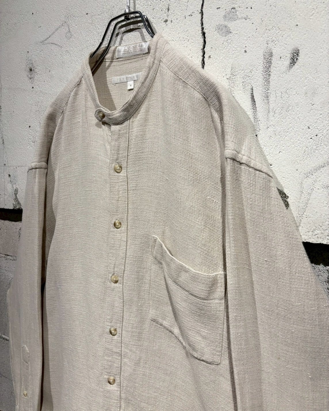 首元はすっきりとしたバンドカラー仕様、胸ポケットのみを配した控えめなデザインが、素材の良さをより一層引き立てていますね。