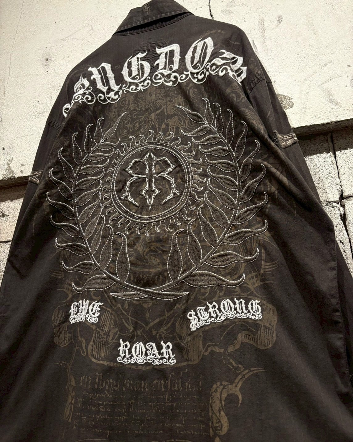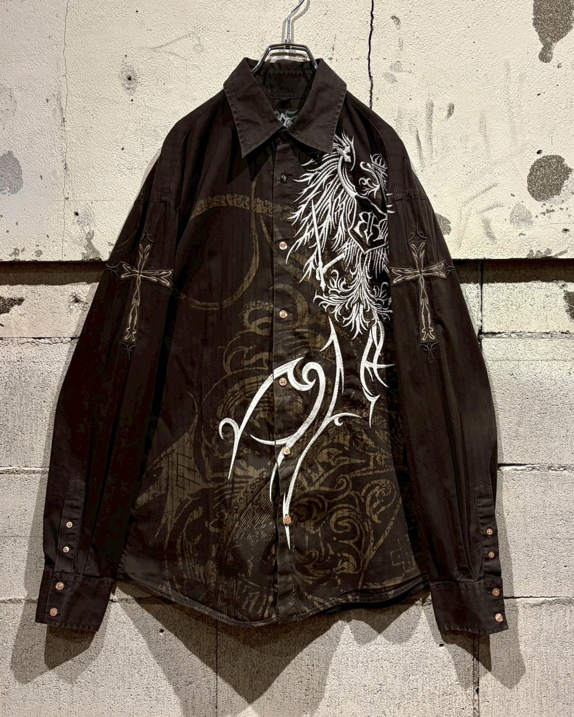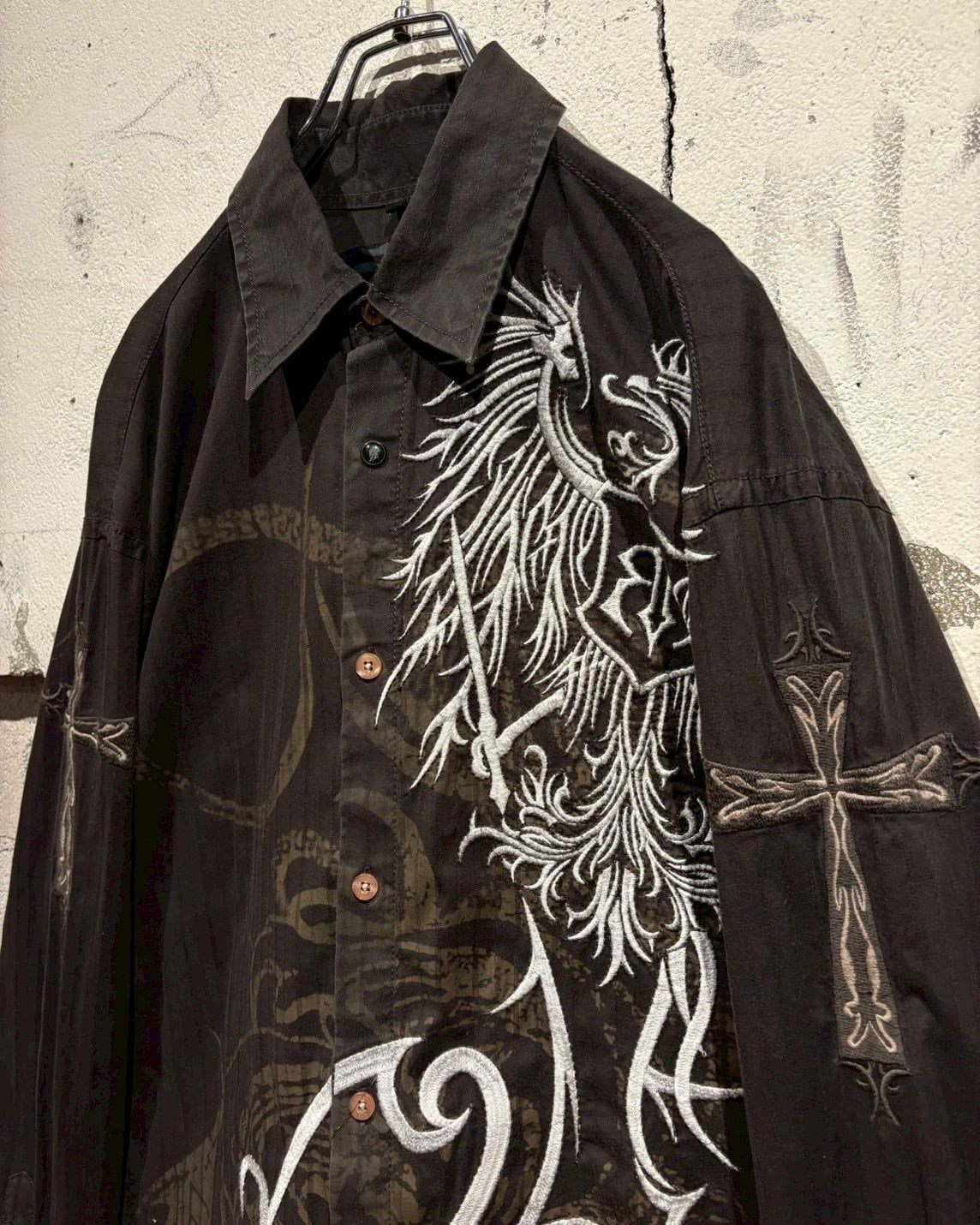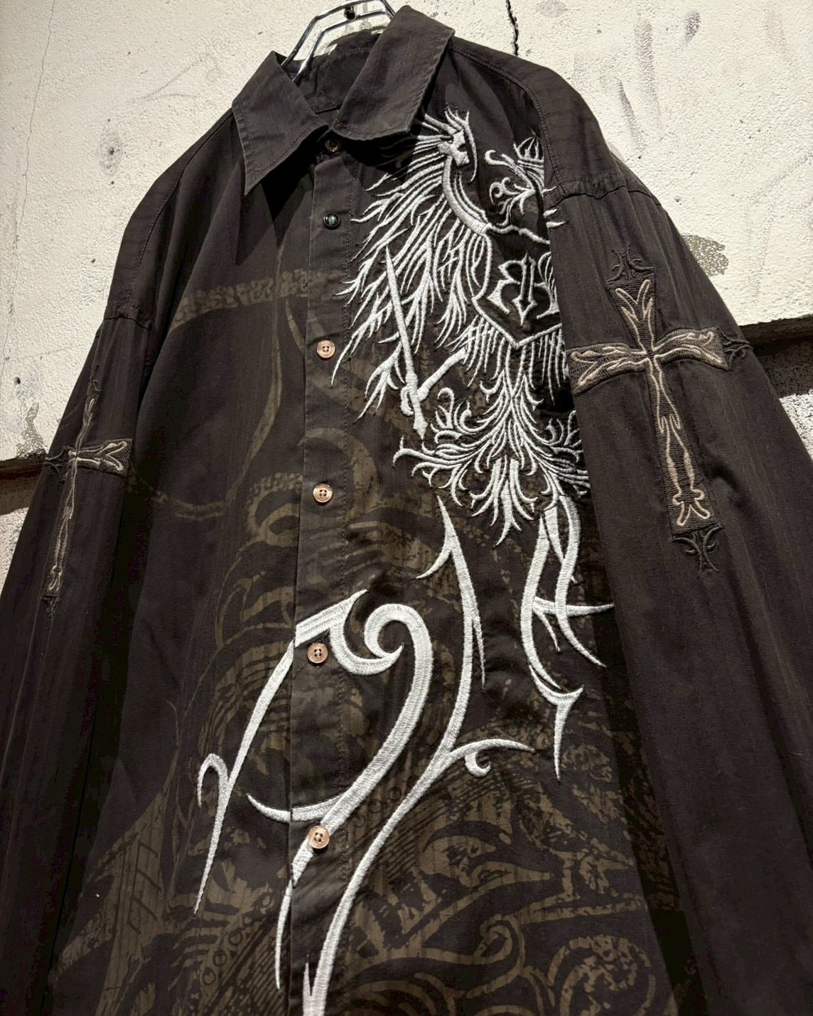 柔らかな生地感のボディに、全面へゴシックなデザインを落とし込んだ長袖シャツの逸品。