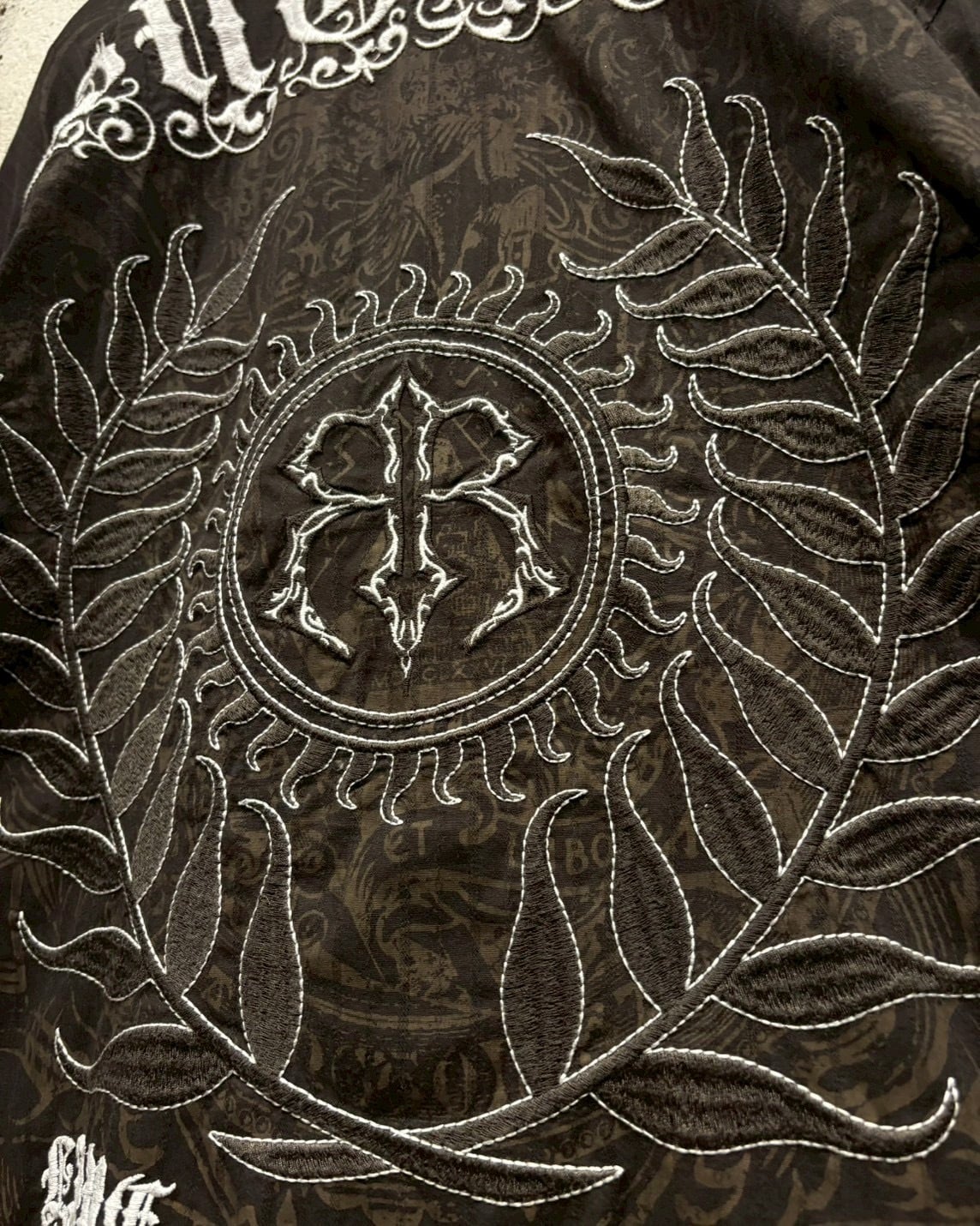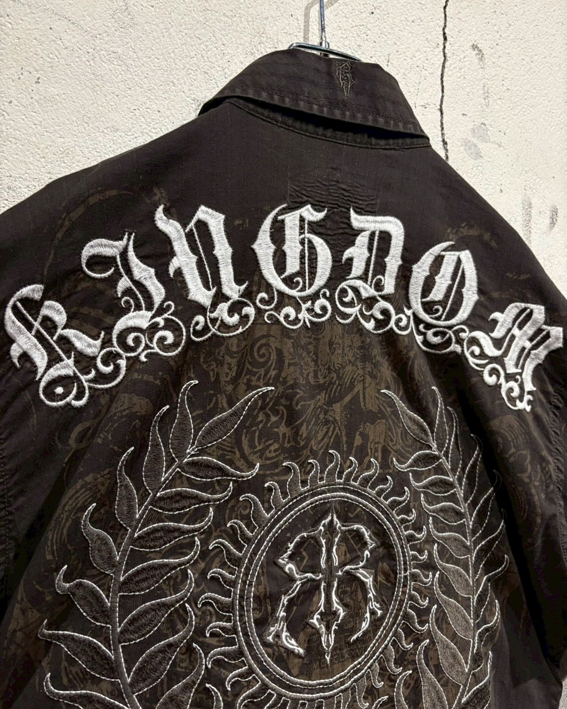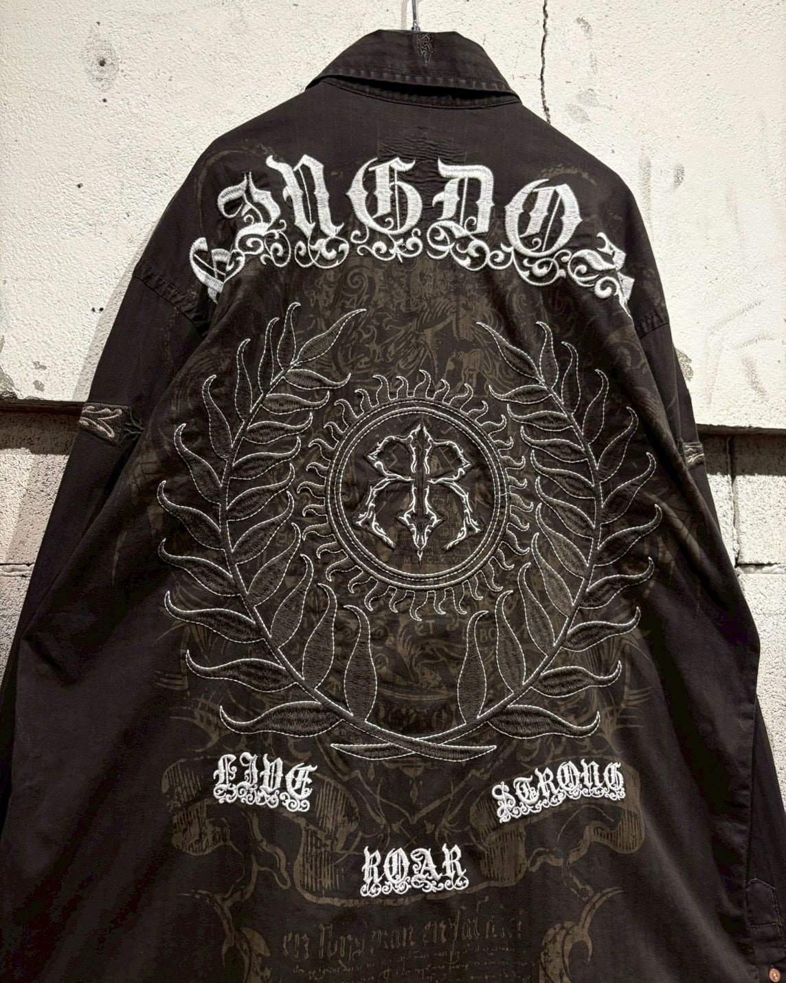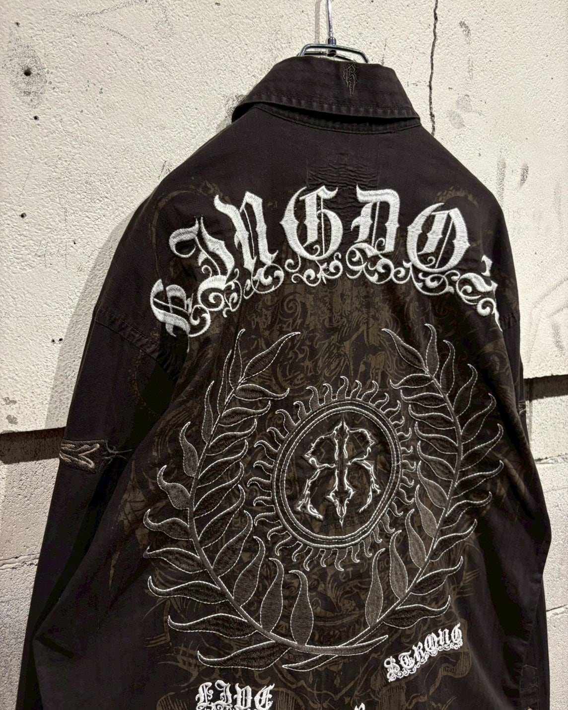 柔らかな生地感のボディに、全面へゴシックなデザインを落とし込んだ長袖シャツの逸品。