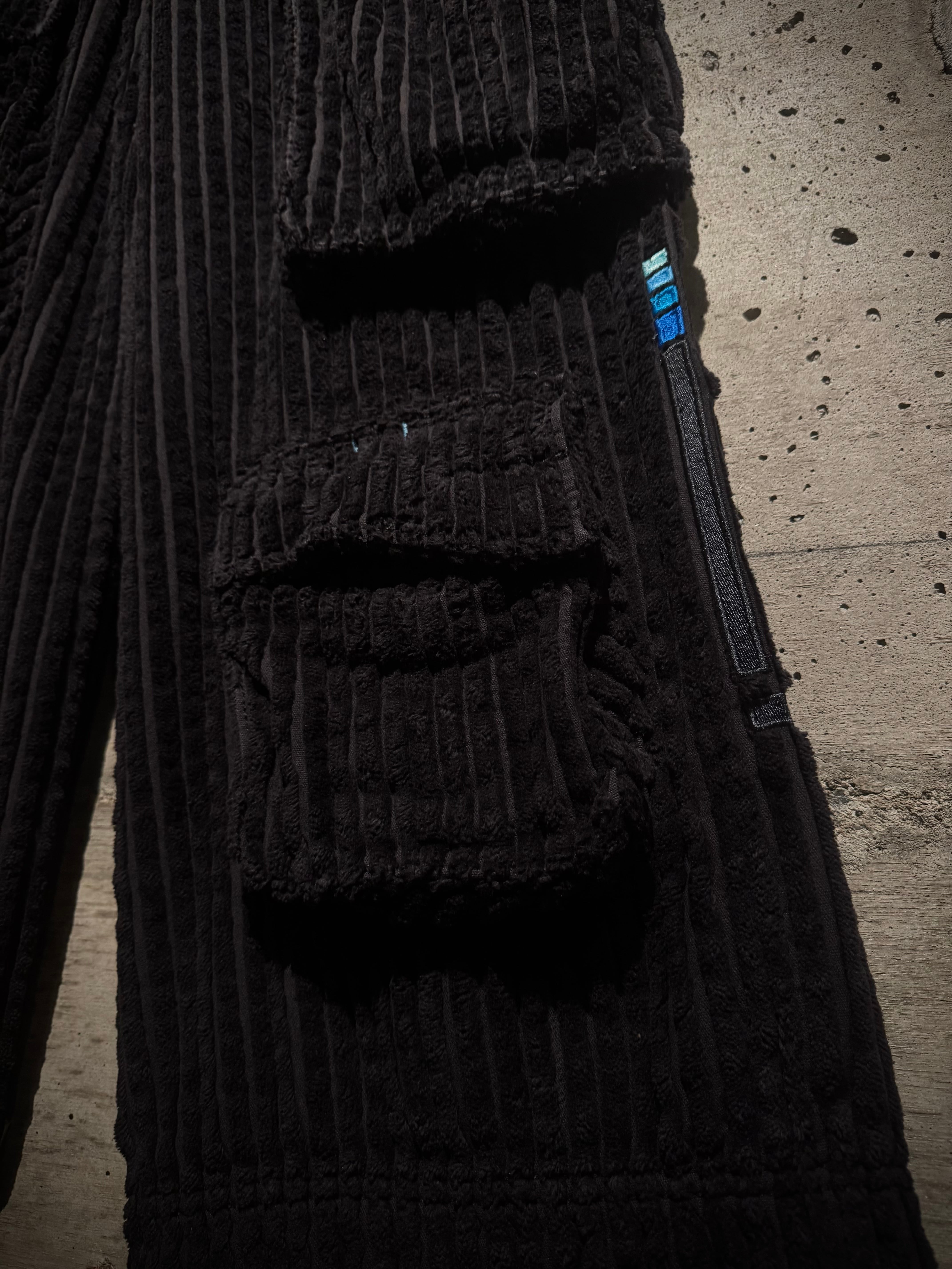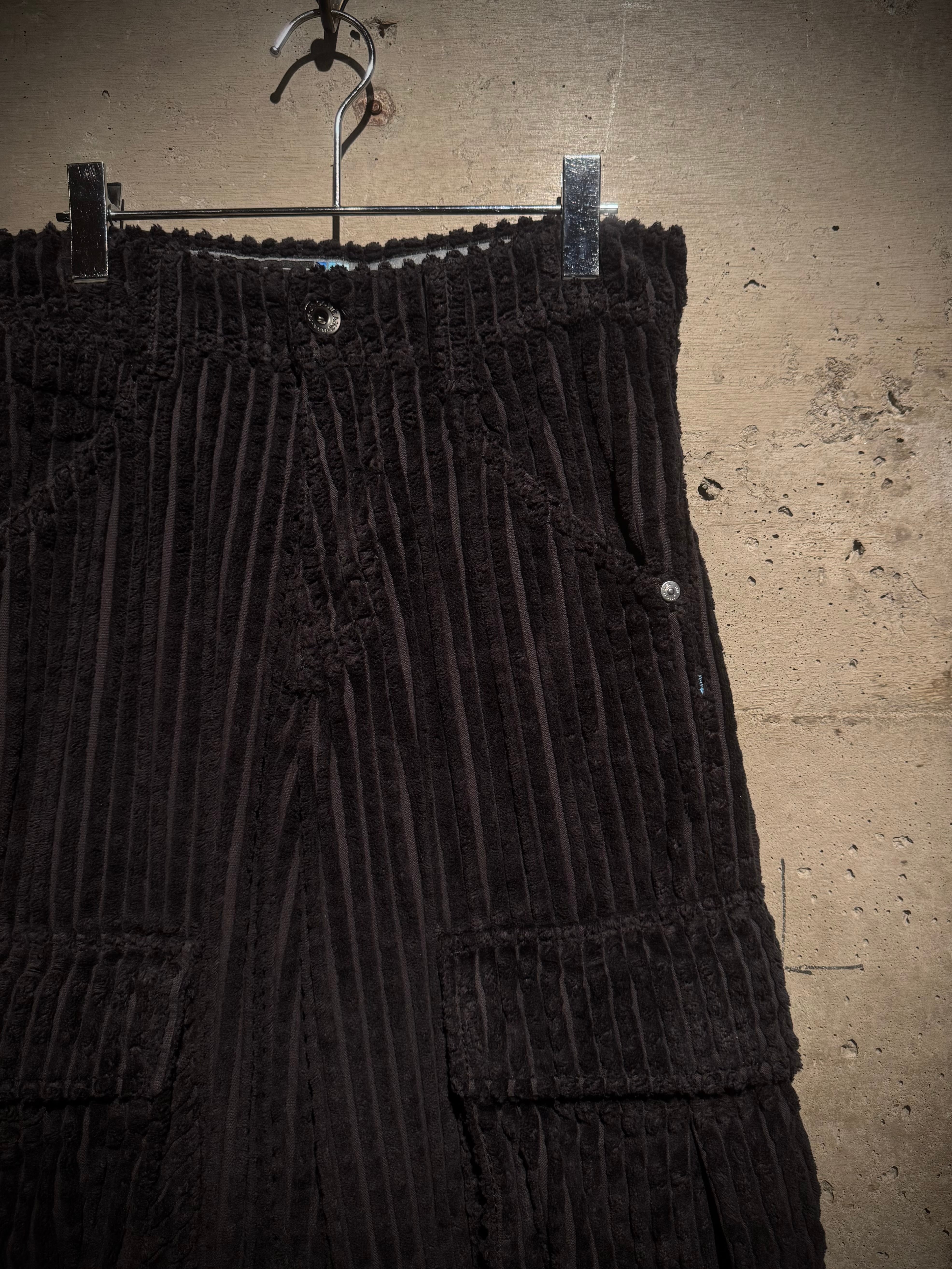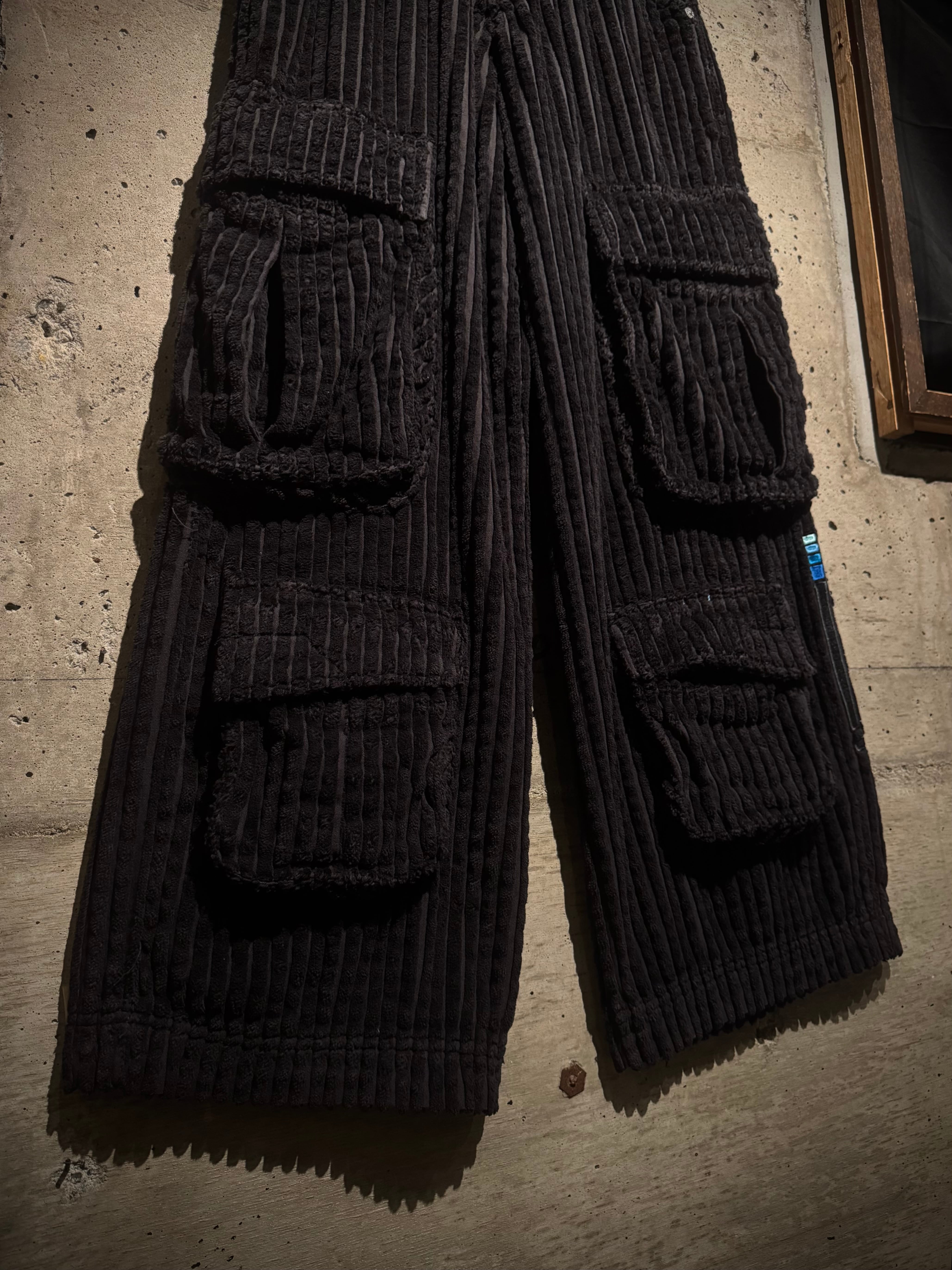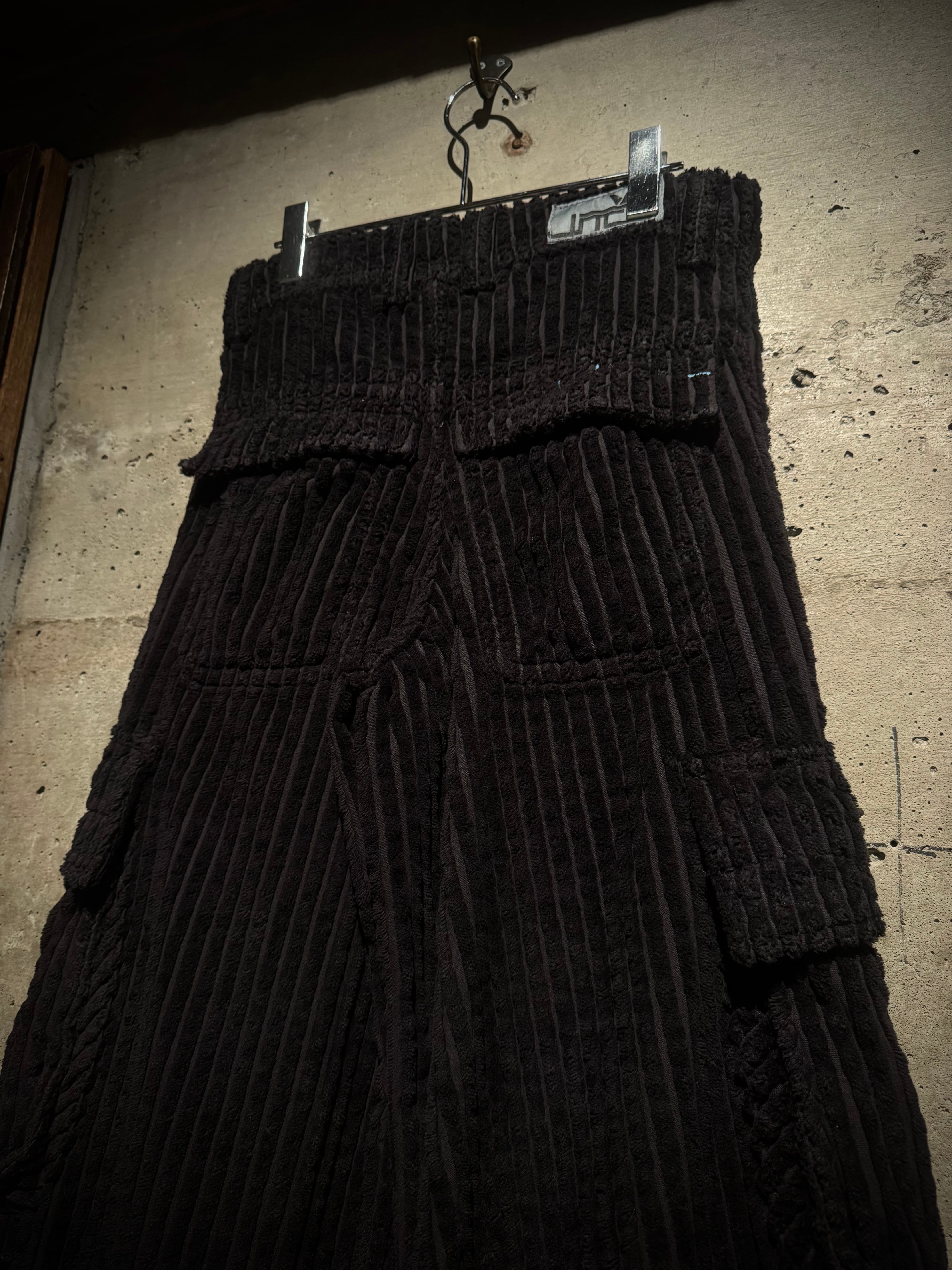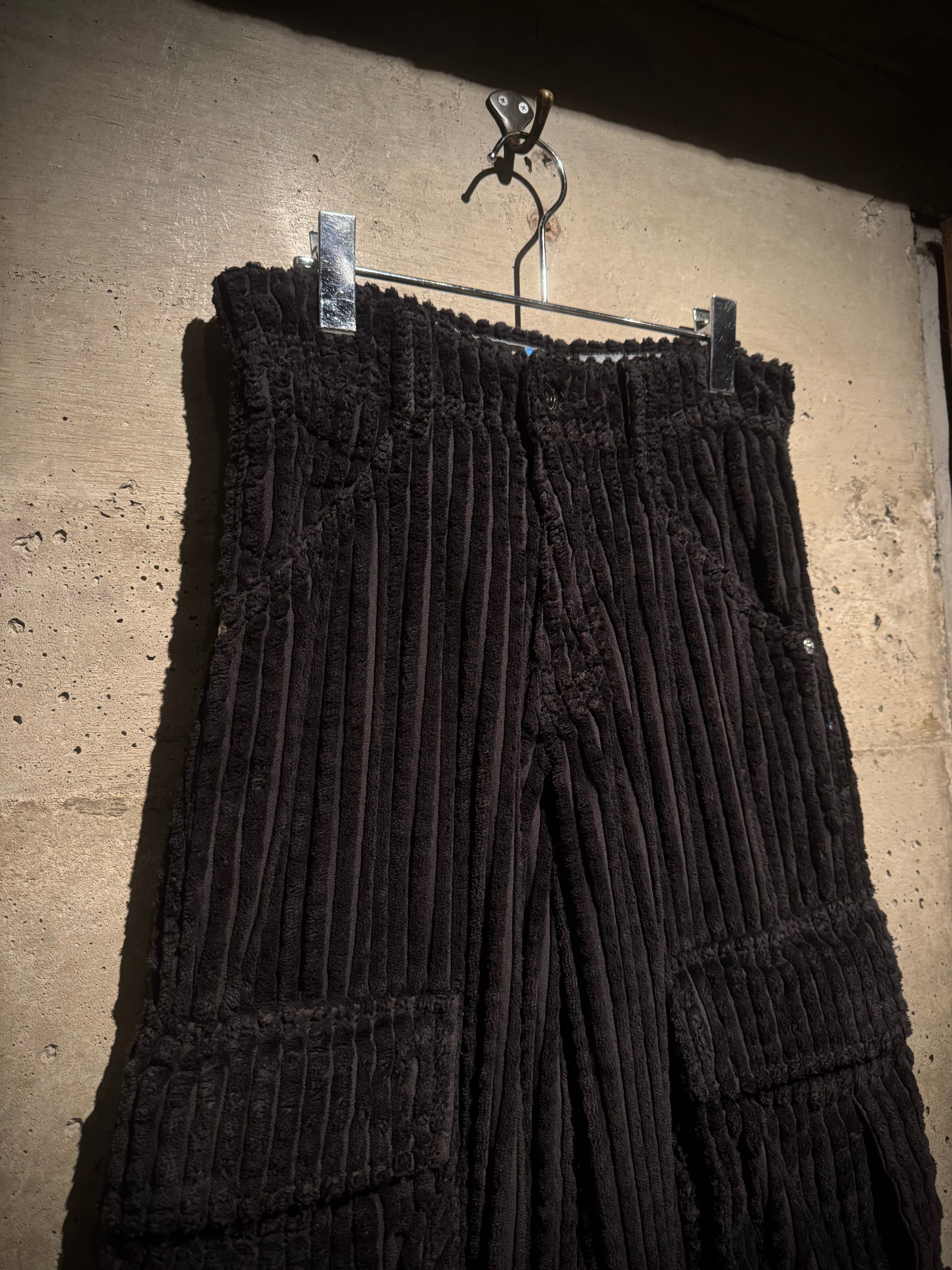 肉厚で畝の立ったファットコーデュロイを使用した、稀有なレイヴパンツ。通常デニムで見かけることの多いレイヴパンツをコーデュロイで仕立てた非常に珍しい一本で、柔らかな起毛感と重みのある表情が合わさった、独特の存在感を放っています。