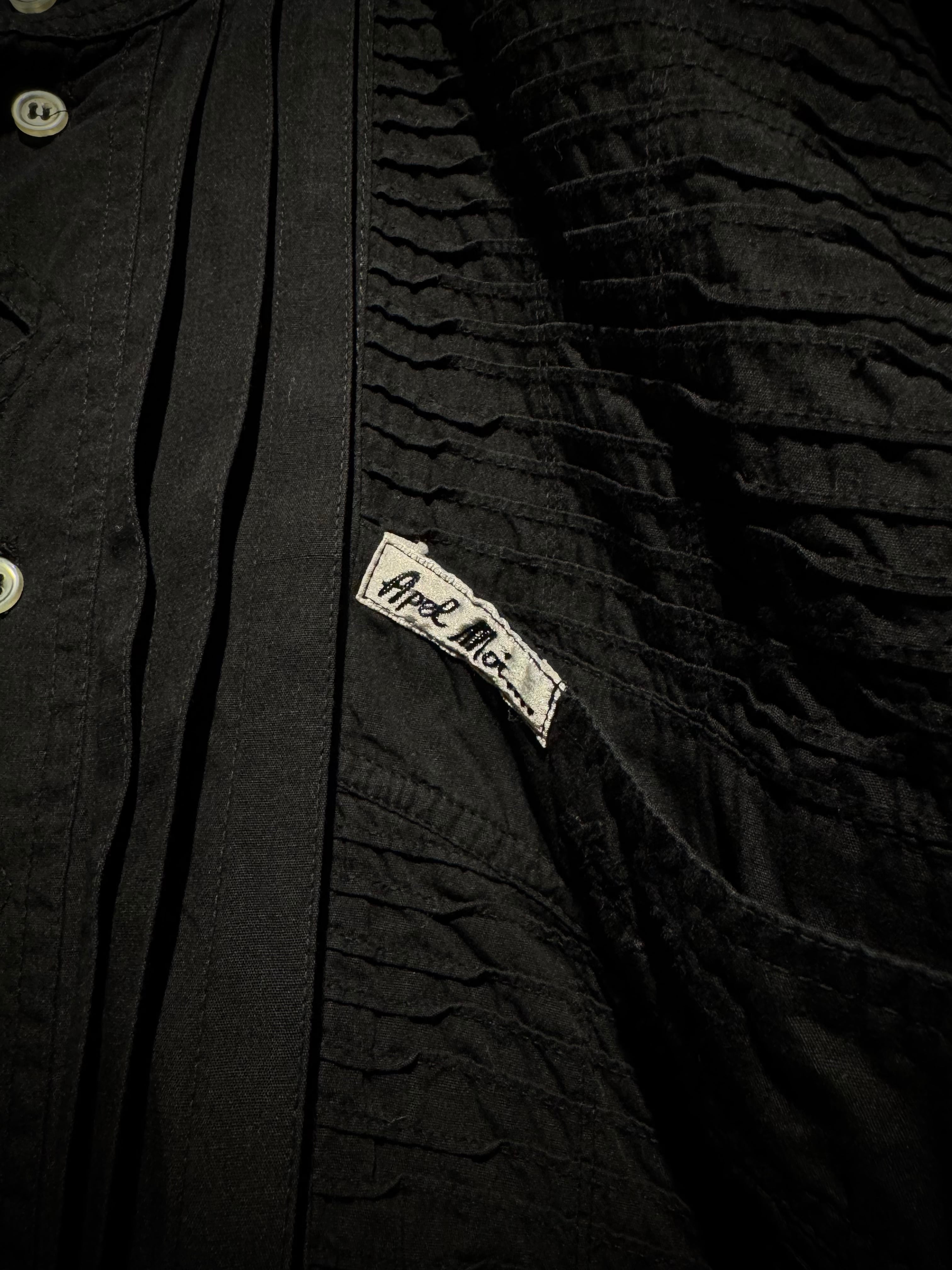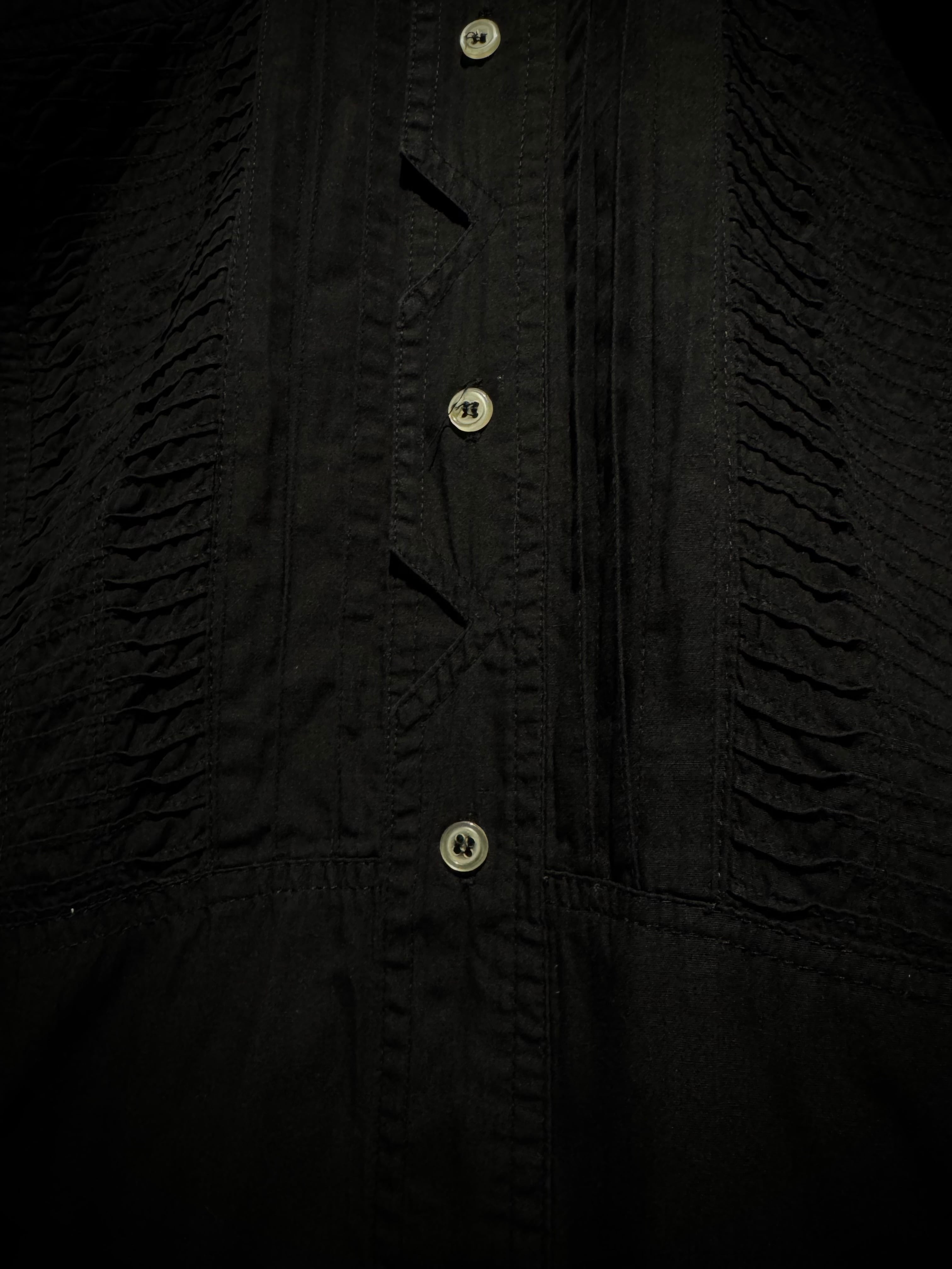 コットンを用いた柔らかな生地をベースに、フロントにはジグザグに走る変形前立てを採用。その外側に縦のプリーツ、さらにその外側に細かな横プリーツを重ねることで、モードな雰囲気を放つ1着に仕上がっています。