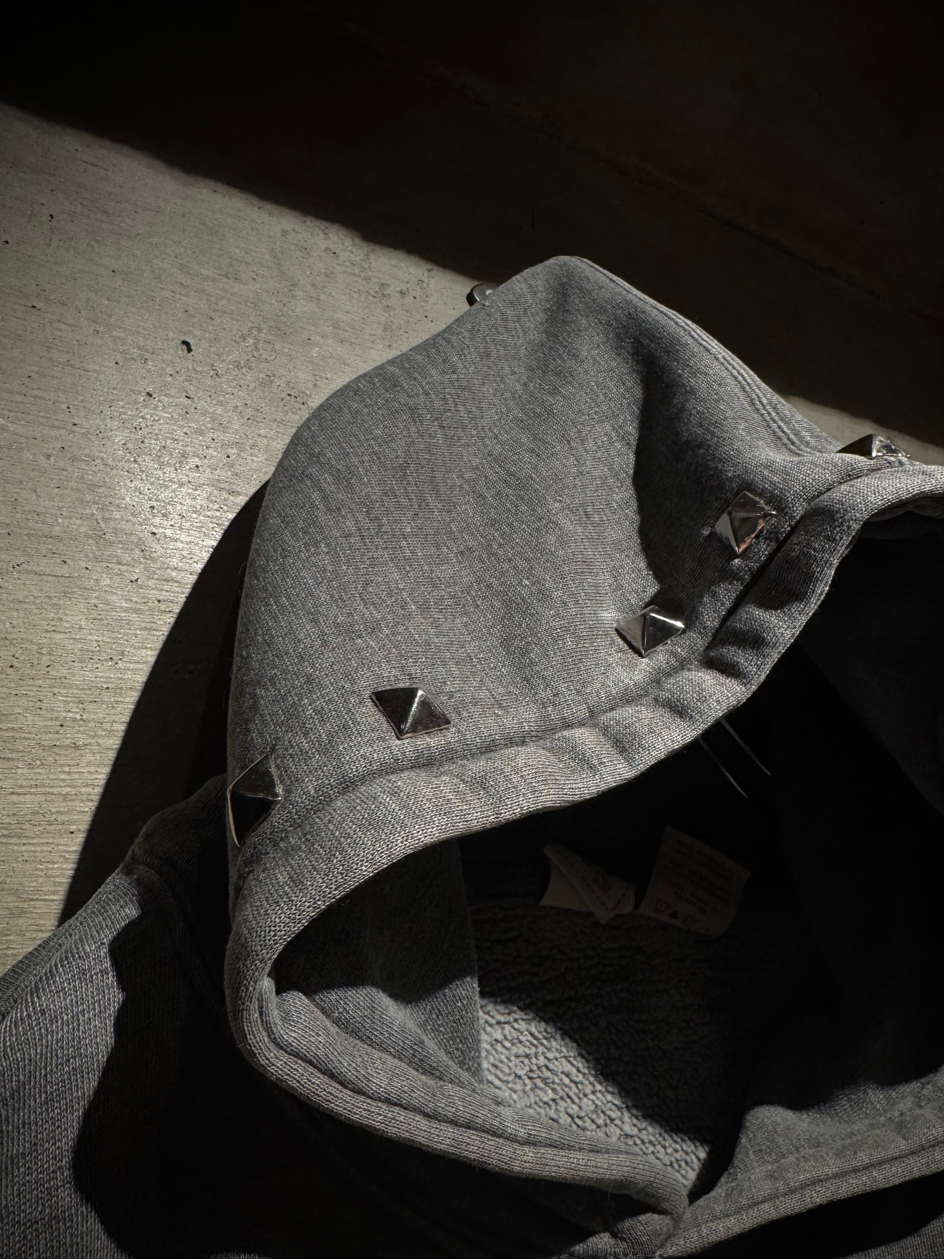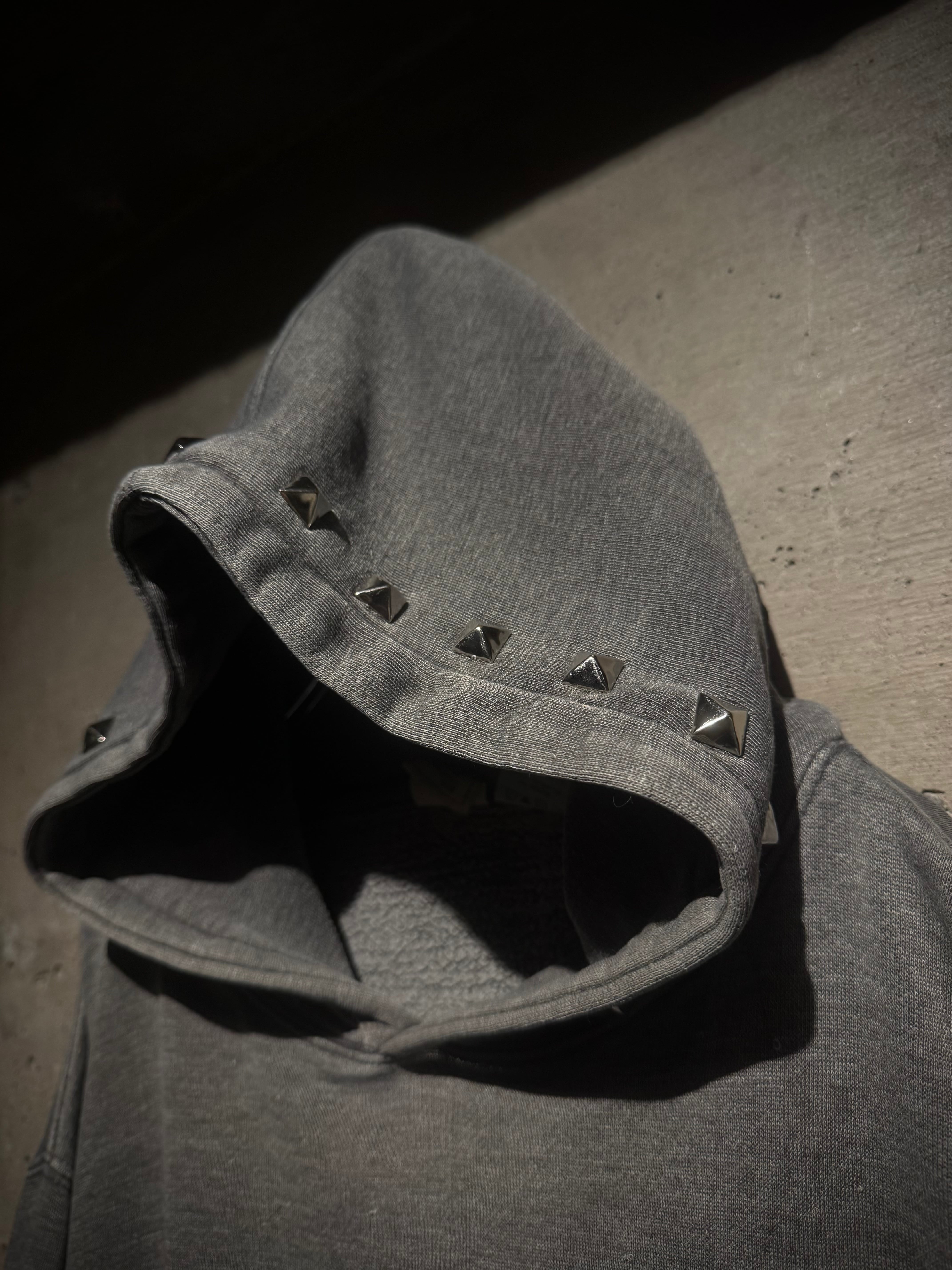 さらにフード周りにはスタッズを打ち込み、グラフィックのアグレッシブな印象と相まって強い個性を感じさせますね。フェードの効いたグレーボディの雰囲気に、程良いダメージのアクセントも◎