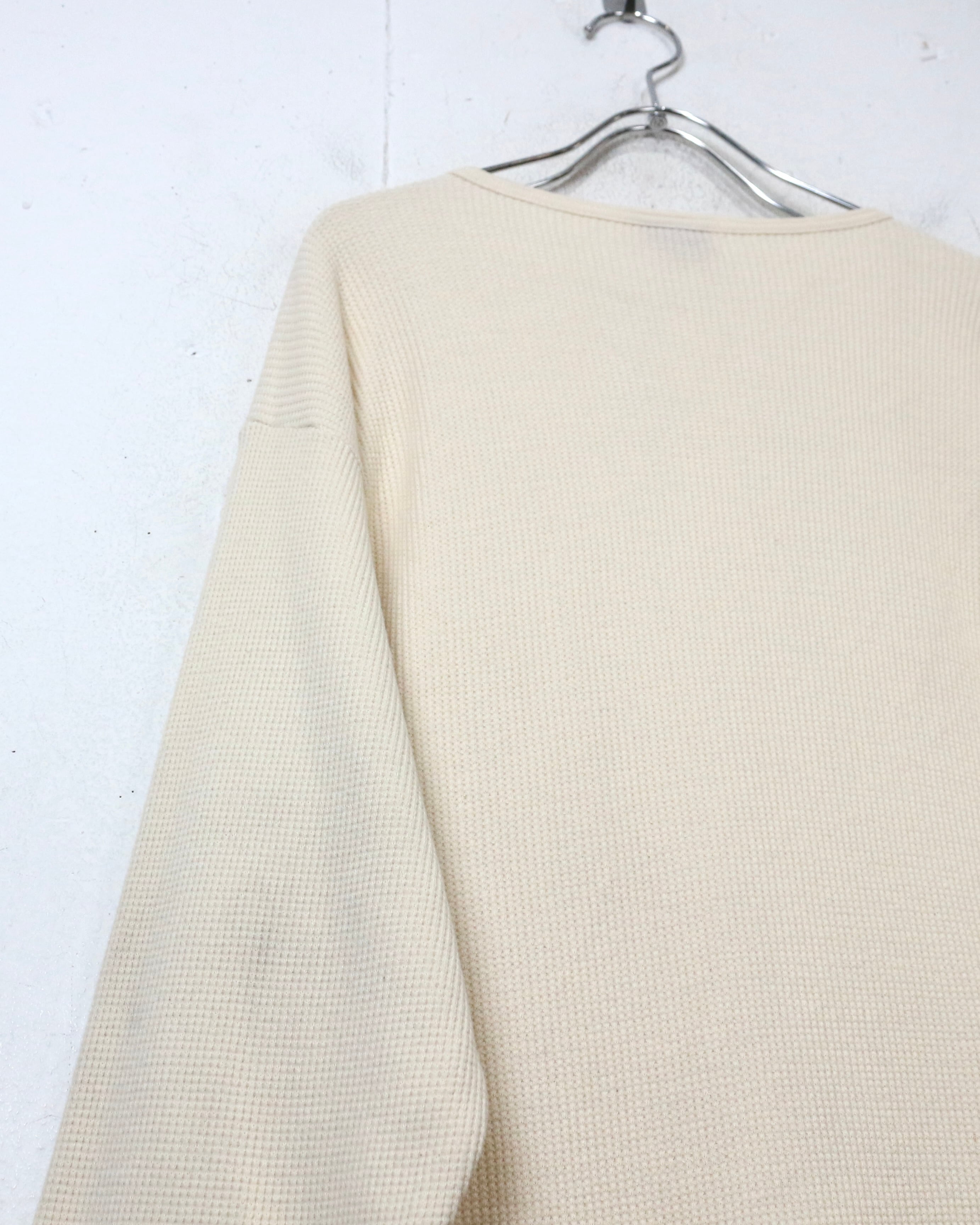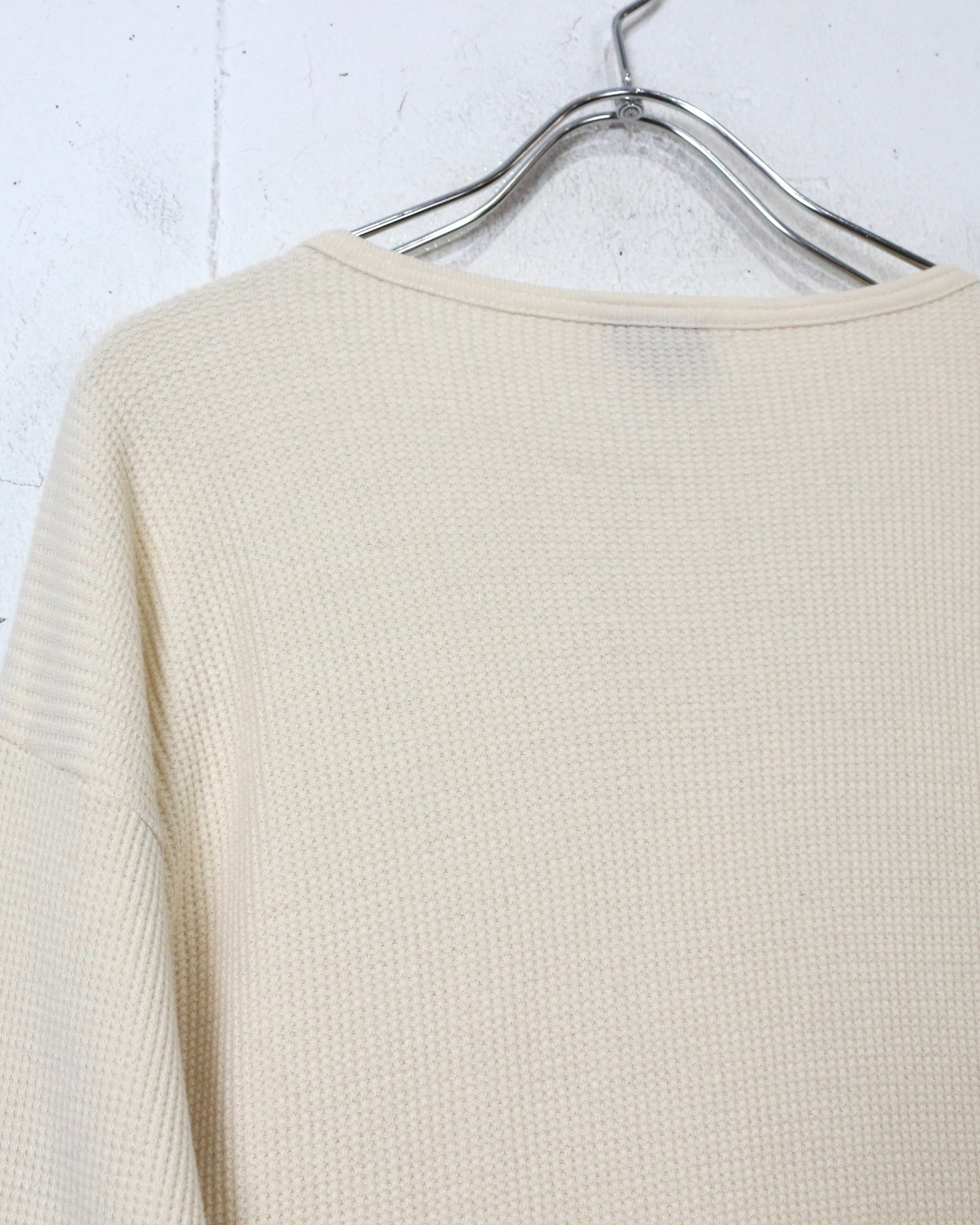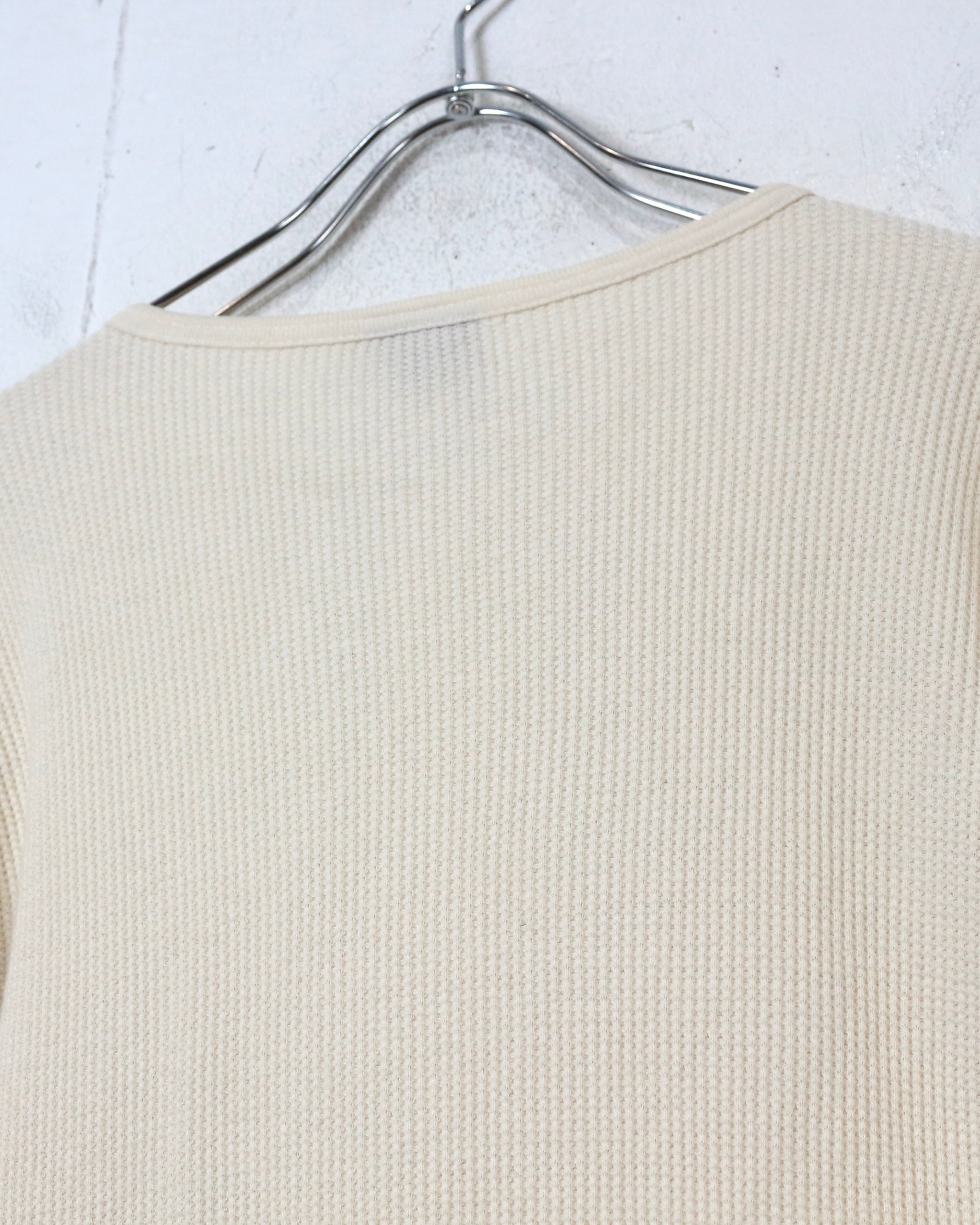 ボディには柔らかくも程よい肉感を持つコットンワッフル生地を採用。凹凸のある編み地が空気を含み、保温性と通気性を両立しつつ、肌離れの良い快適な着心地に仕上がっています。