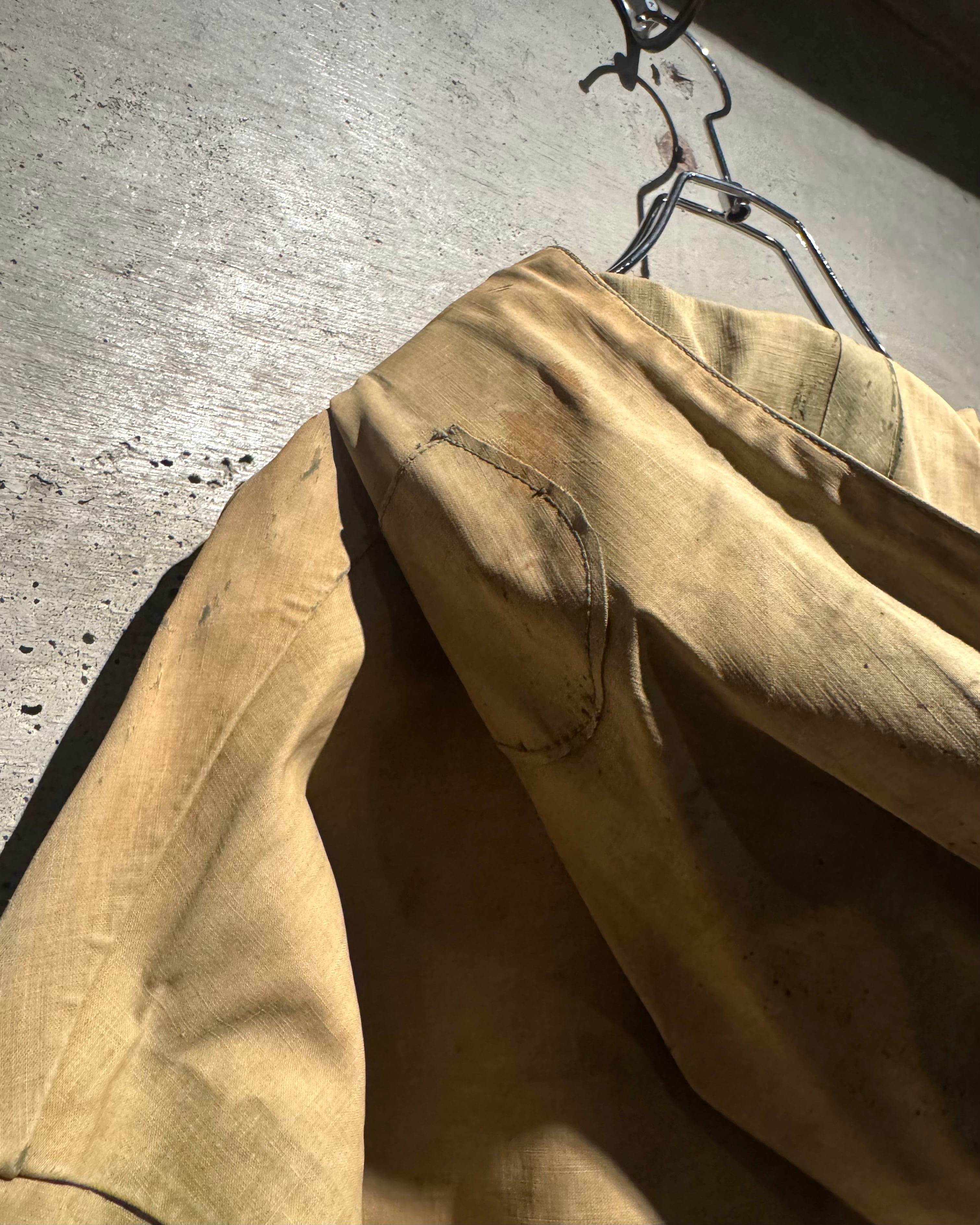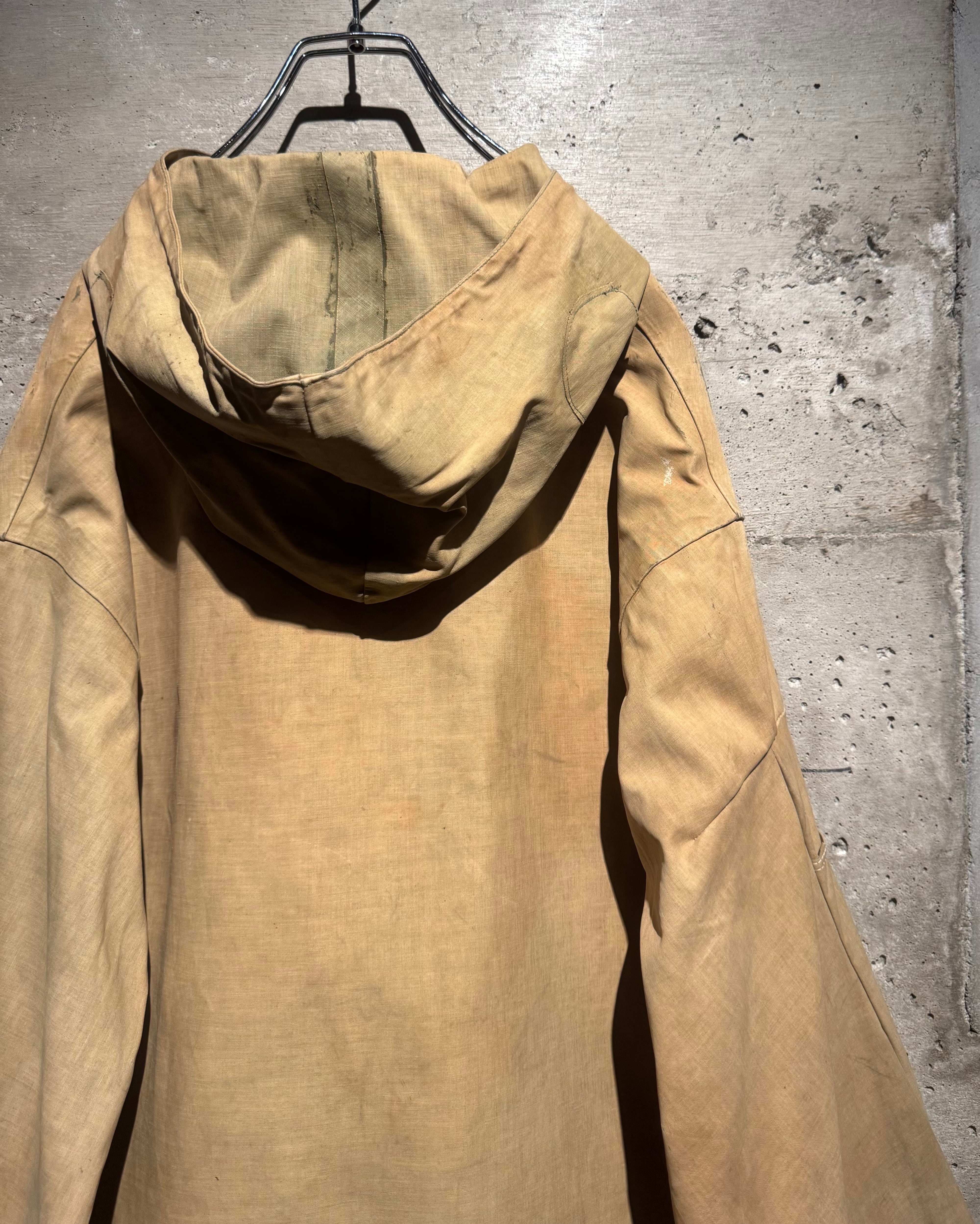 身幅やアームは広めに設計しつつ、着丈は短めで野暮ったさを感じさせないシルエットバランスも◎ラバーコーティング特有の質感に加え、経年による汚れやダメージ等、ヴィンテージとしての背景を感じさせつつ、今のファッション感にもしっかりとハマってくれます。