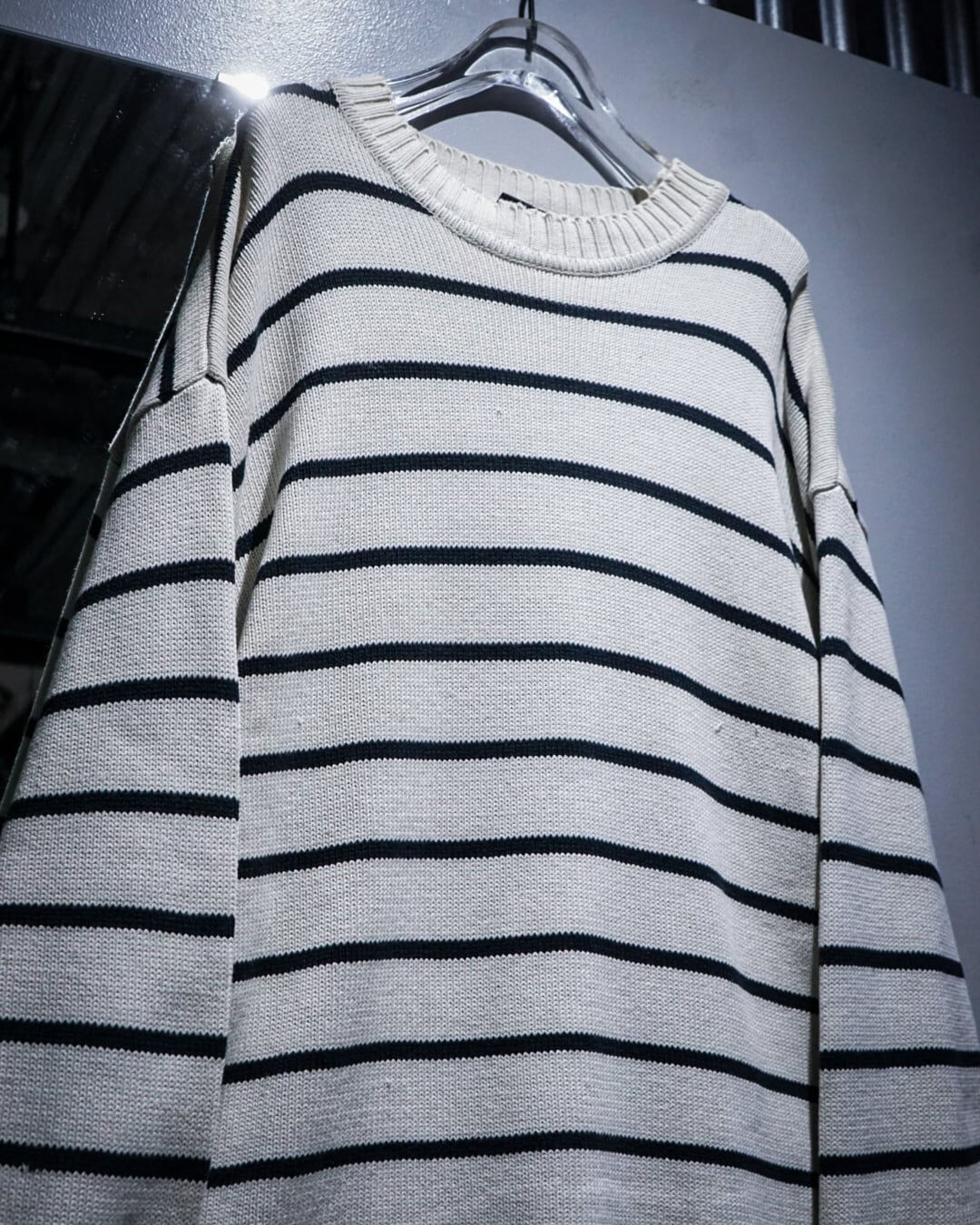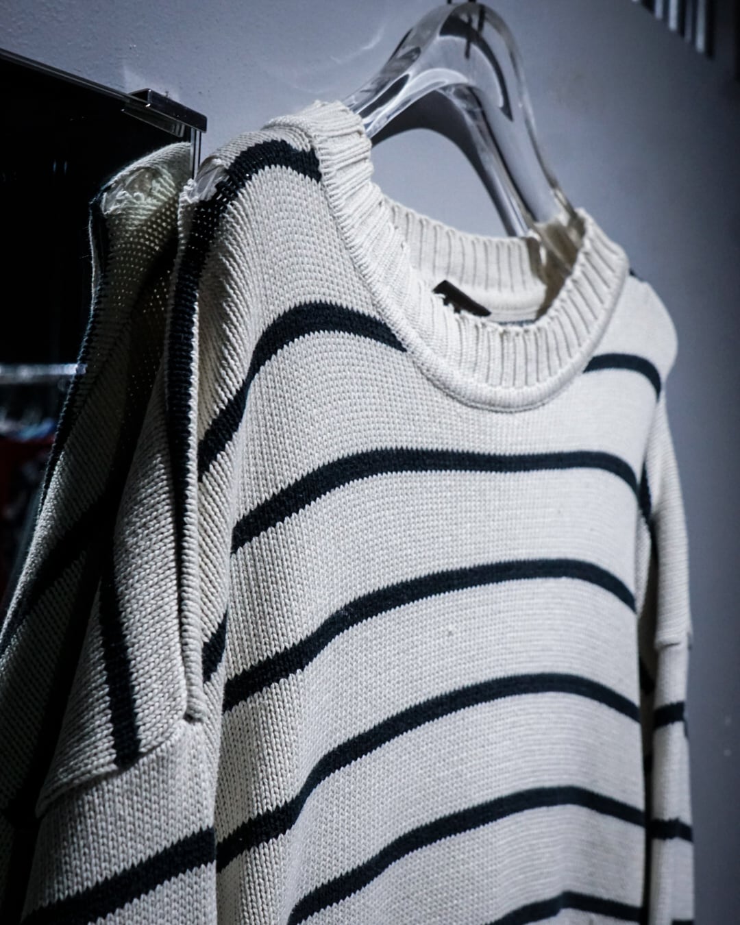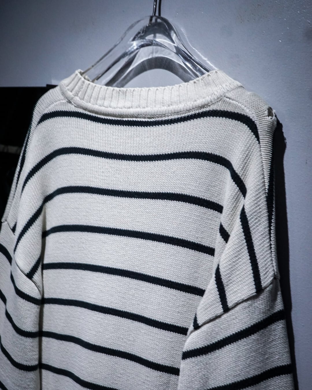 肩部分にはダメージが入り、いわゆる“ちょいボロ”なコンディション。この抜け感が逆にスタイリングに奥行きを生み、クリーンなボーダーに対して程よいラフさをプラスしてくれます。