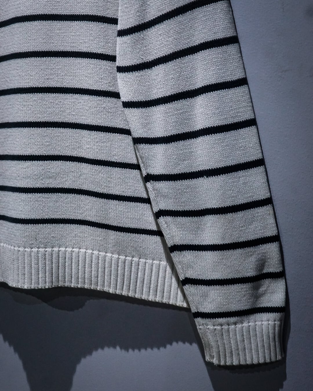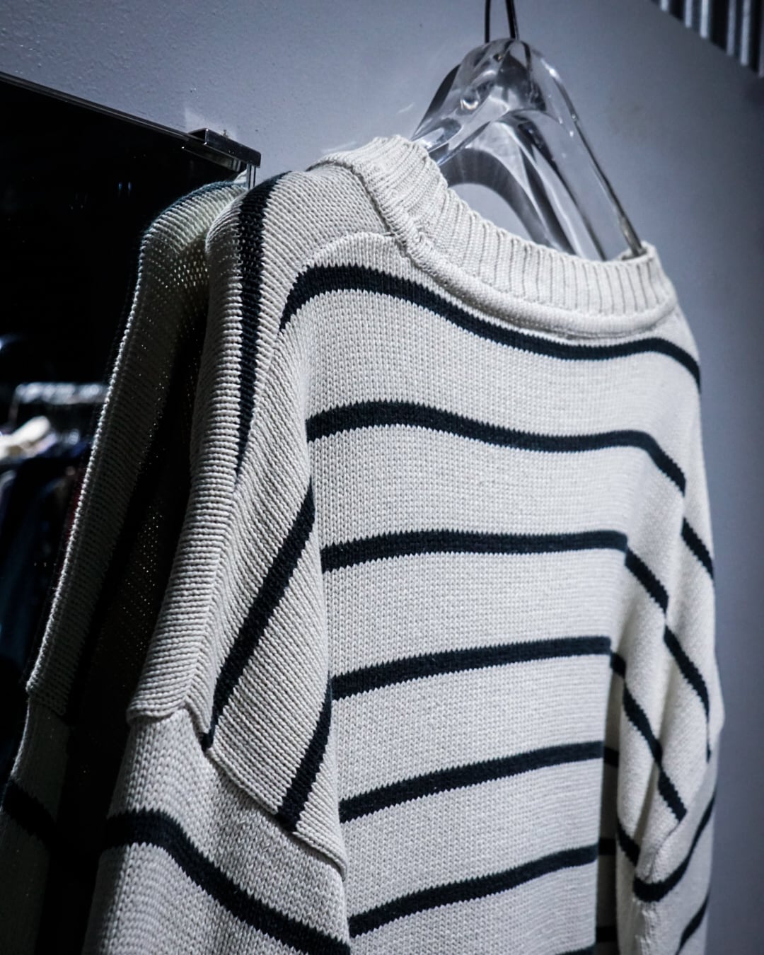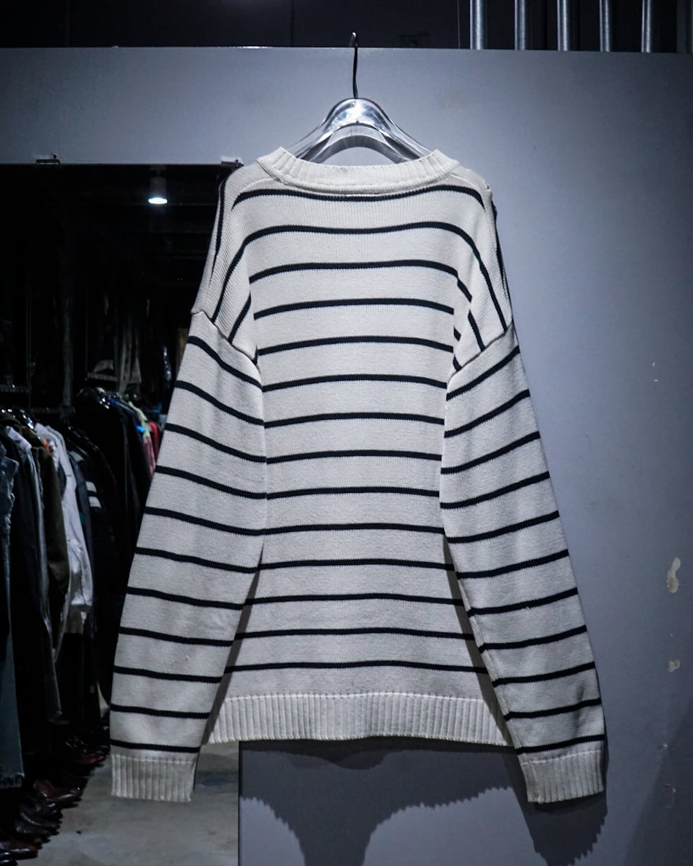 肩部分にはダメージが入り、いわゆる“ちょいボロ”なコンディション。この抜け感が逆にスタイリングに奥行きを生み、クリーンなボーダーに対して程よいラフさをプラスしてくれます。