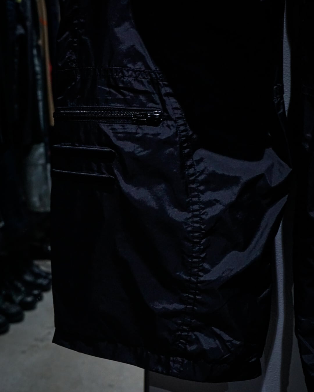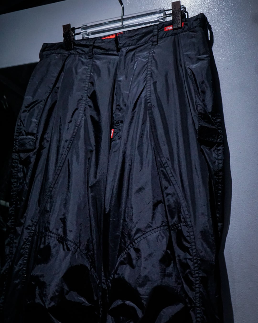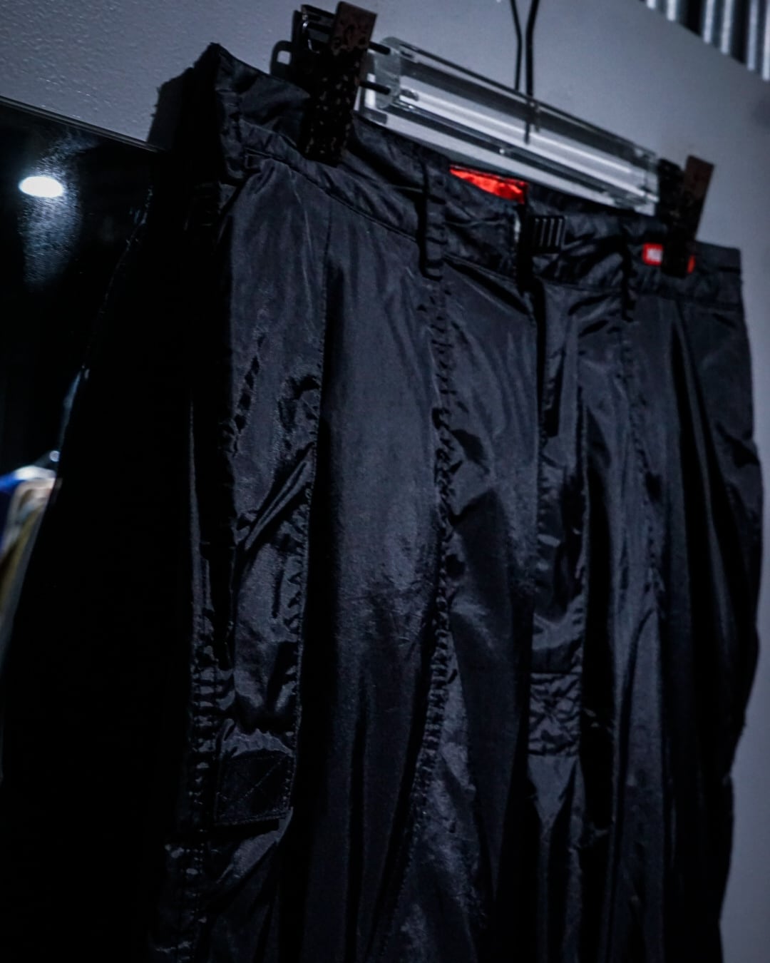 ツルッと滑らかなナイロンのボディに、裾付近のサイドにジップポケットのギミックが施されたナイロンパンツ。