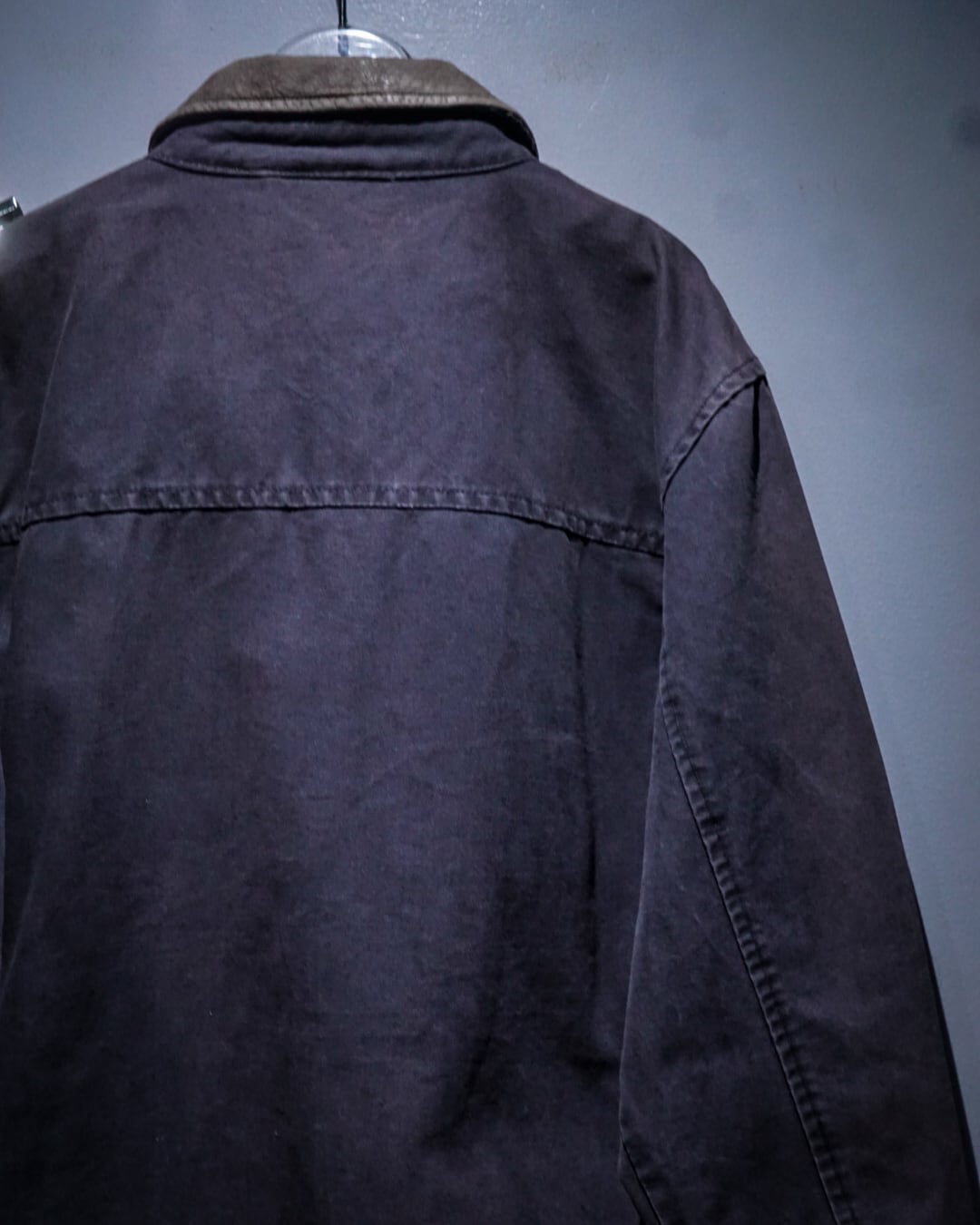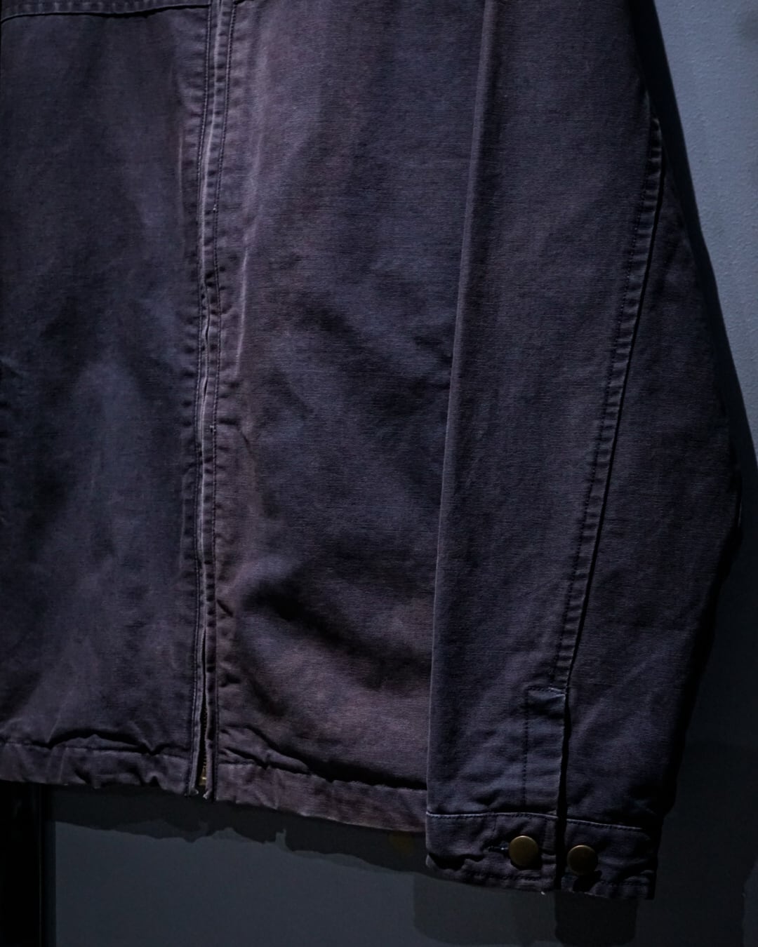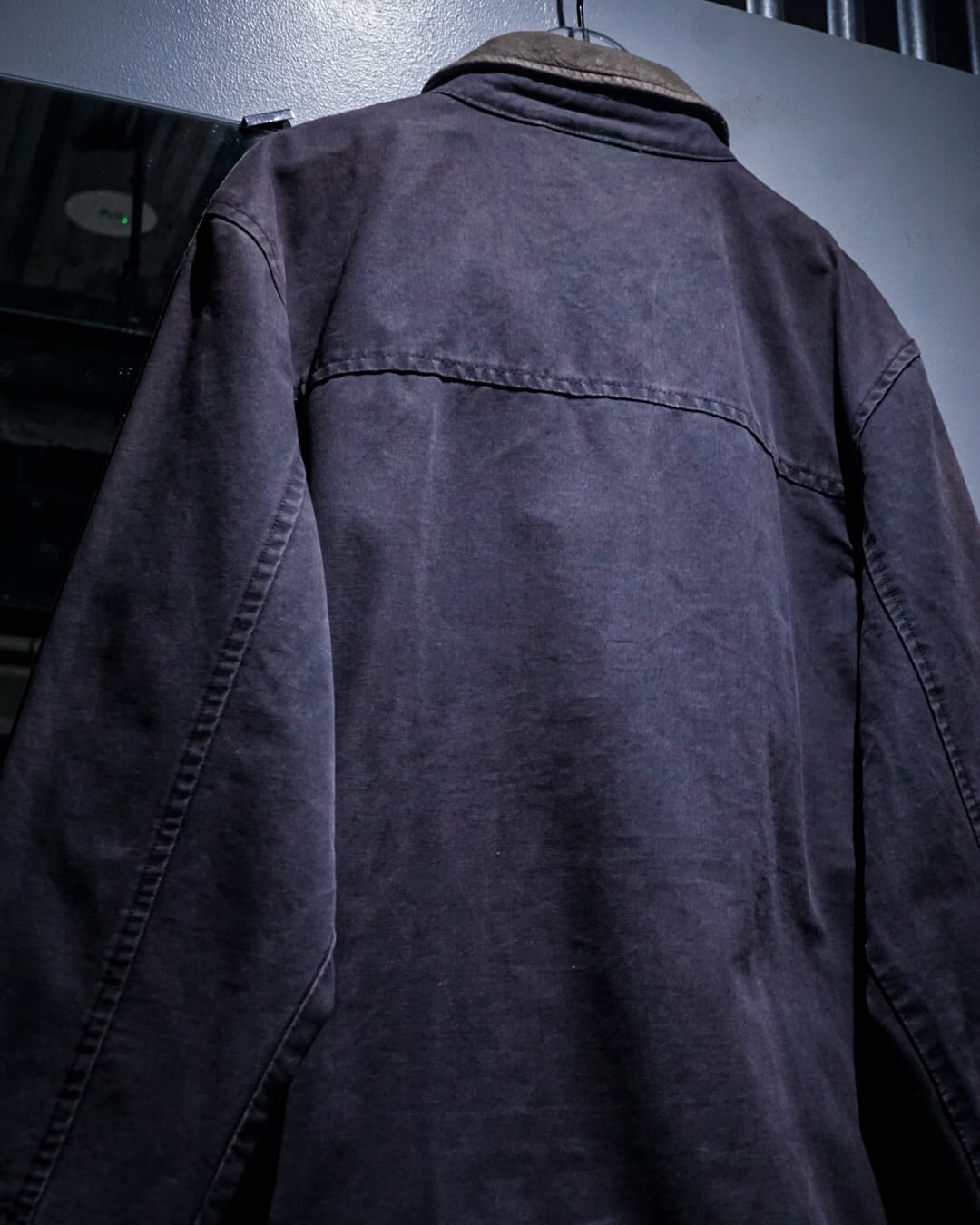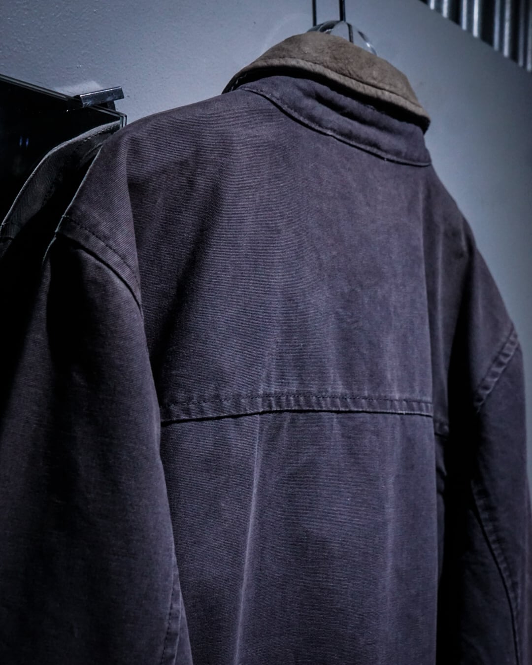 肉厚でタフなダック地をベースに、長年の着用によって生まれたフェード感が圧倒的な存在感を放つ一着。気温や湿度、着用環境といった様々な要因が重なり合って生まれたこの色落ちは、狙って作れるものではない、まさに一点物の表情です。
