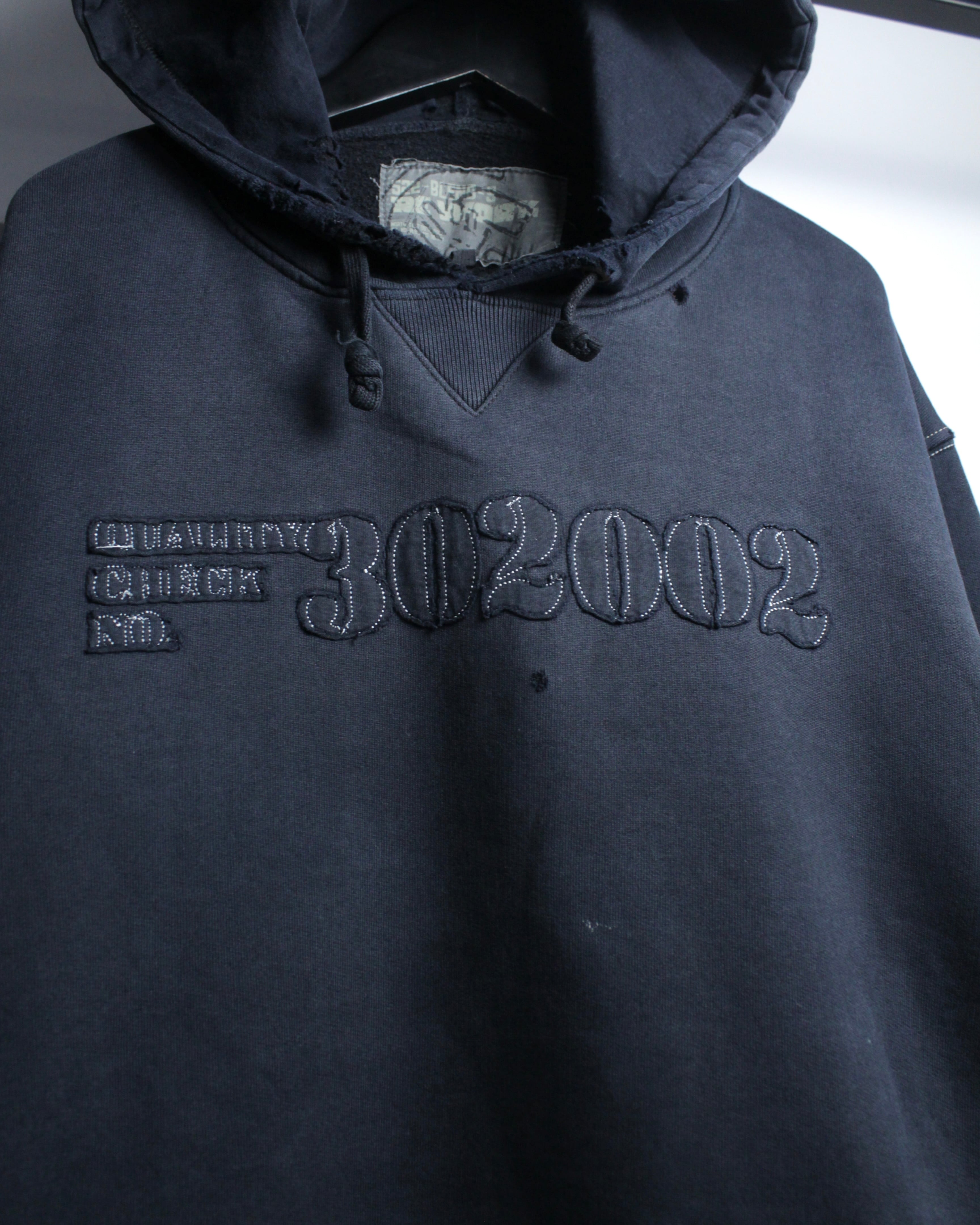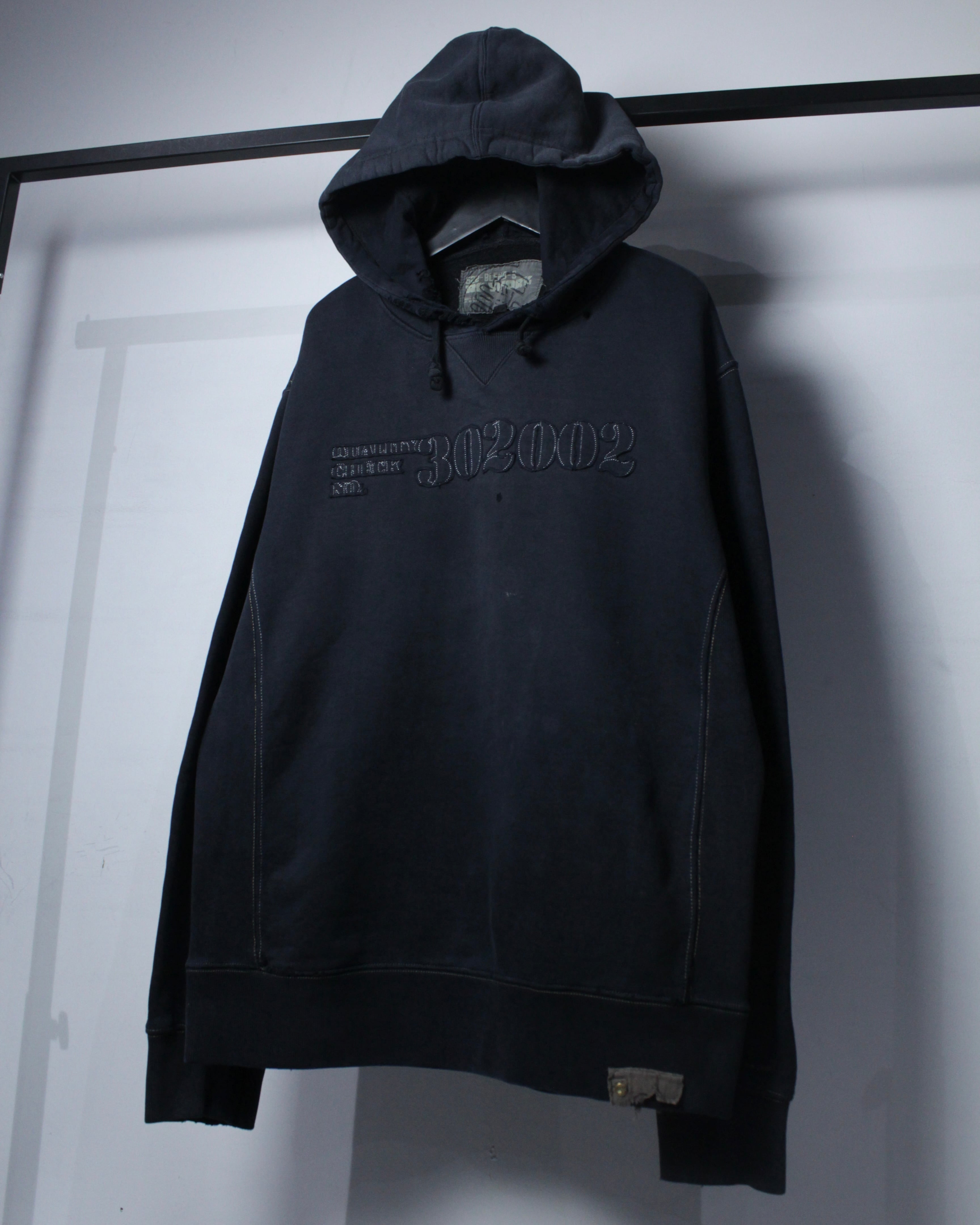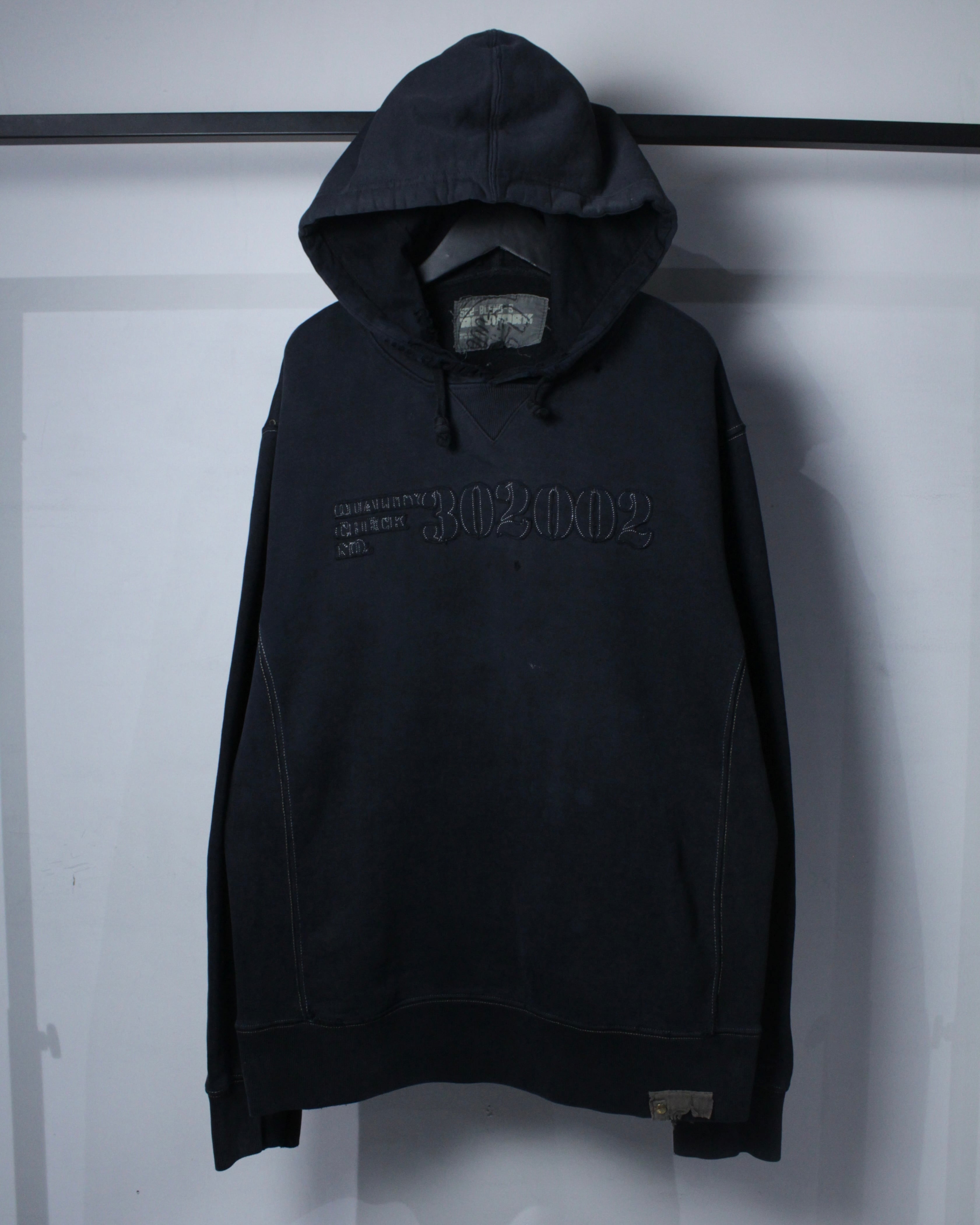 フロントにはカットオフ仕様のロゴパッチを配置。荒々しく断ち切られたディテールがこのアイテムの世界観を象徴し、ボロ感を一層引き立てるアクセントに。フード周りやボディに見られるダメージや擦れも相まって、計算では出せないリアルな雰囲気を演出しています。
