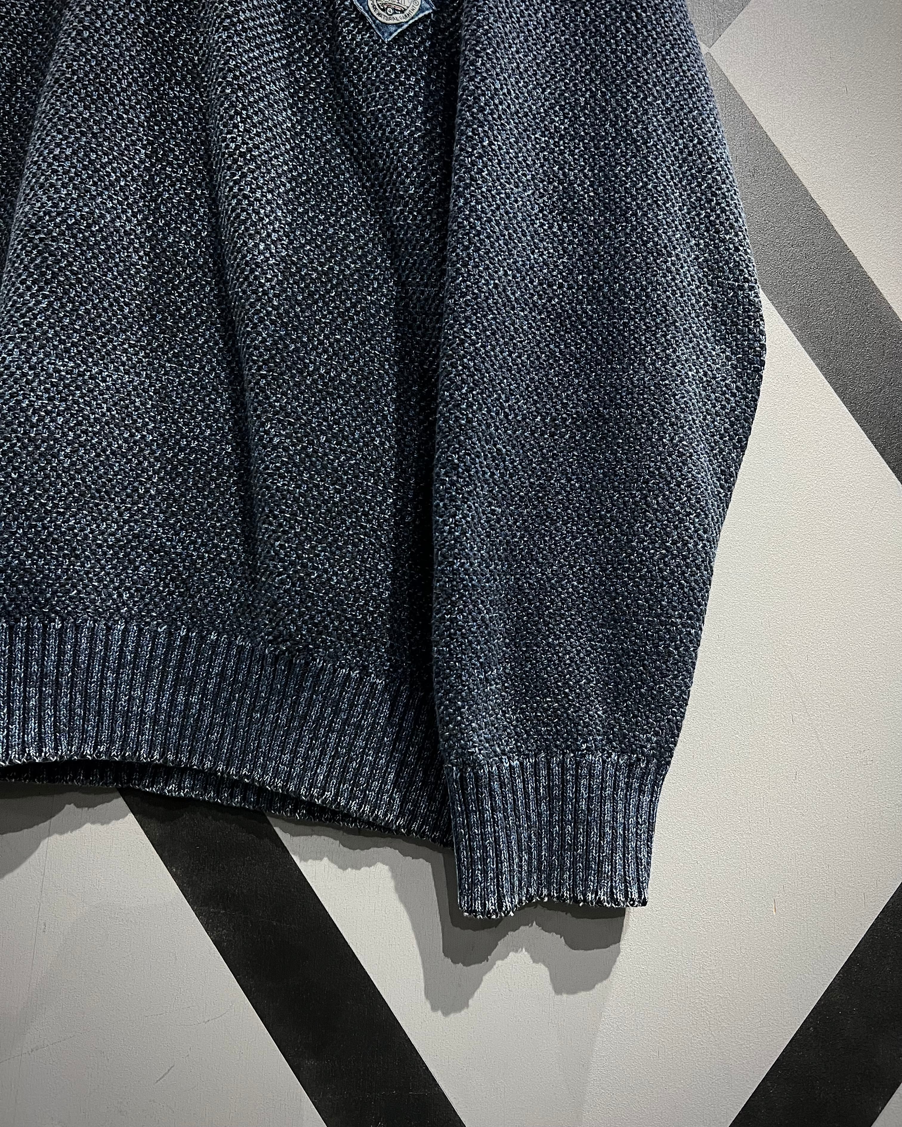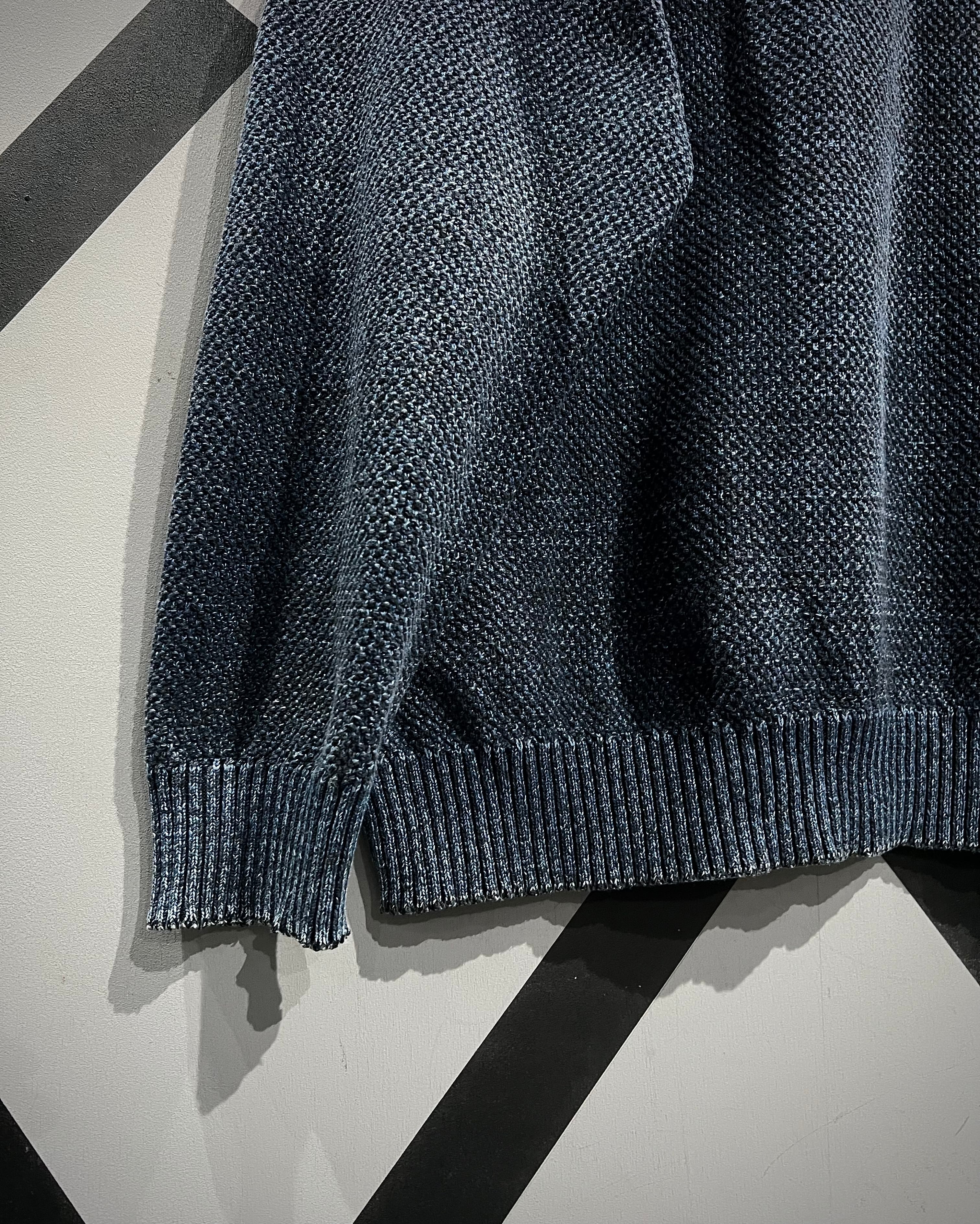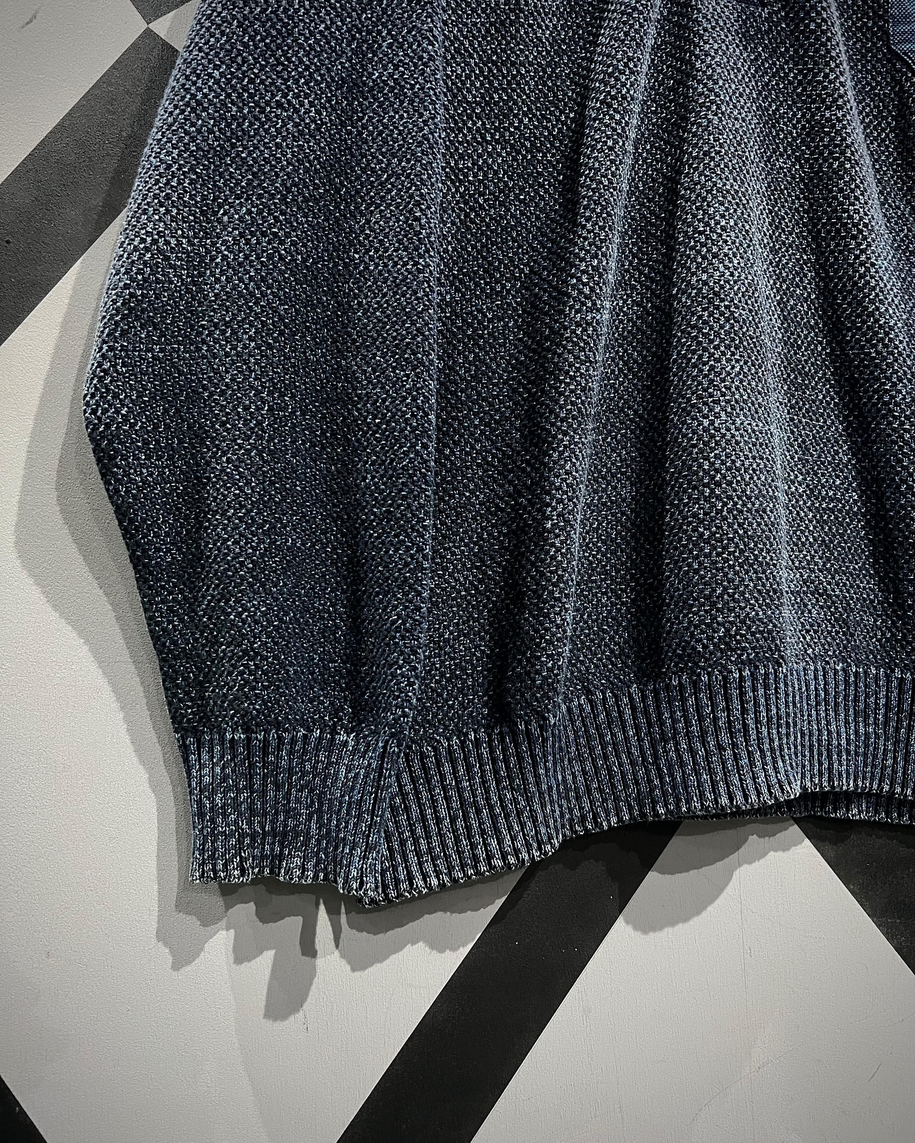 インディゴ染めを施した、荒目のカノコ編みニットの1着。