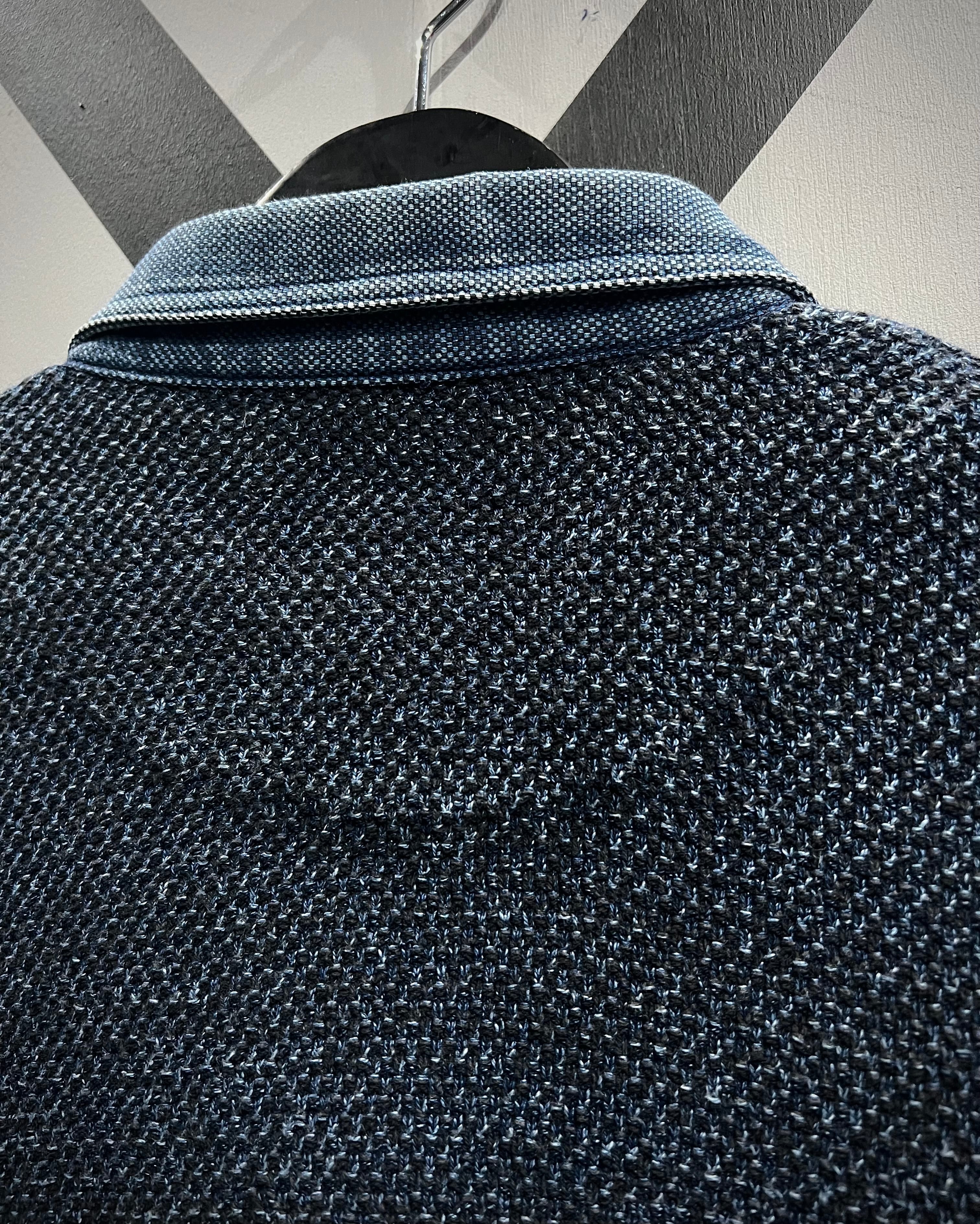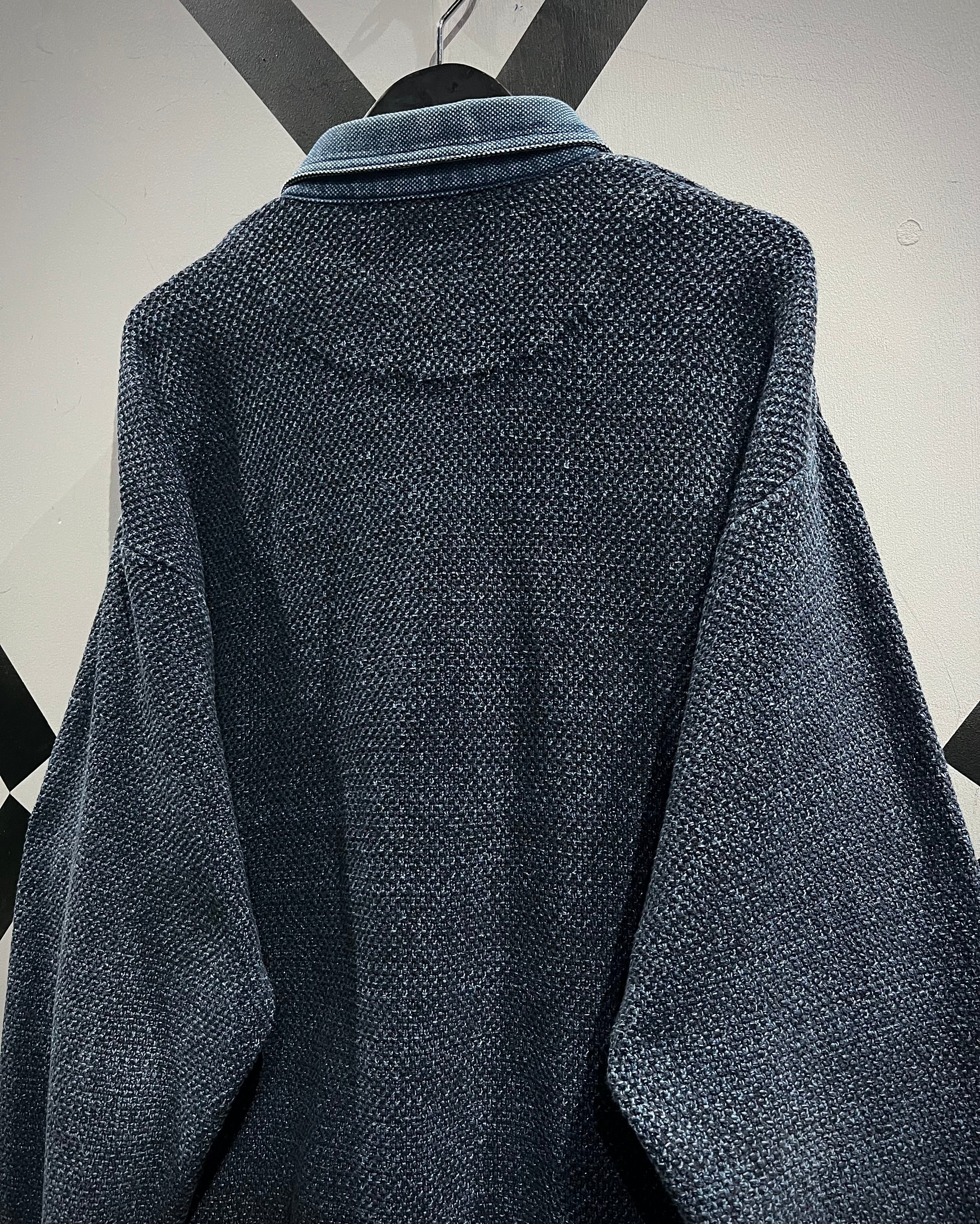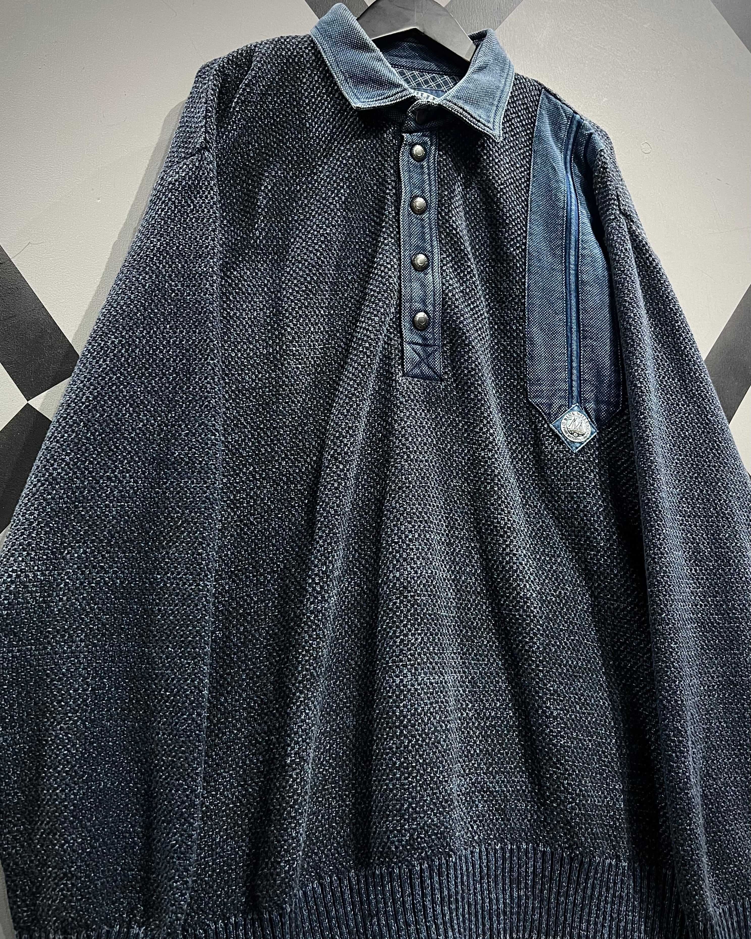 インディゴ染めを施した、荒目のカノコ編みニットの1着。