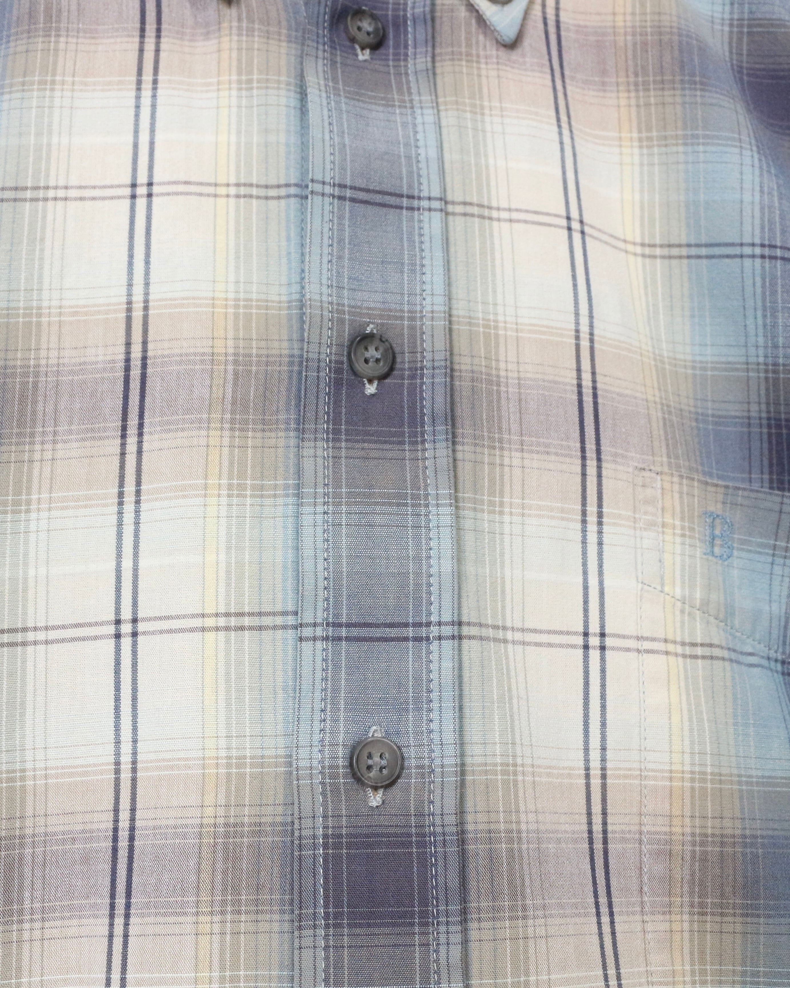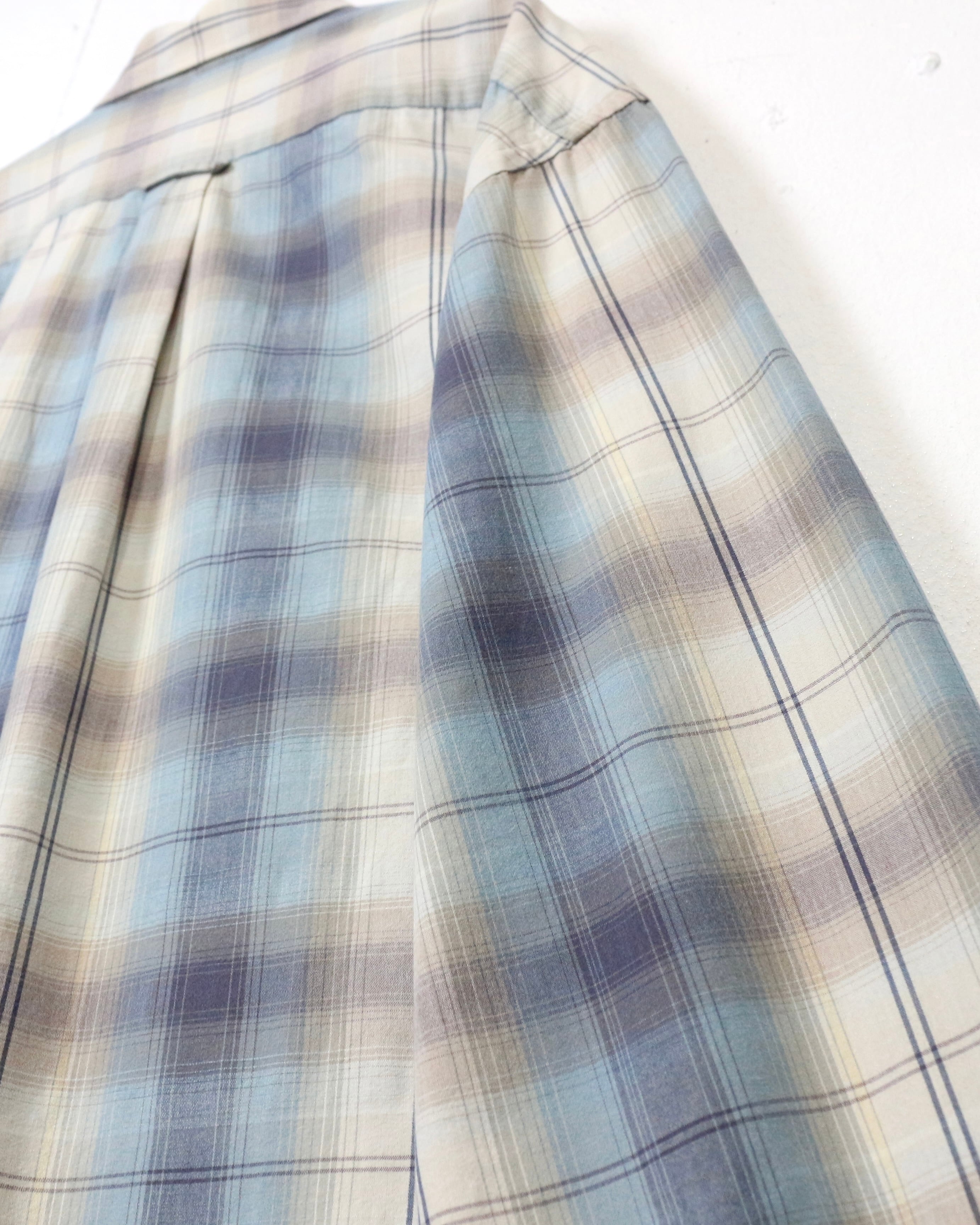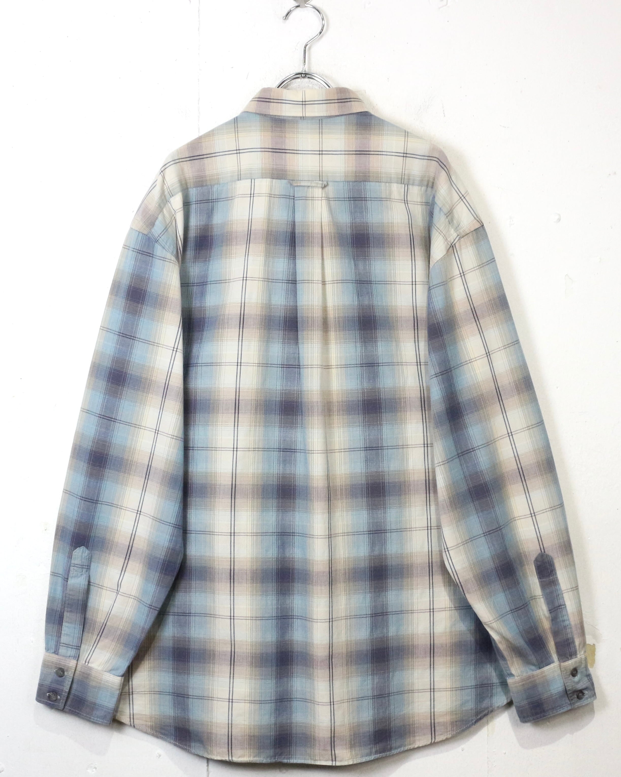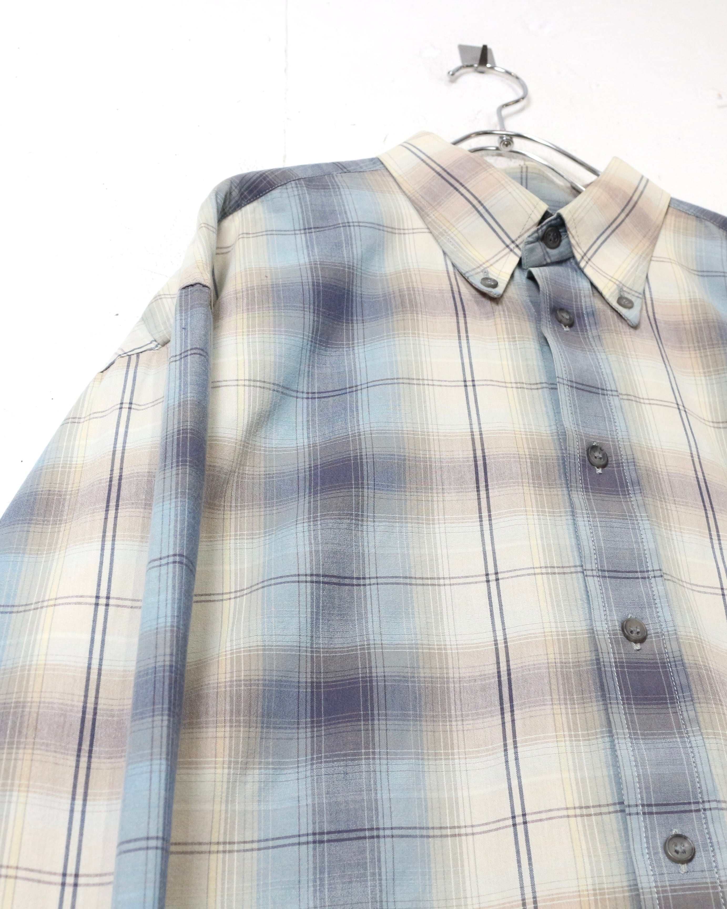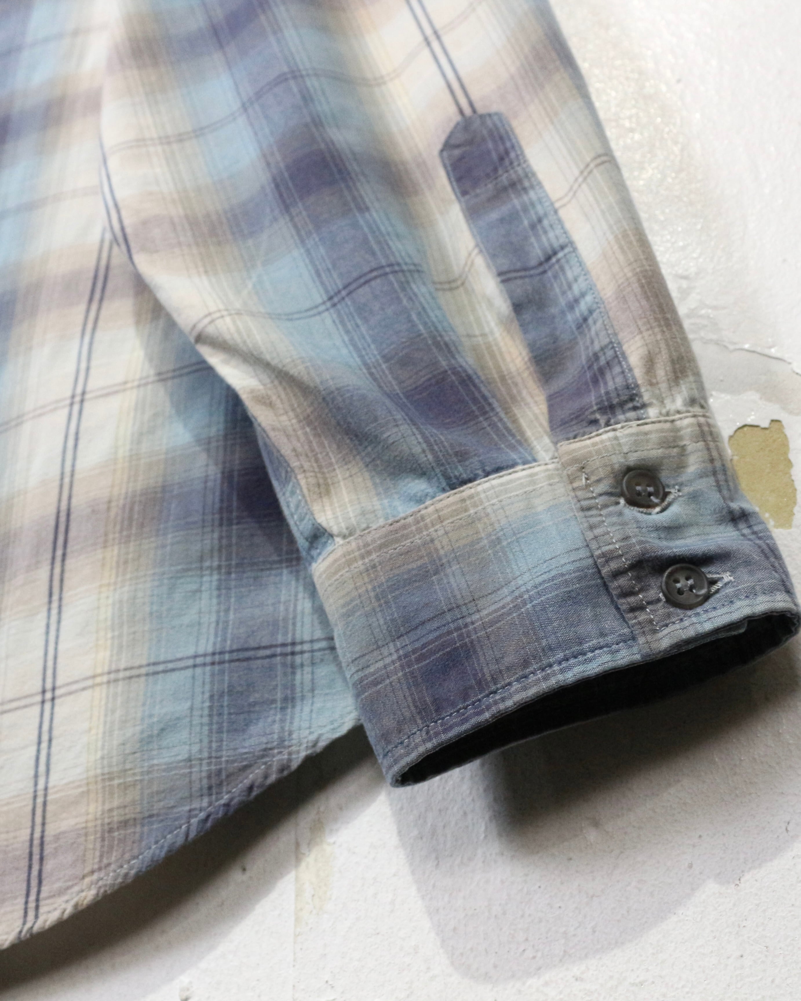 ライトブルー、ベージュ、黄色など柔らかみのあるカラーリングでオンブレチェックを全体に配した長袖シャツ。
