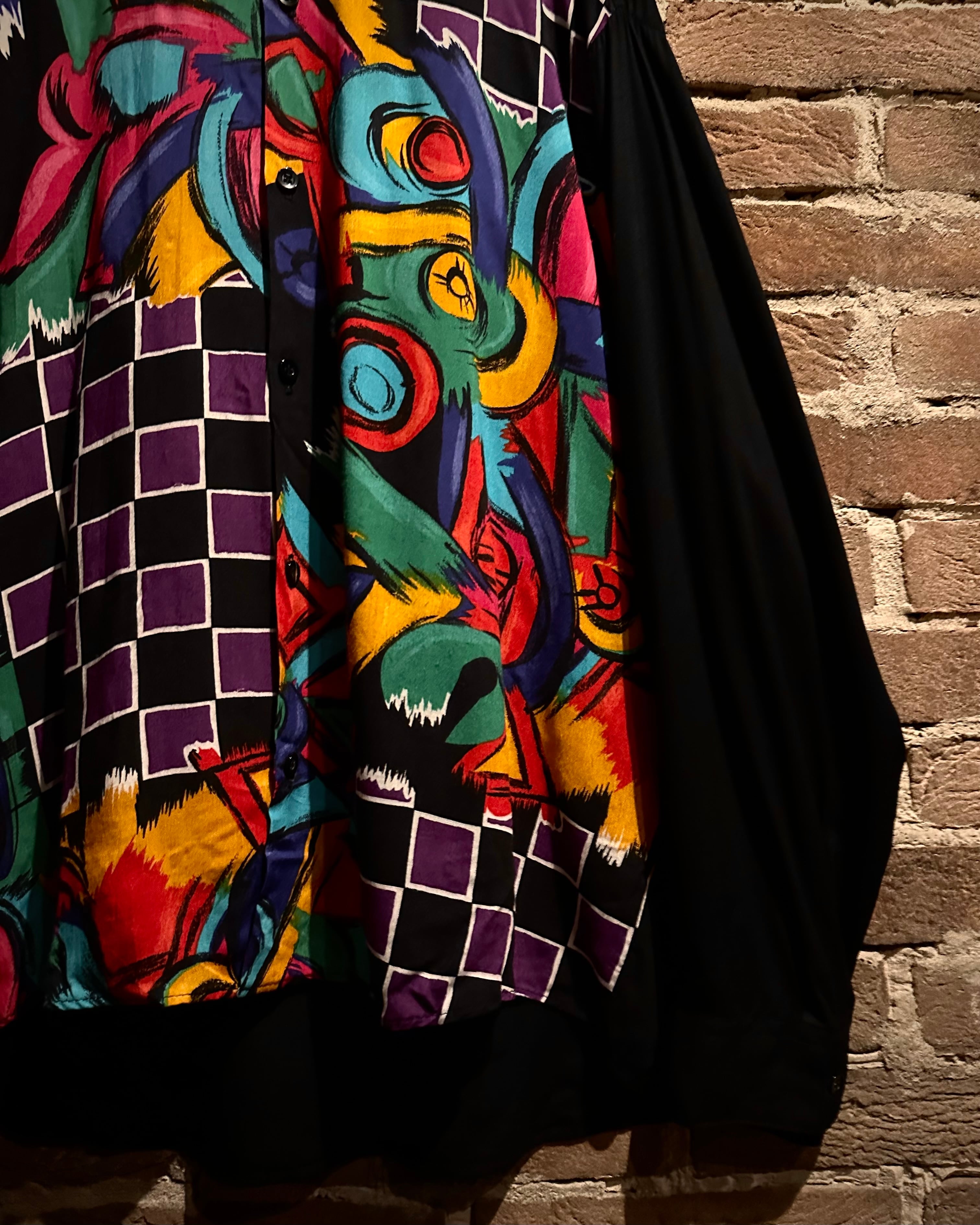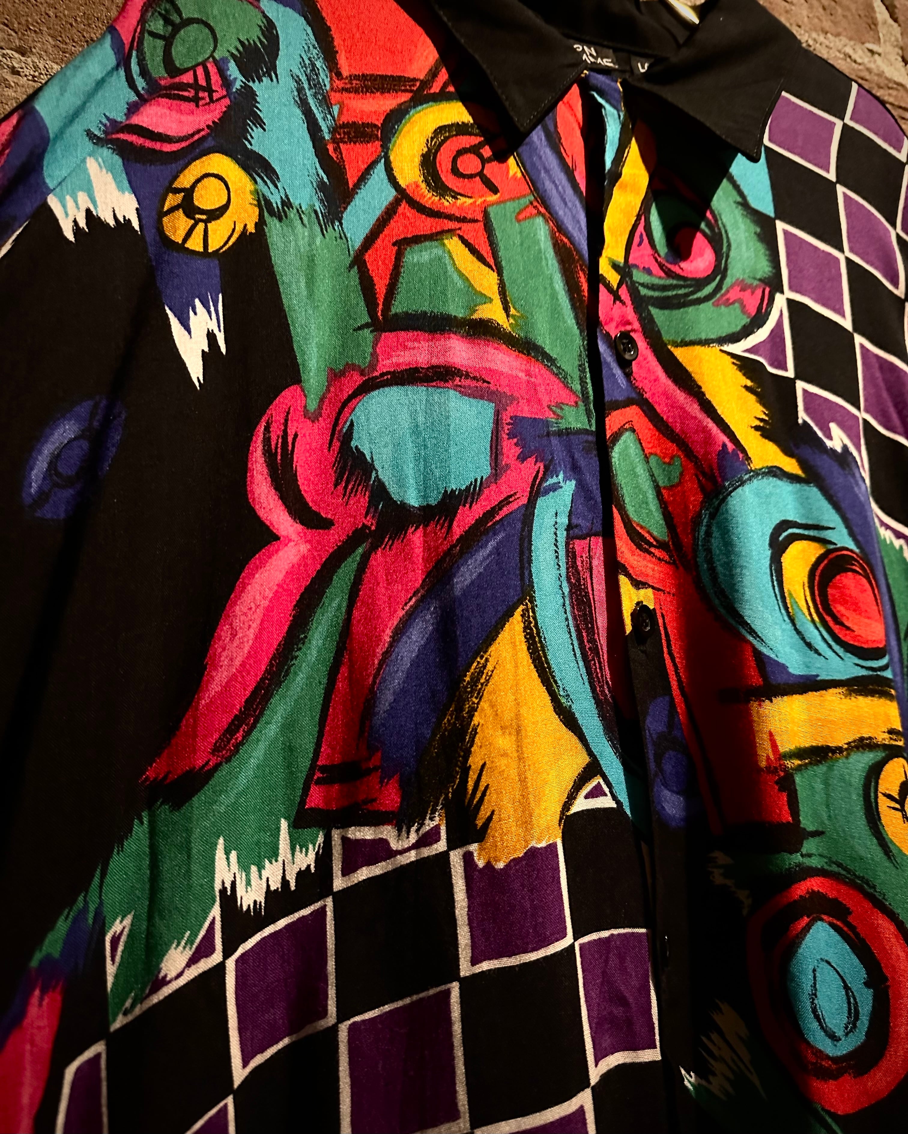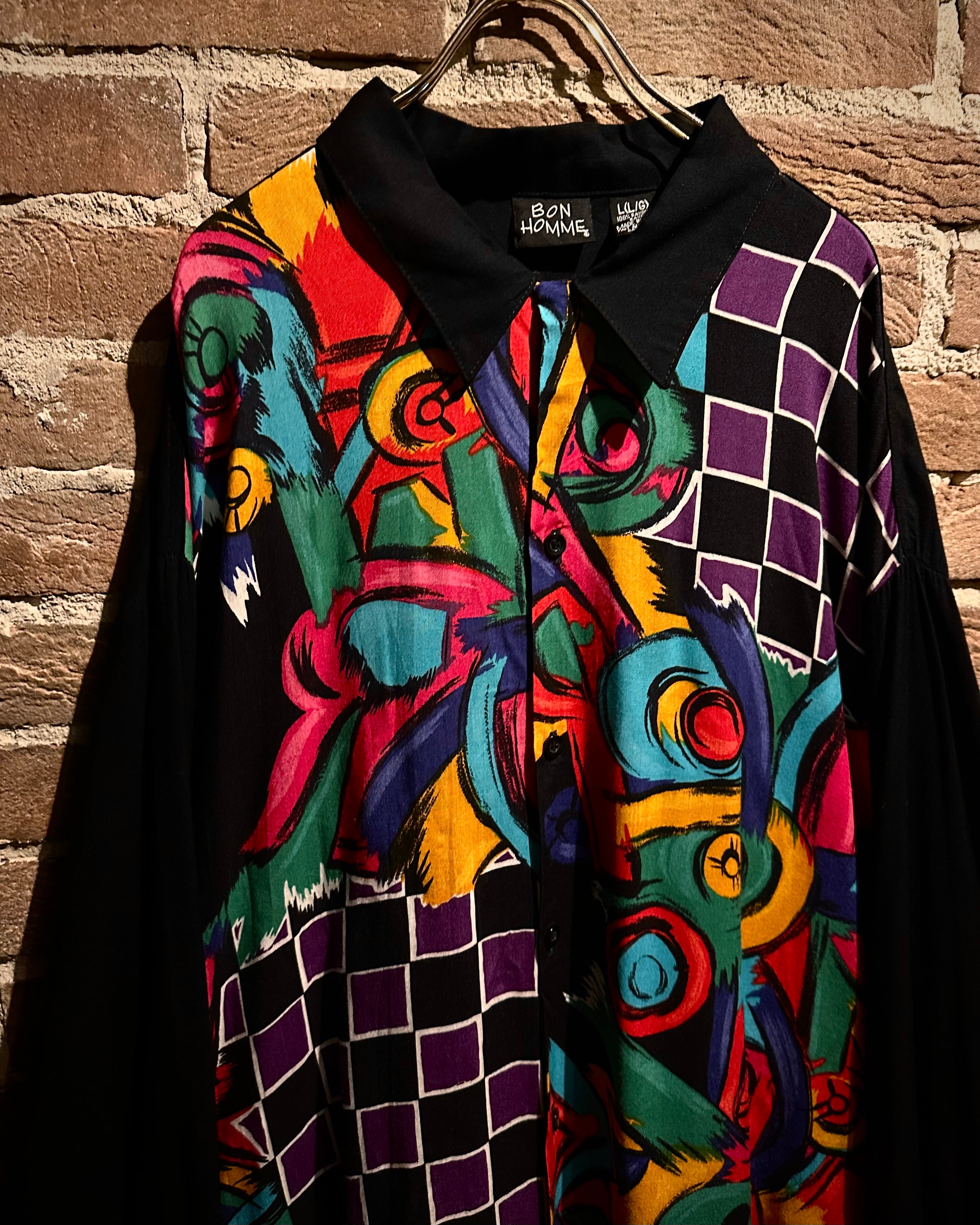 トロみのある、上質なレーヨン素材を用いたボディに、サイケデリックなカラーリングでアート柄を載せた長袖シャツ。