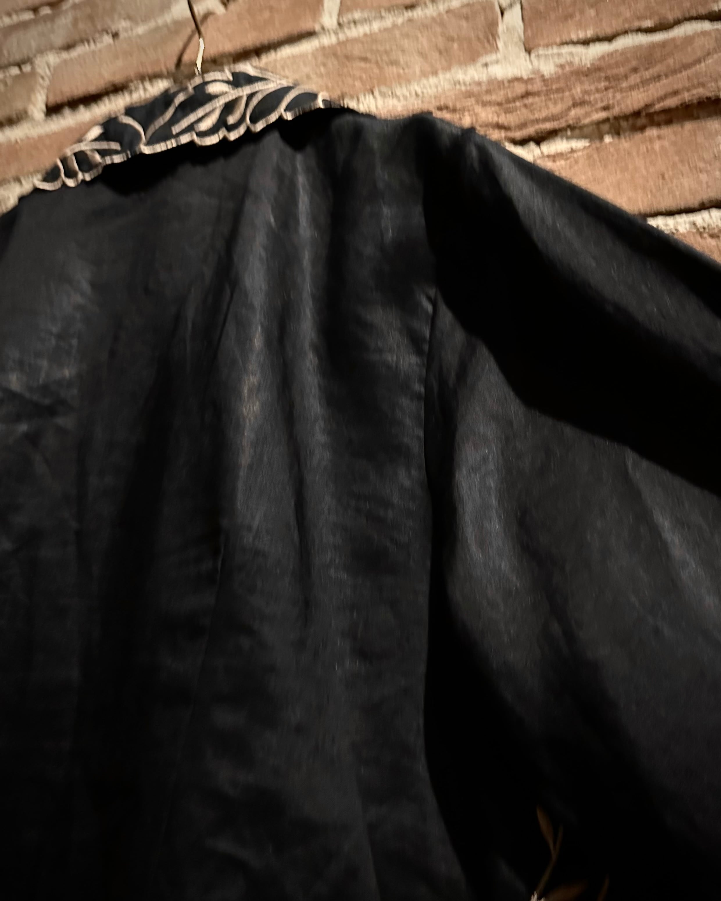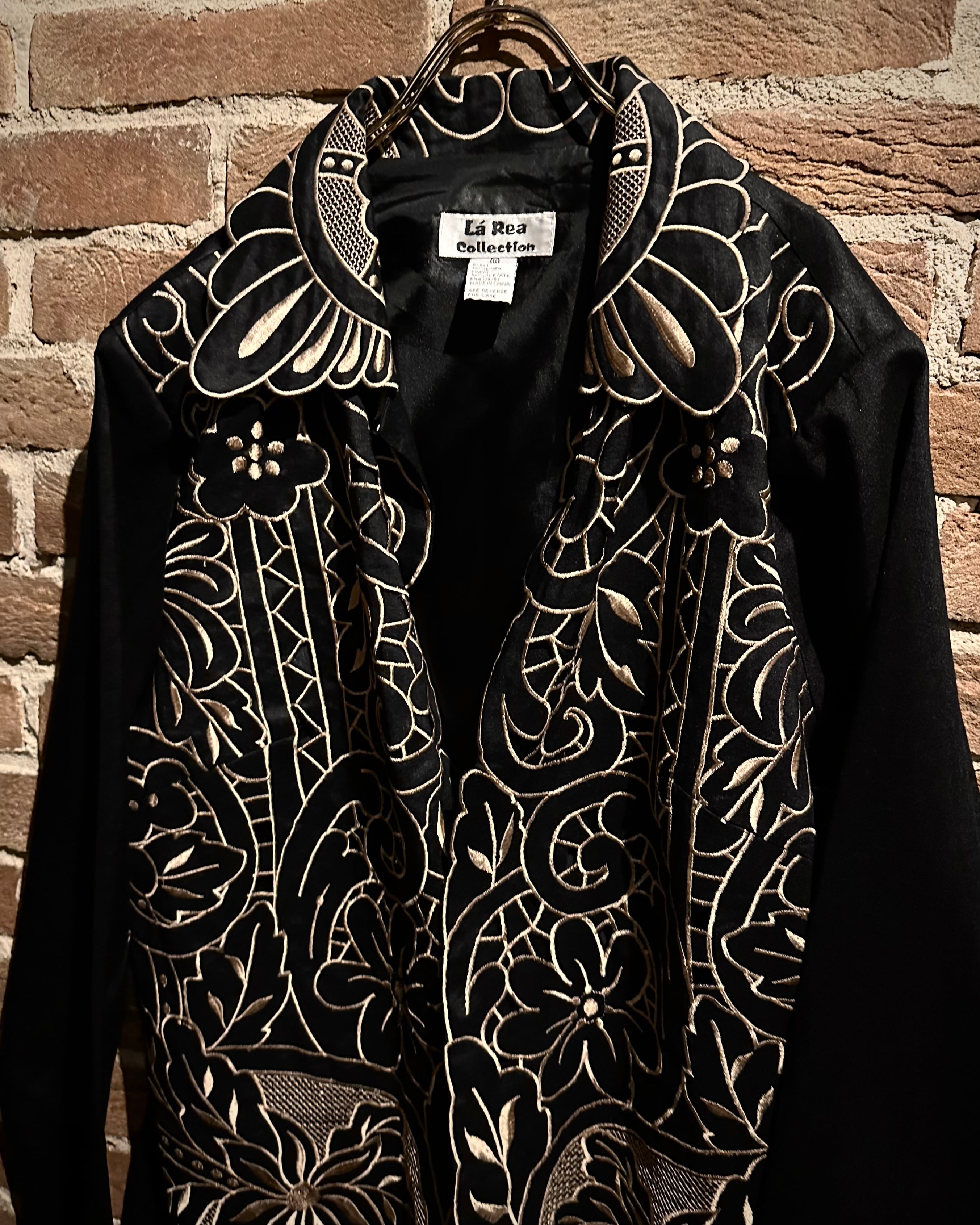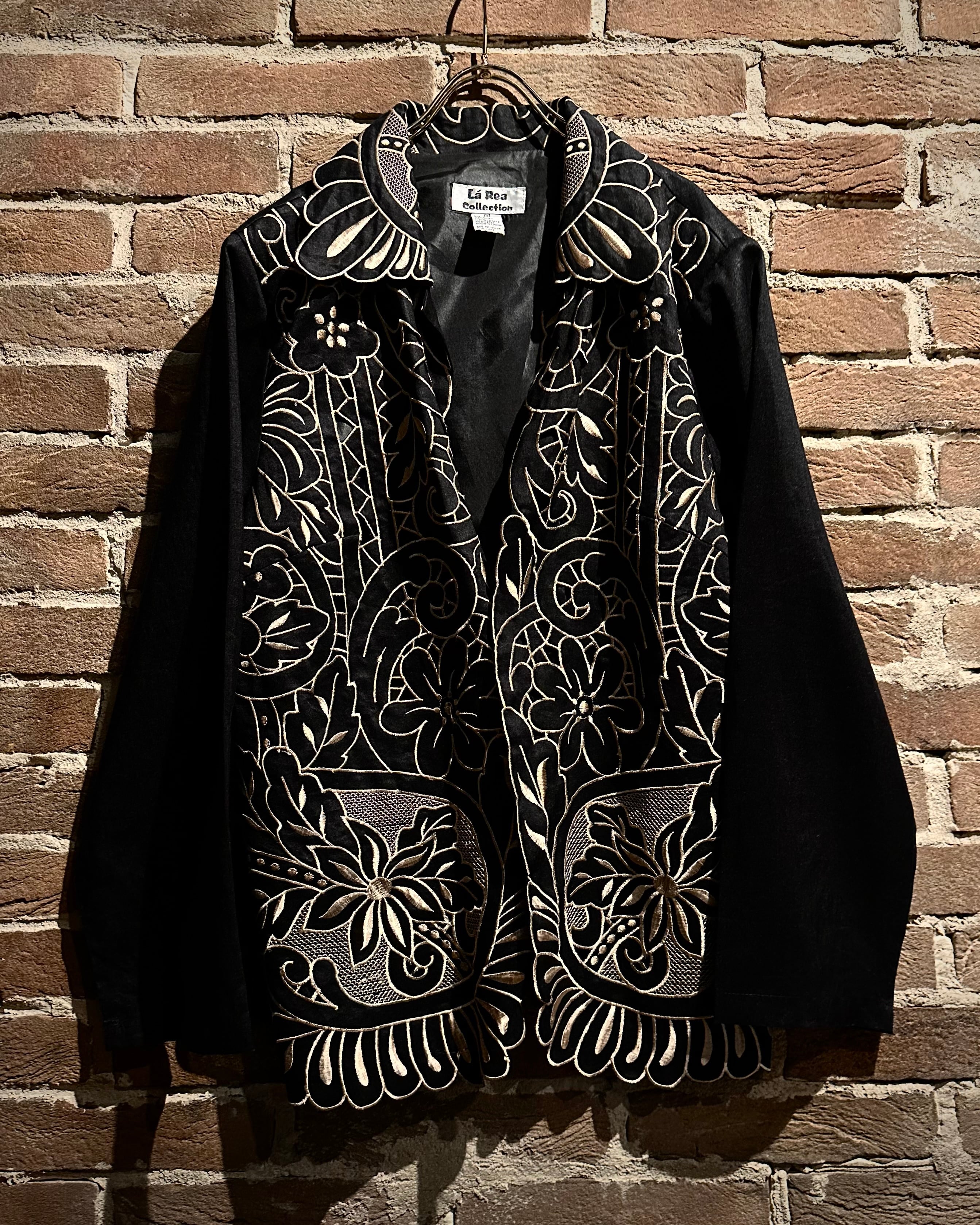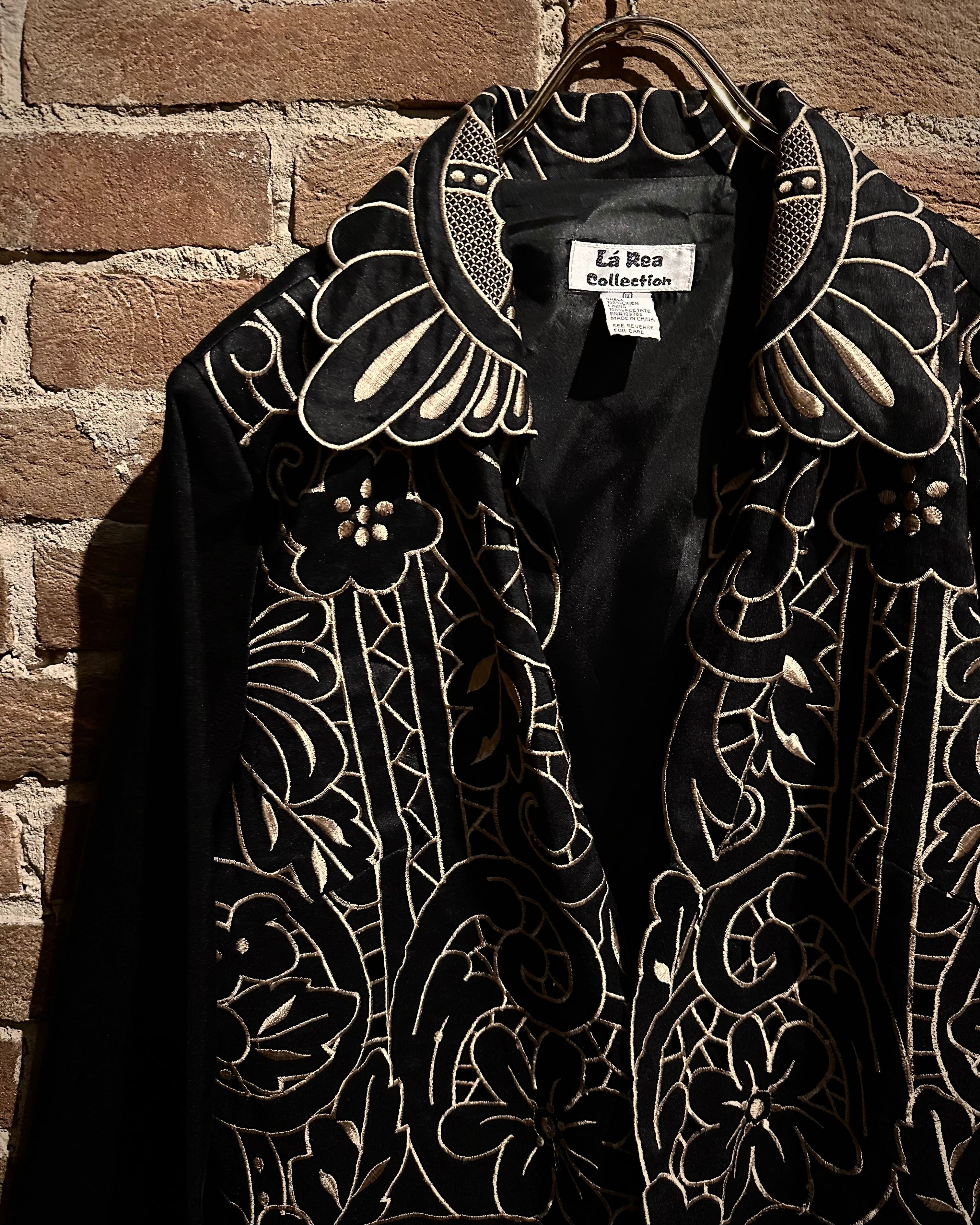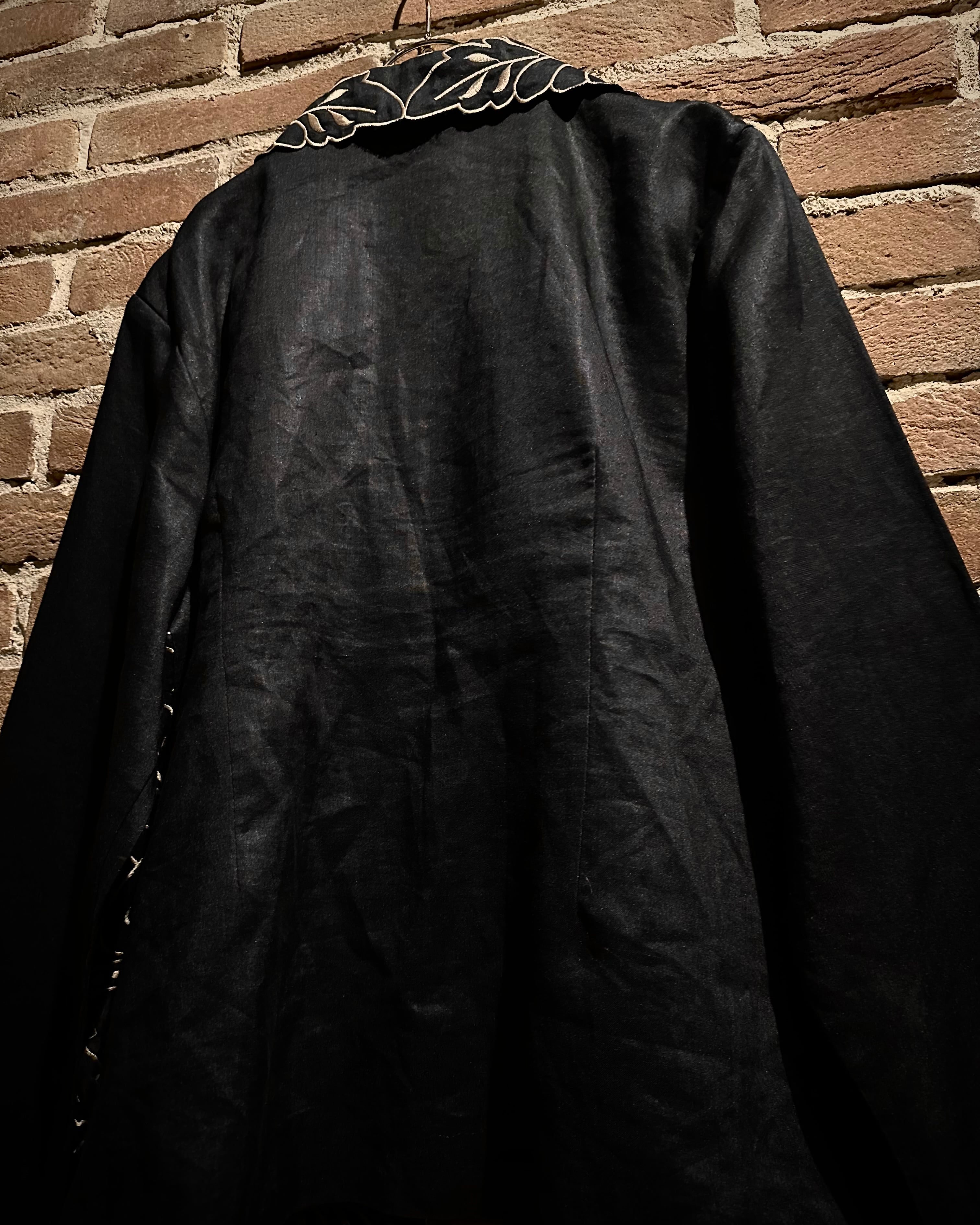 稀少価値の高まるブラックリネンをベースに、襟から身頃にかけて大胆かつ緻密に走る花のー刺繍が圧倒的な存在感を放つ羽織ジャケット。