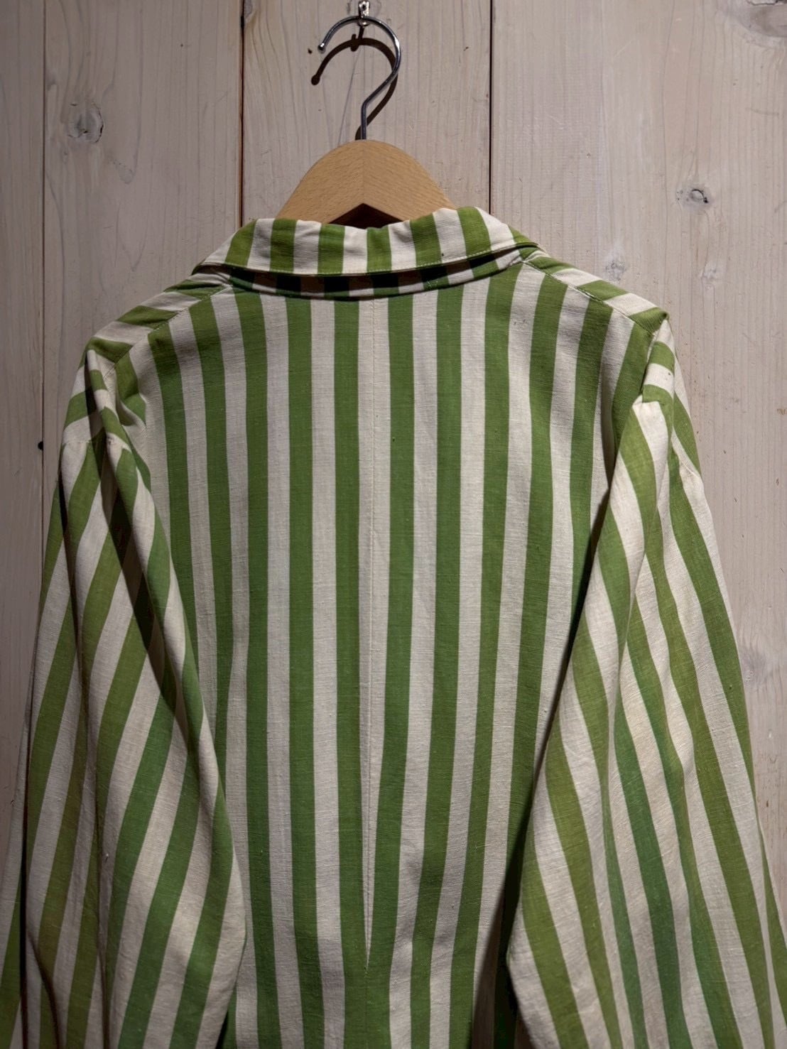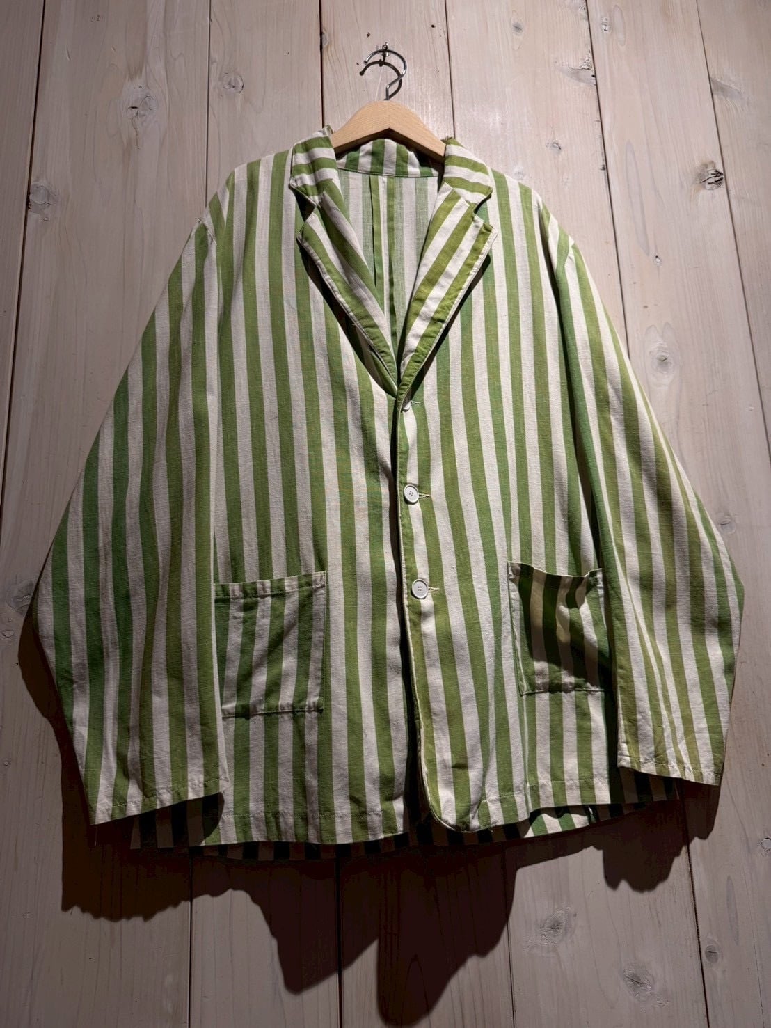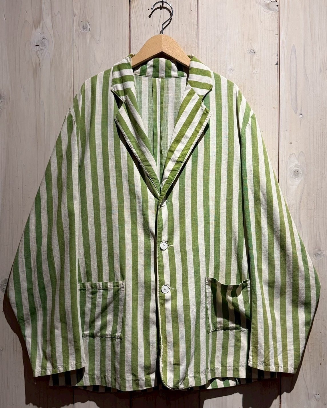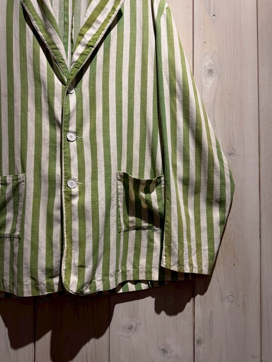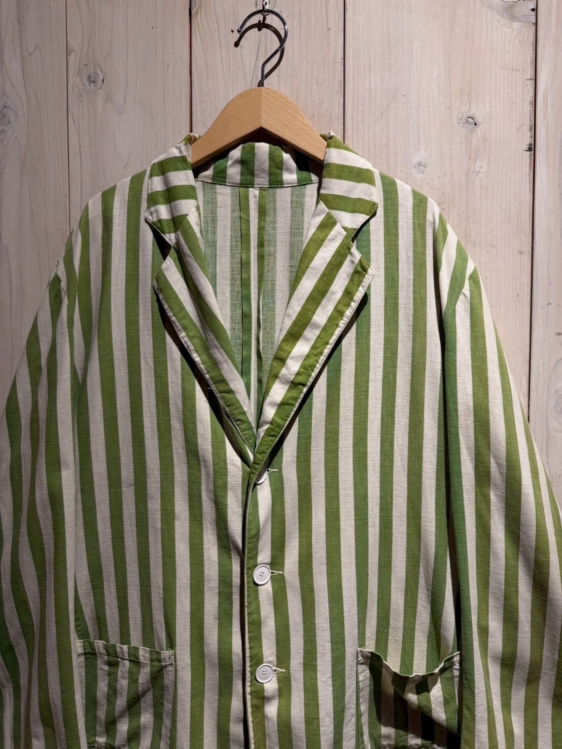 当時のサーカス団で団長が着ていたとされるこちらのジャケット。市場では赤×白のストライプが見られますが、今回ご紹介するのは非常〜に希少な緑×白とレアカラーの1着。