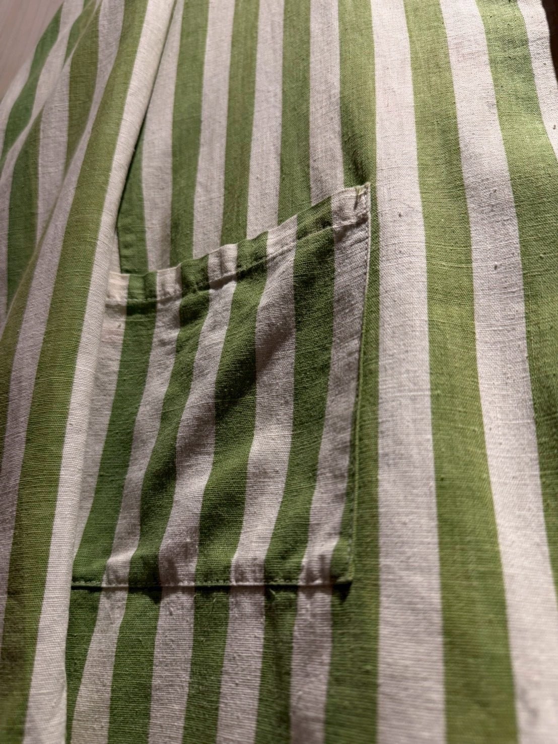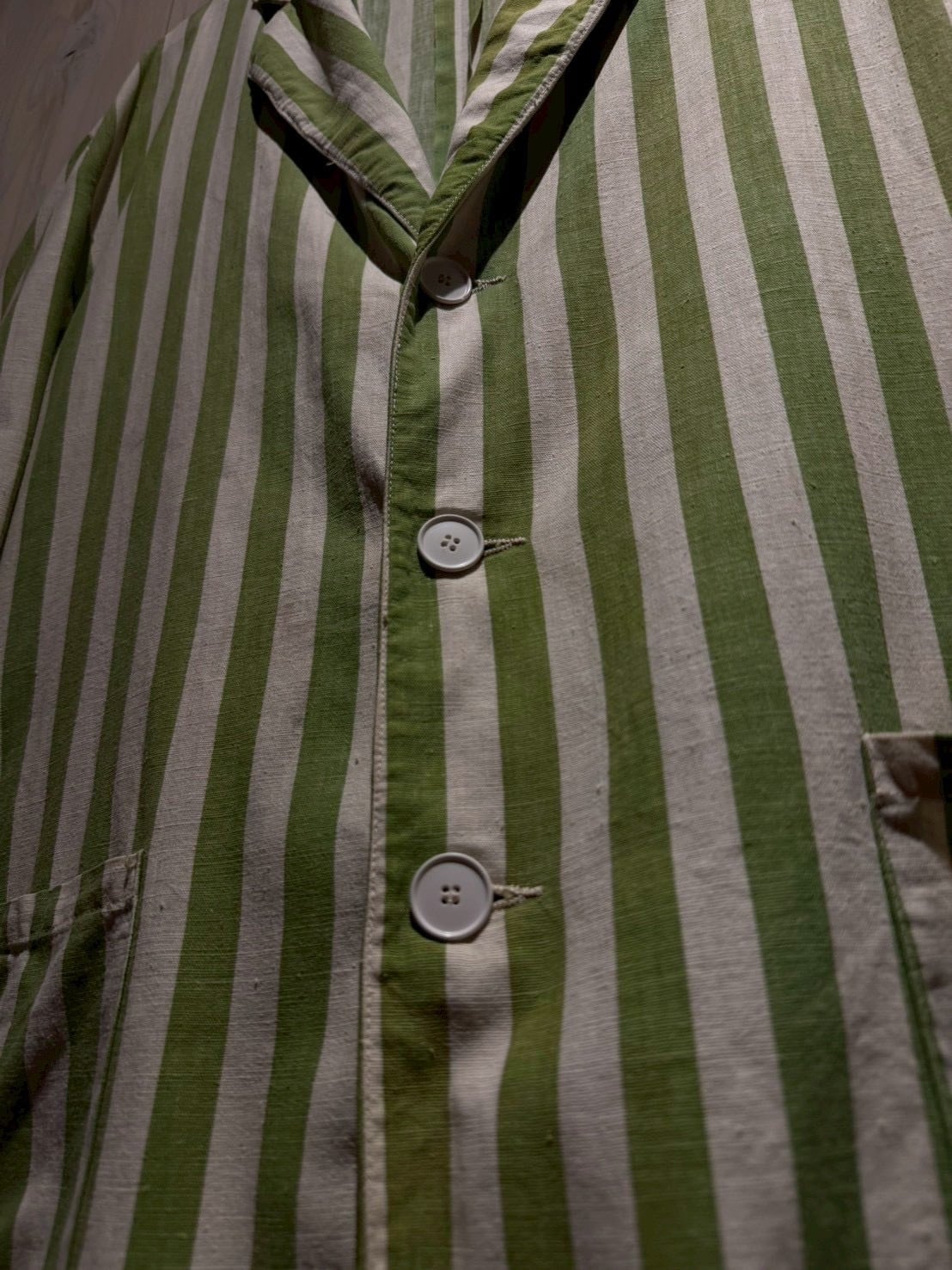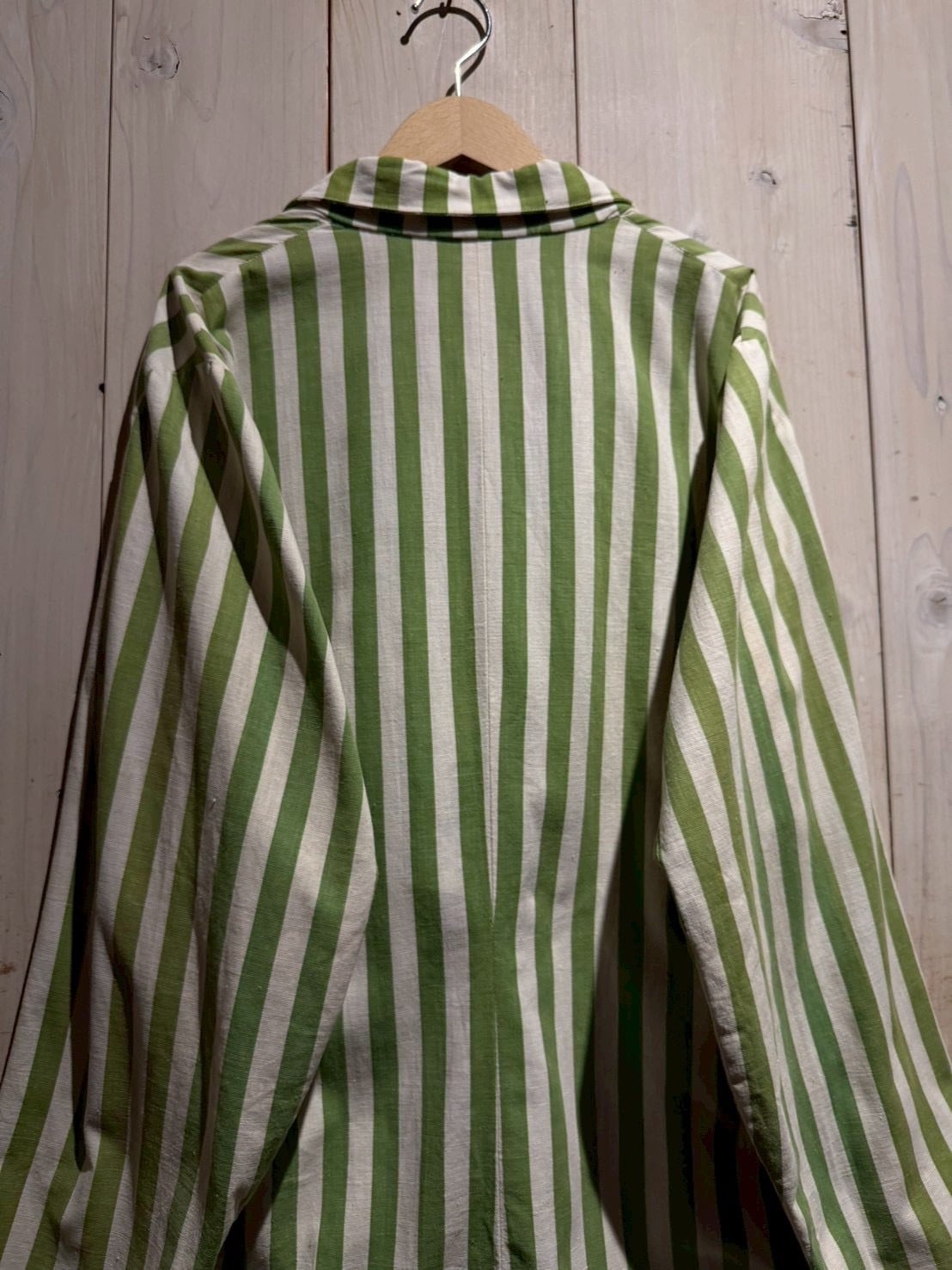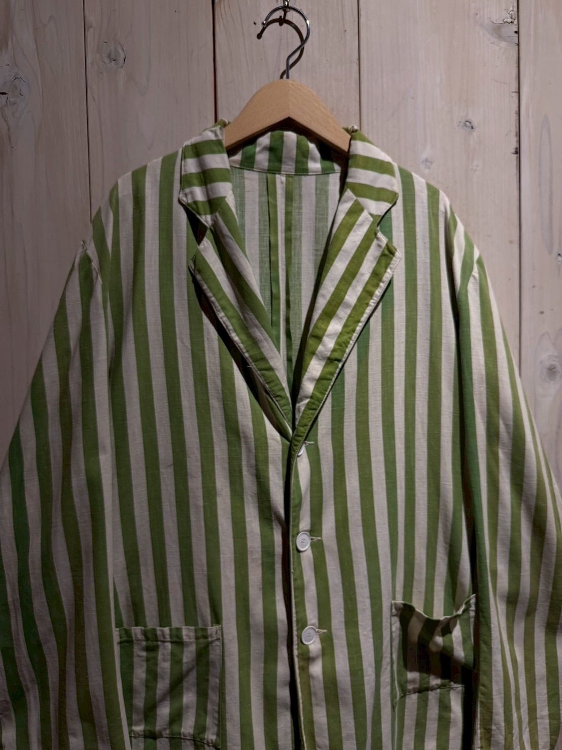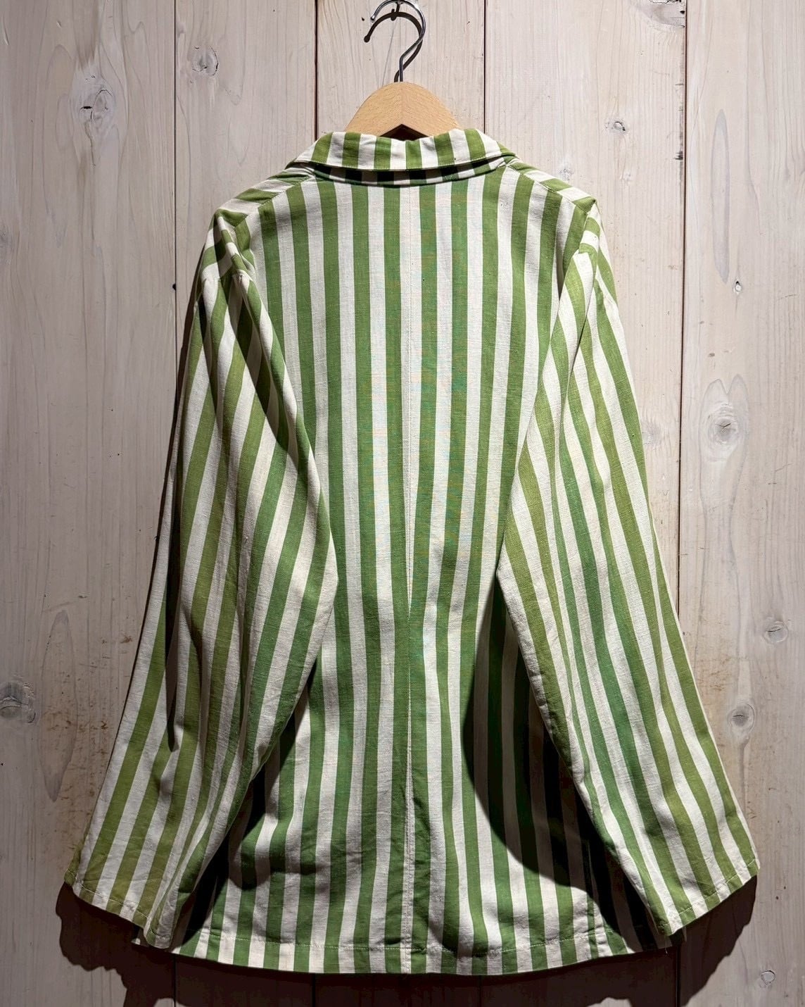 当時のサーカス団で団長が着ていたとされるこちらのジャケット。市場では赤×白のストライプが見られますが、今回ご紹介するのは非常〜に希少な緑×白とレアカラーの1着。